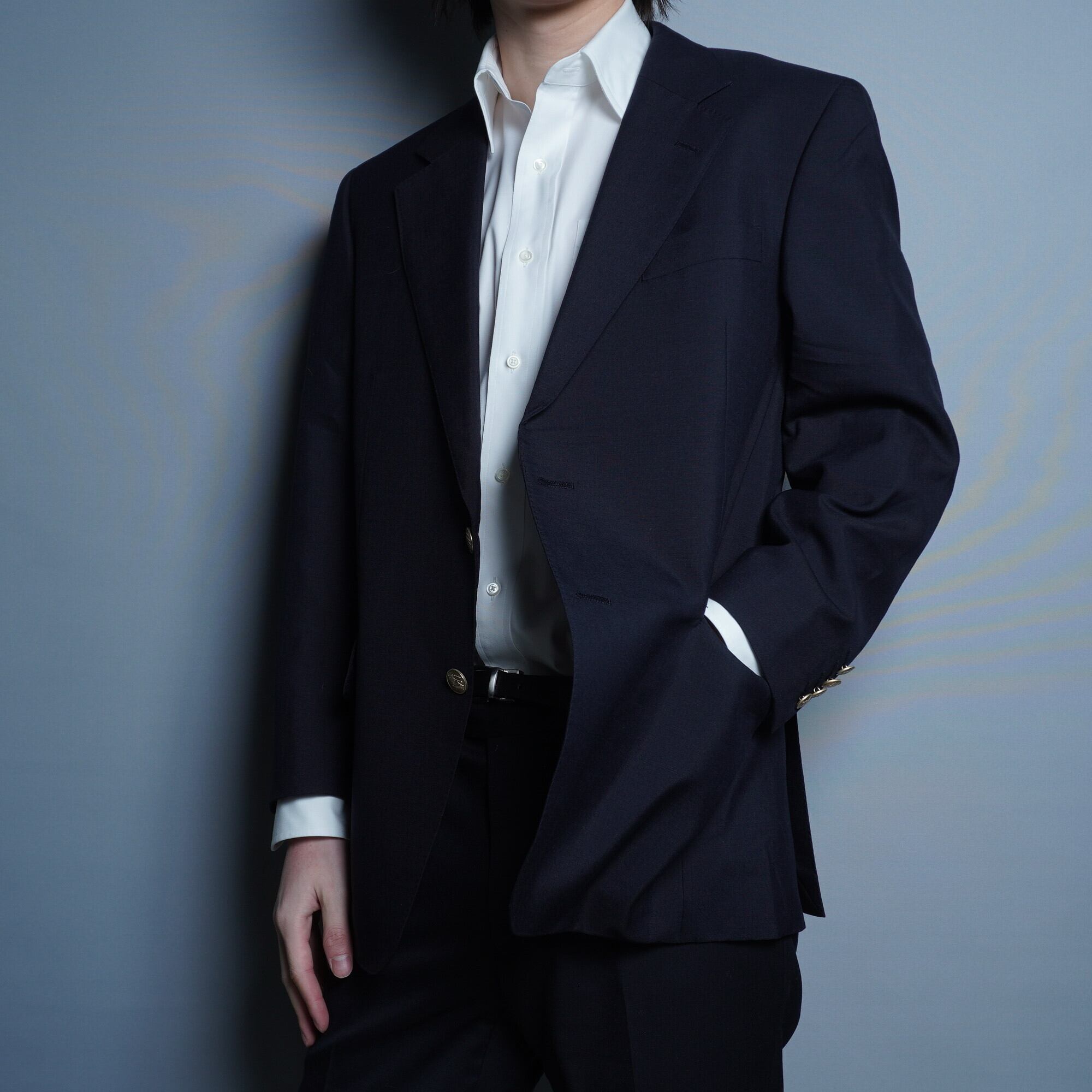 いわゆる紺ブレと言われるジャケットで、バーバリーのロゴが入った金色のボタンが目を惹きます。モヘアが混ざっていることで手触りや高級感がコットンのみのものと目に見えて違う、スペシャルなアイテムとなっています。