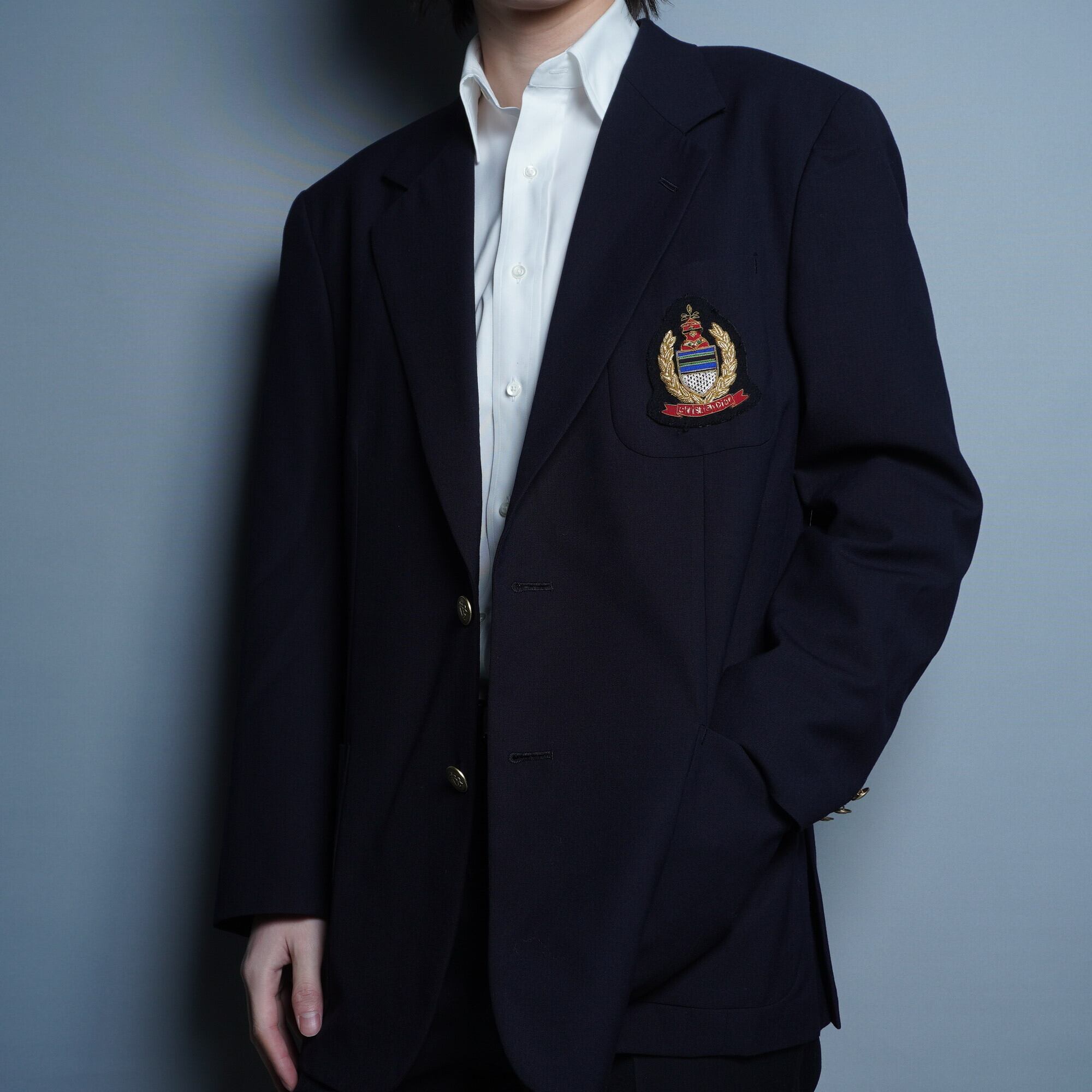 【ChristianDior】クリスチャンディオールウール 100%ワッペン付き 刻印入り金ボタン 2B シングル紺ブレザー navy