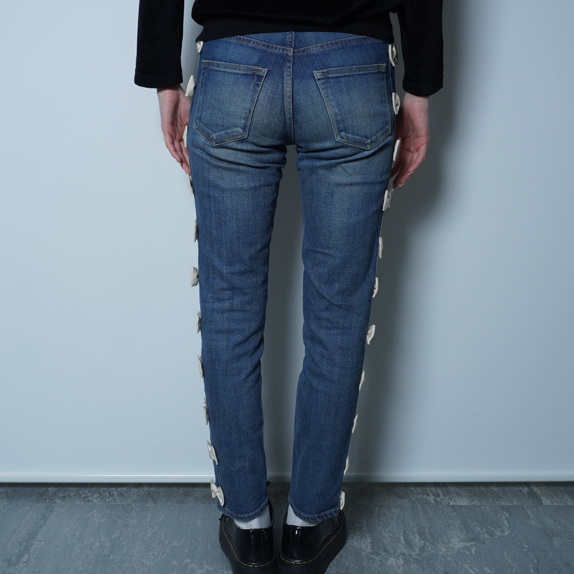 サイドに施された繊細なリボン装飾が特徴的な、フェミニンなスキニーデニムです。美しいブルーの色合いと、脚のラインを綺麗に見せるシルエットが魅力。カジュアルながらも上品さを兼ね備え、幅広いコーディネートにマッチします。