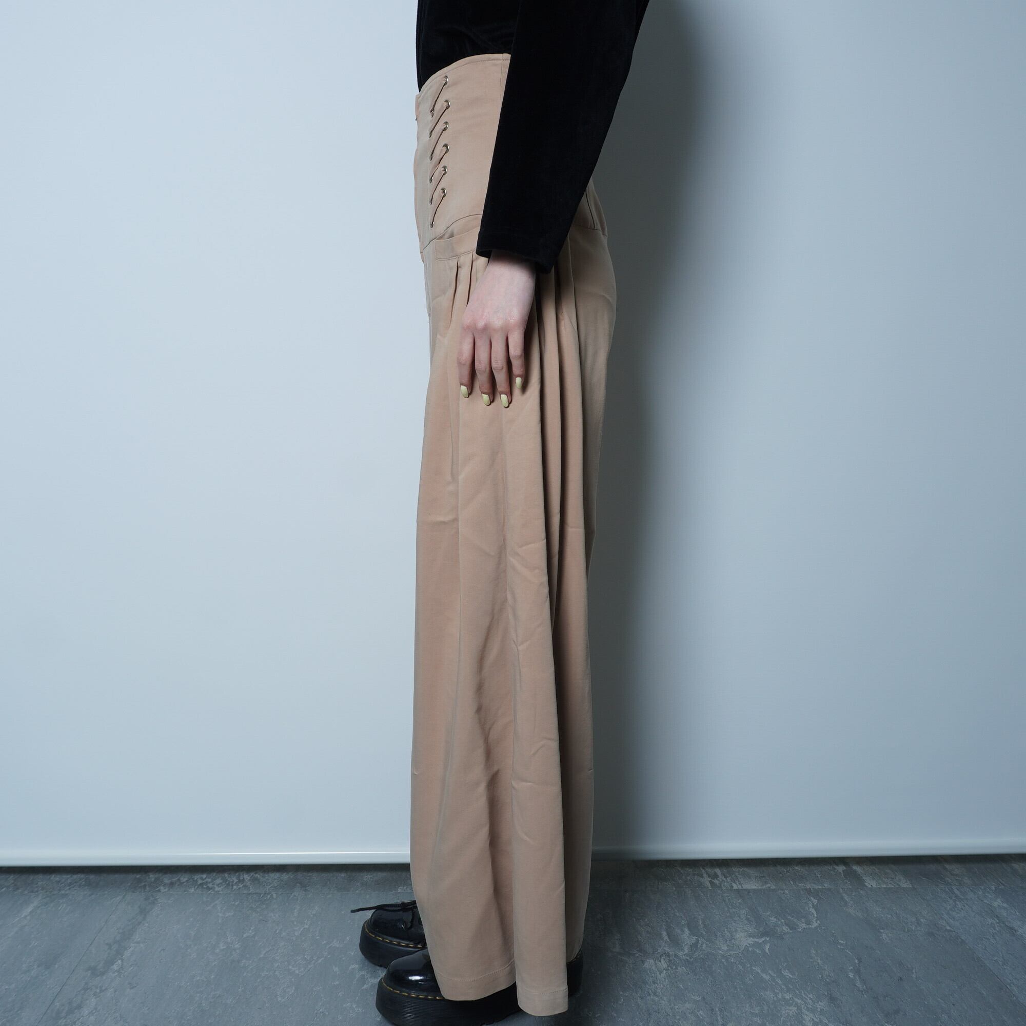 洗練されたベージュカラーと、繊細なレースアップデザインが特徴です。上品なワイドシルエットは、スタイルアップ効果も期待できます。高品質な素材と、細部にまでこだわったデザインが、大人の女性らしさを引き立てるアイテムです。