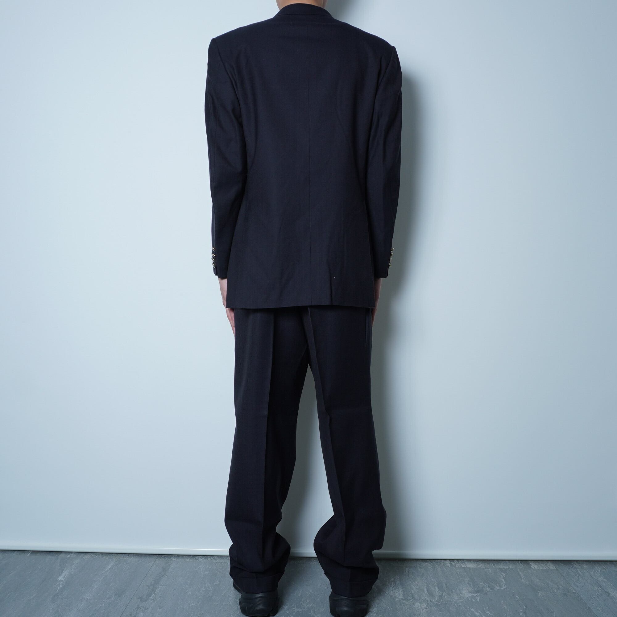 ウール100%のダブルセットアップスーツ。 ビジネスシーンから特別なイベントまで幅広く活躍します。ロゴが施されたボタンが洗練された印象を与え、エレガントなスタイルを演出します。