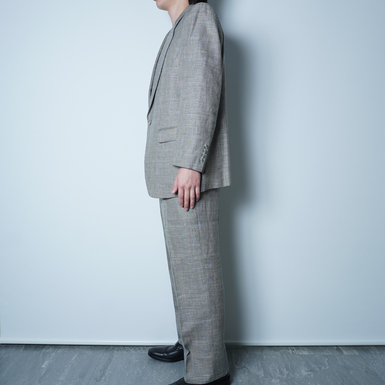上品なライトグレーの色合いと、麻とウールの混合素材による快適な着心地が特徴です。洗練されたデザインで、様々なシーンで活躍します。式などはもちろん、プライベートでも使えます。