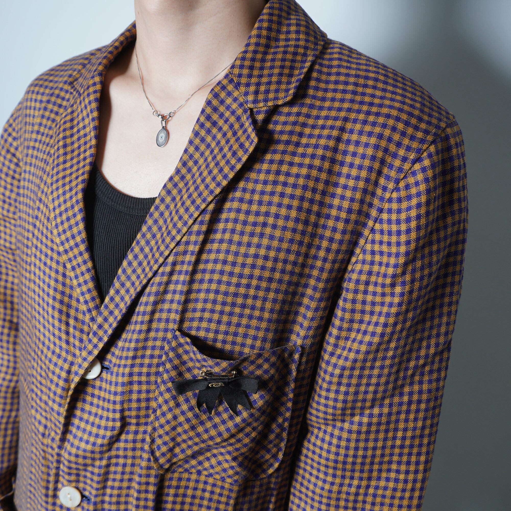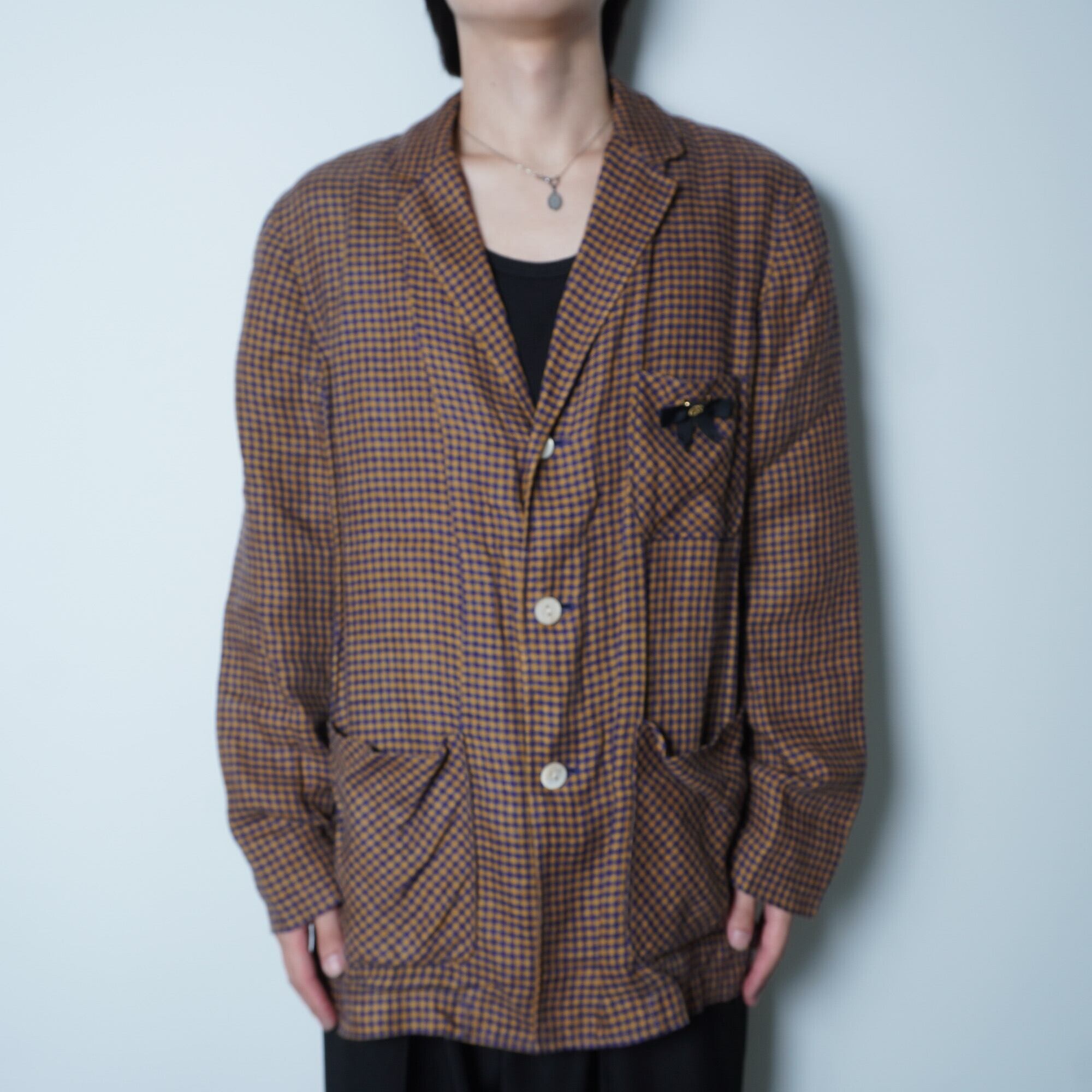 【GUCCI】グッチ ミケーレ期GGリボン ブローチリネンチェックジャケット navy & brown