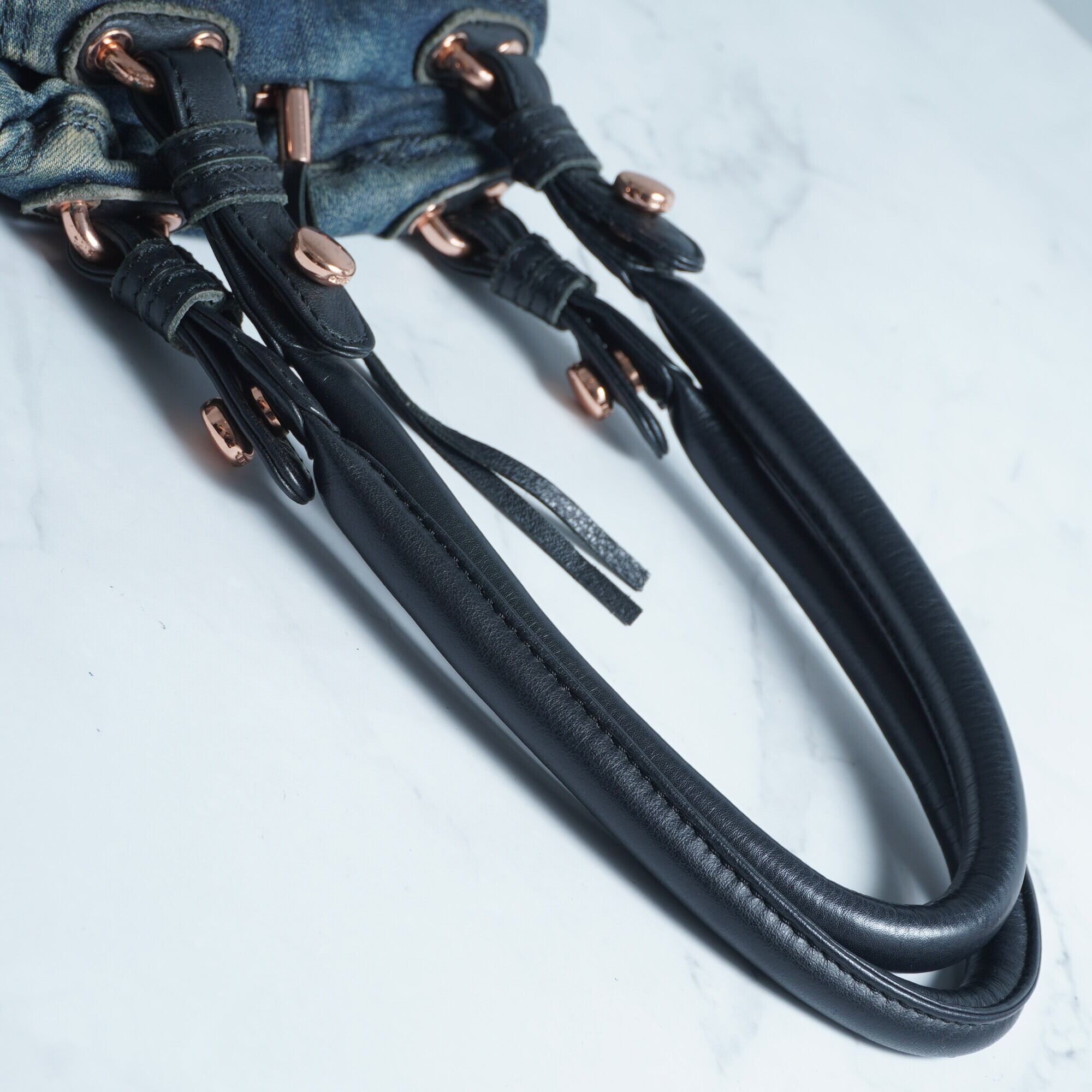 ・レザー切替が個性を引き立てるデニムのボストンバッグ