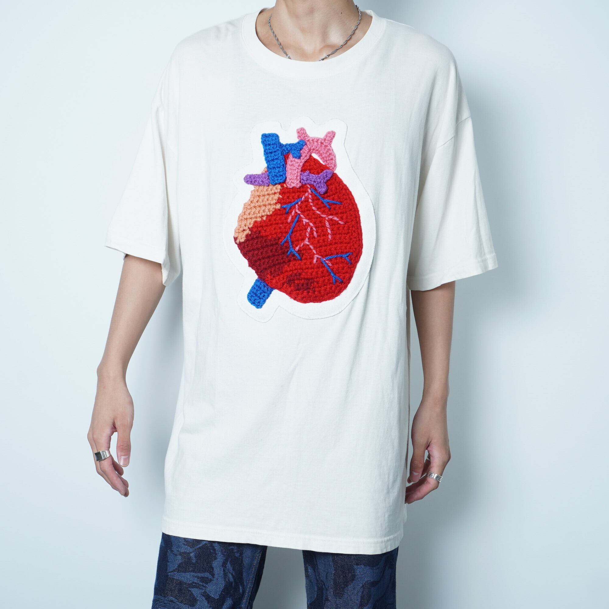 ・【KIDILL】のARCHIVES 心臓ニット装飾ビッグTEE whiteは、そのユニークなデザインが魅力です。
