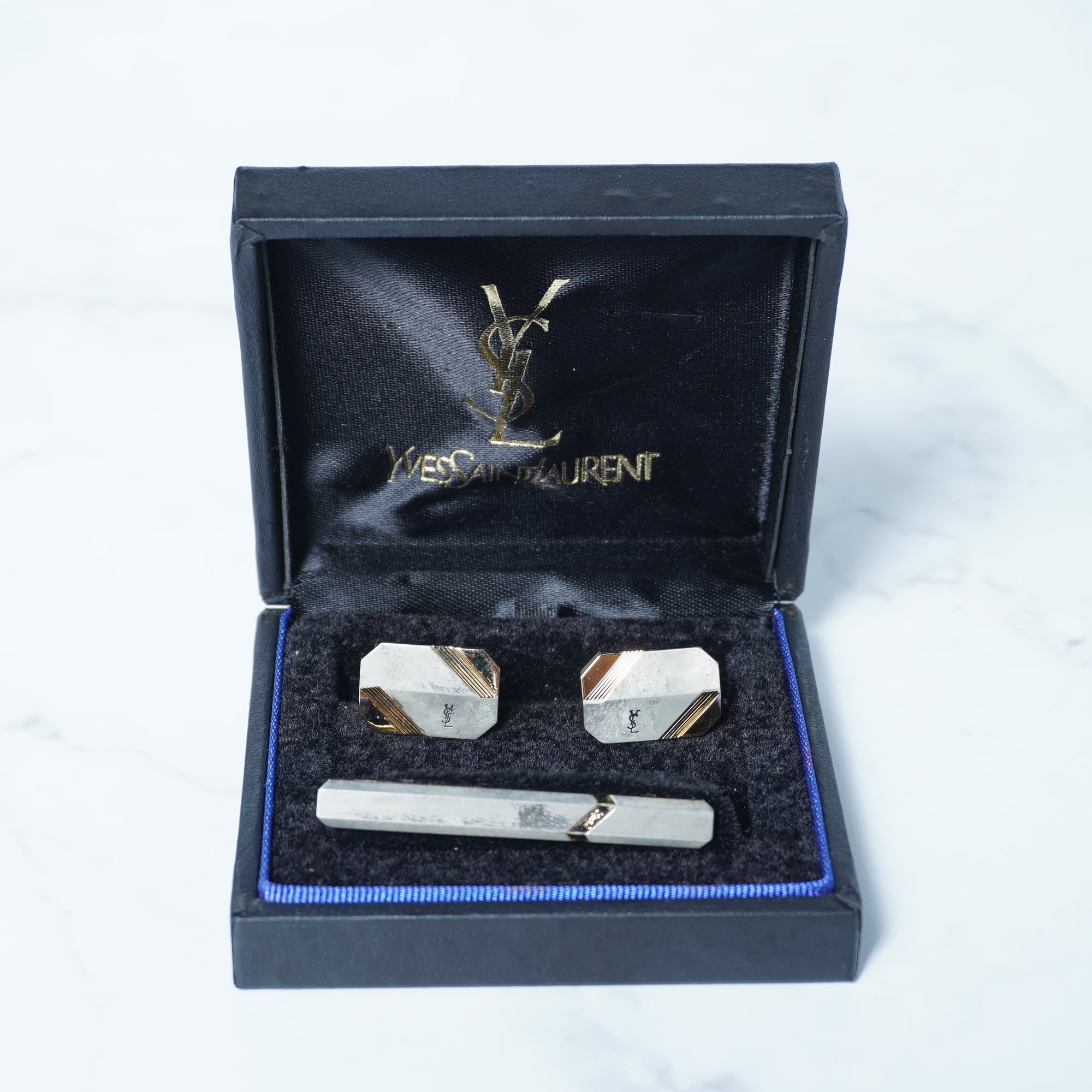 【Yves Saint Laurent 】イブサンローラン ”ロゴ入”ネクタイピン・カフスピンセット gold&silver