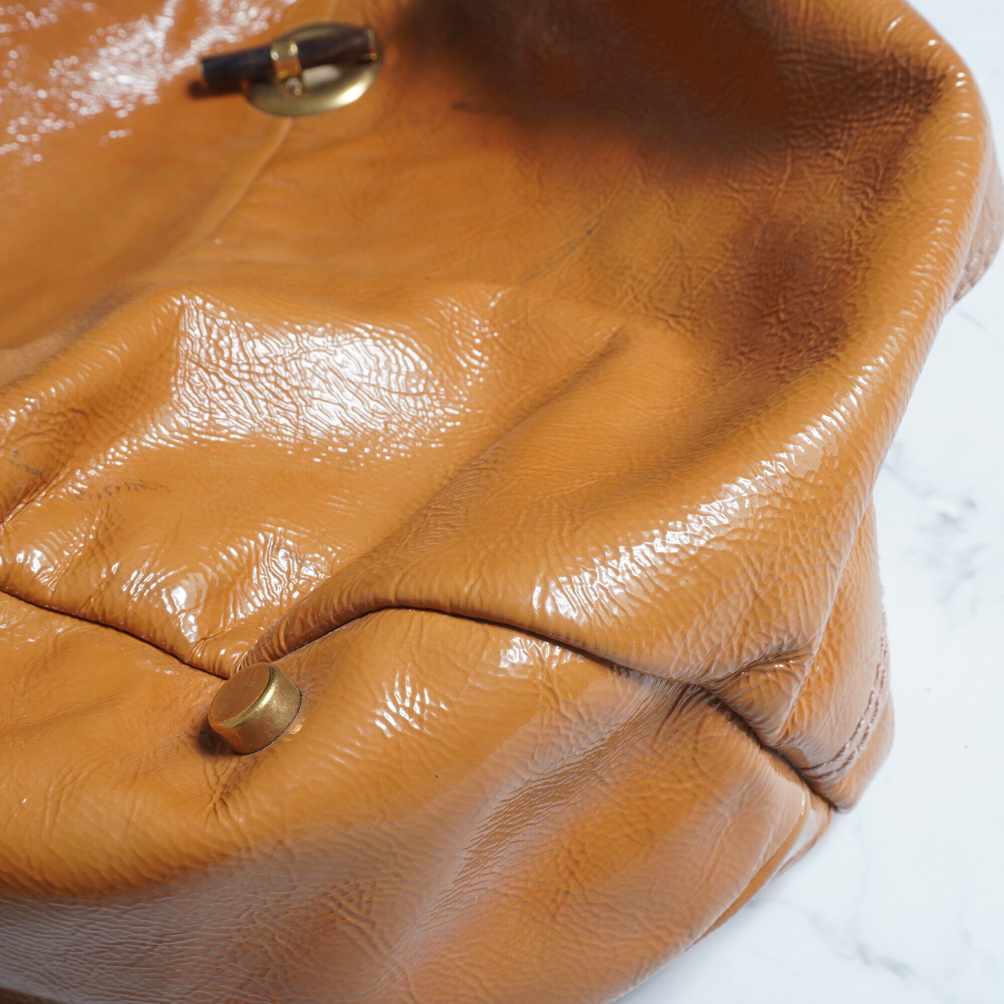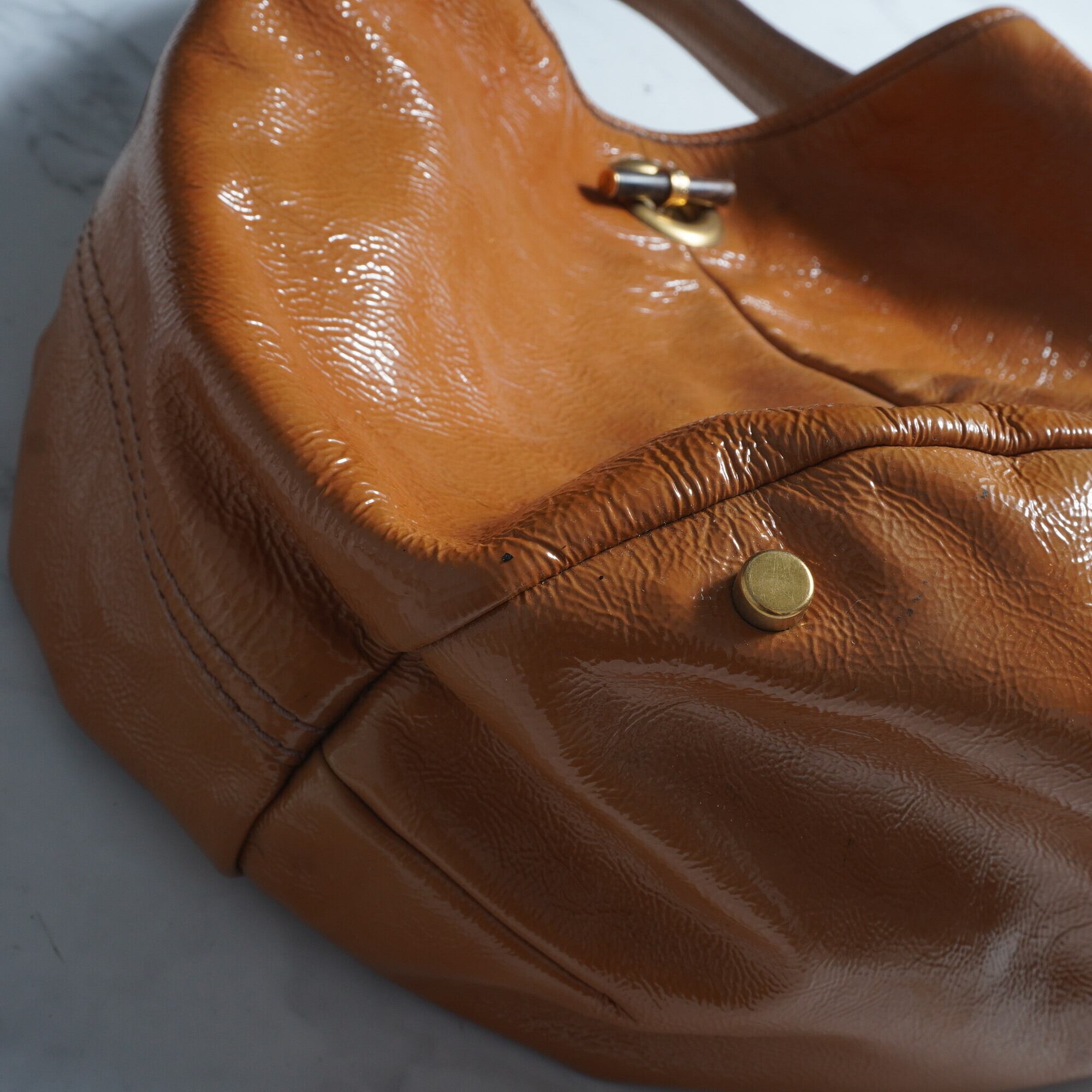 【Yves Saint Laurent】イブサンローラン vintage パテントレザーハトメデザインワンショルダーバッグ camel