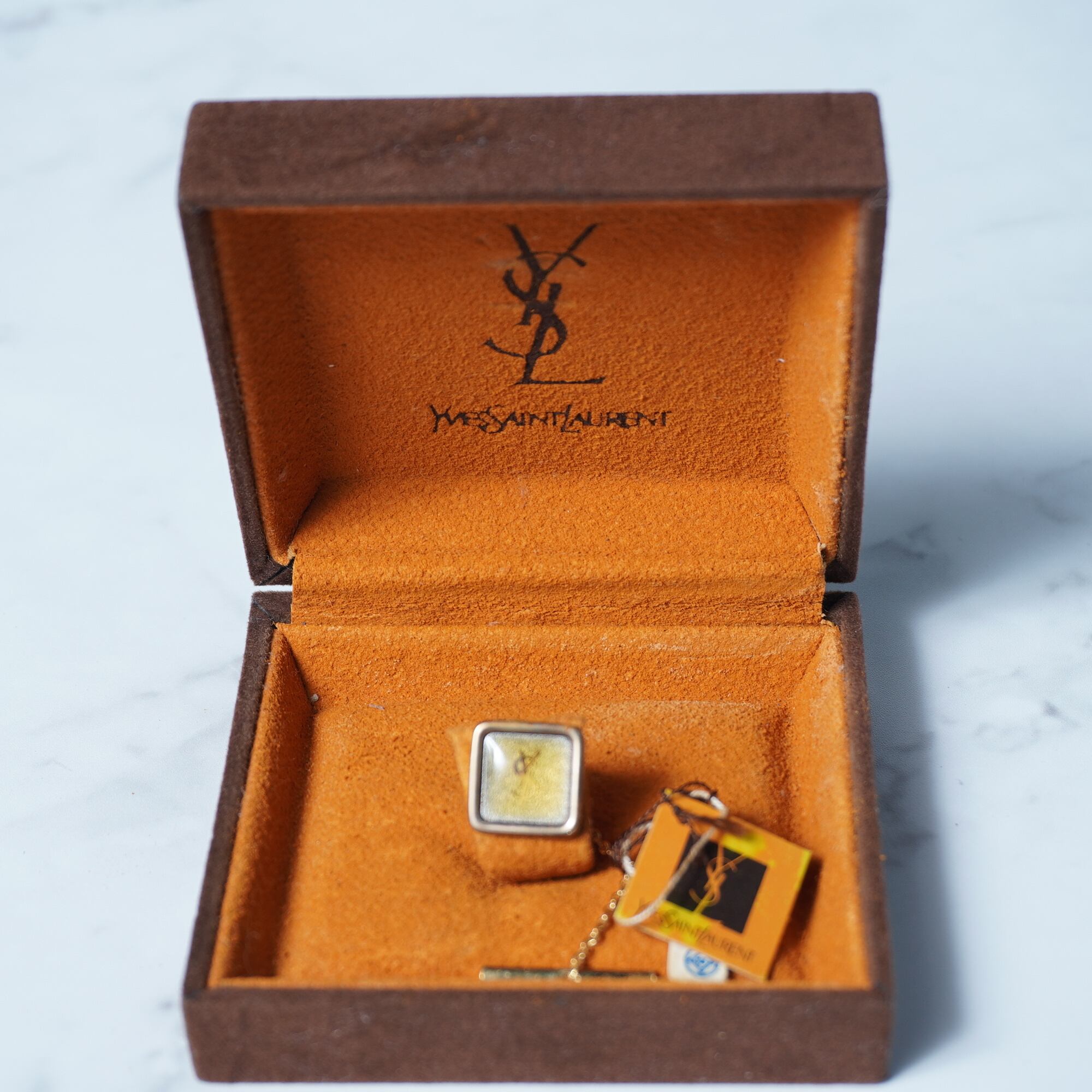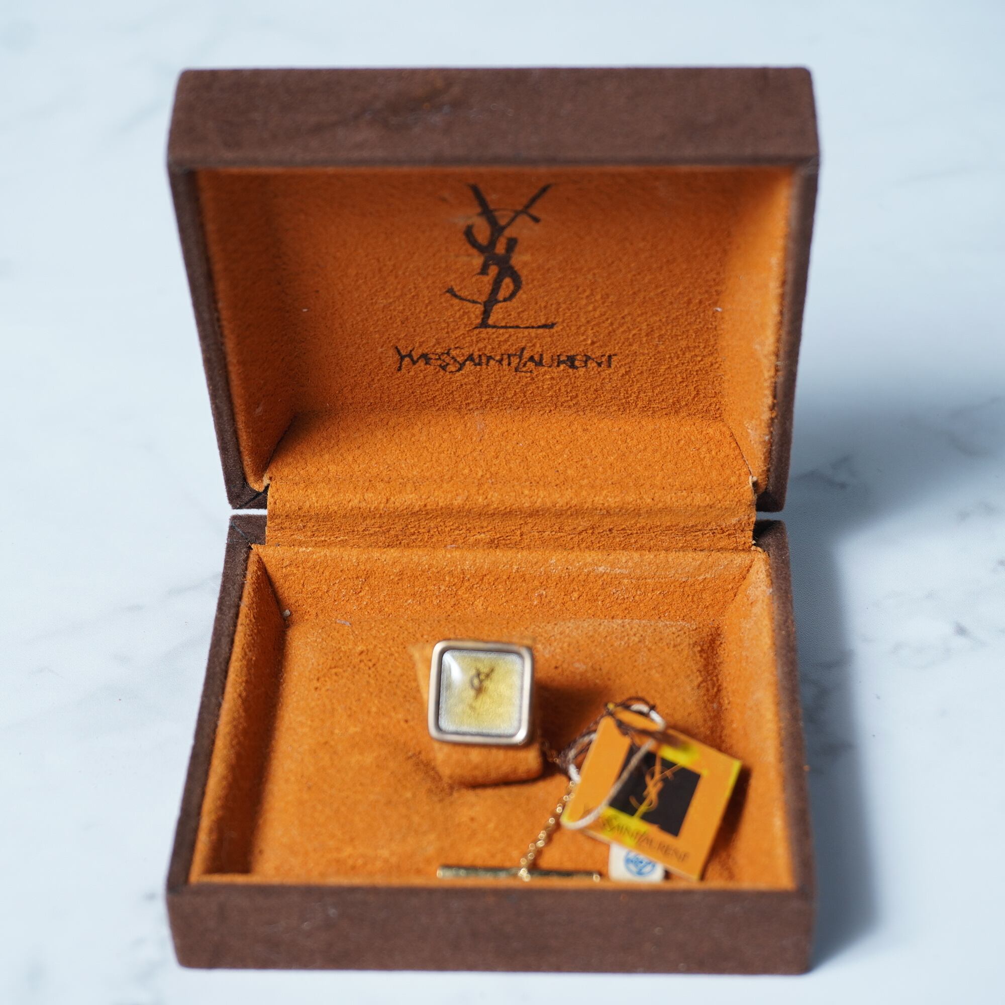 【Yves Saint Laurent】イブサンローラン "ロゴ入” スクエアラベルピン 箱付き gold