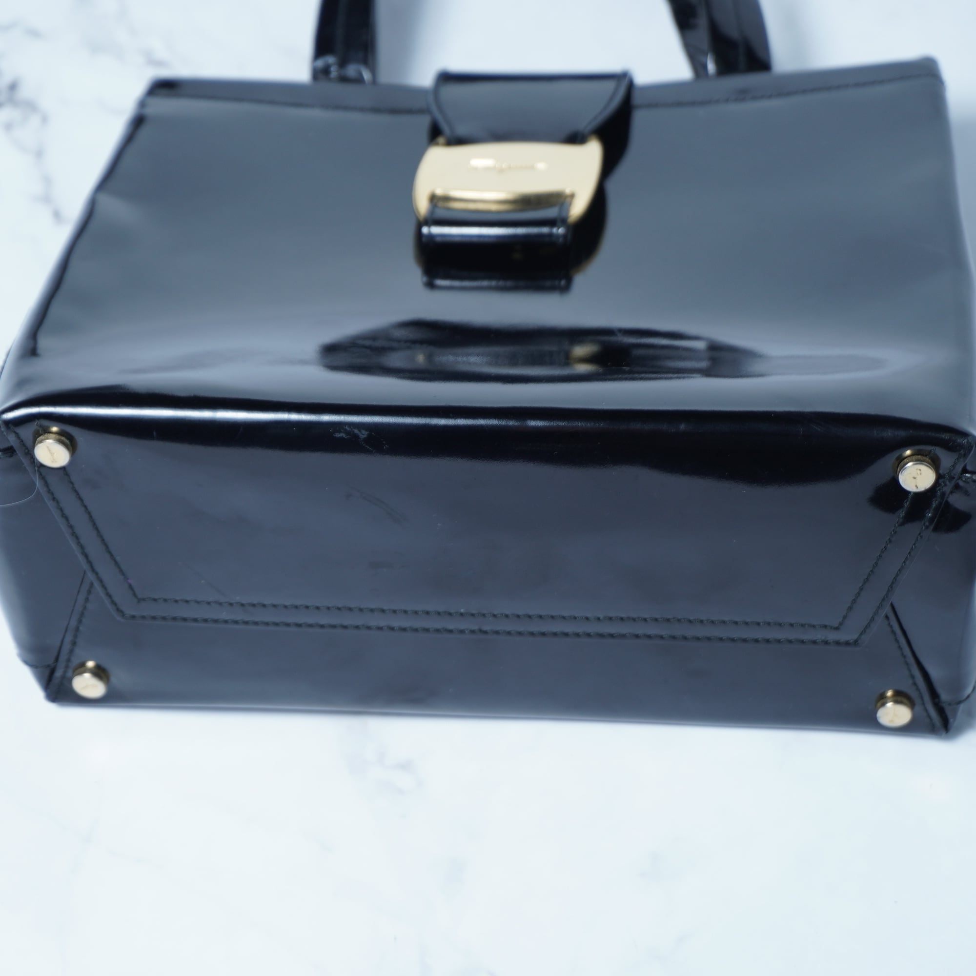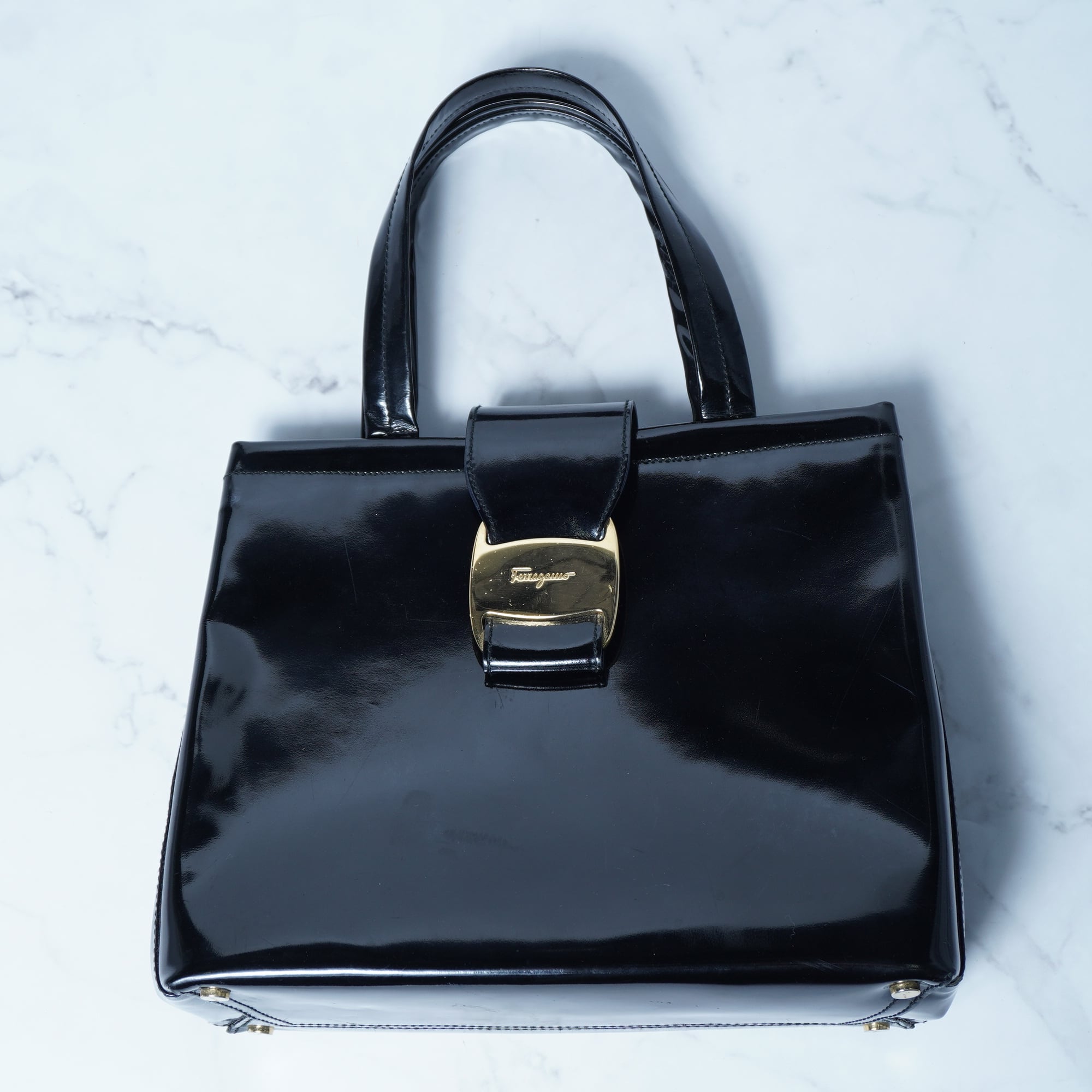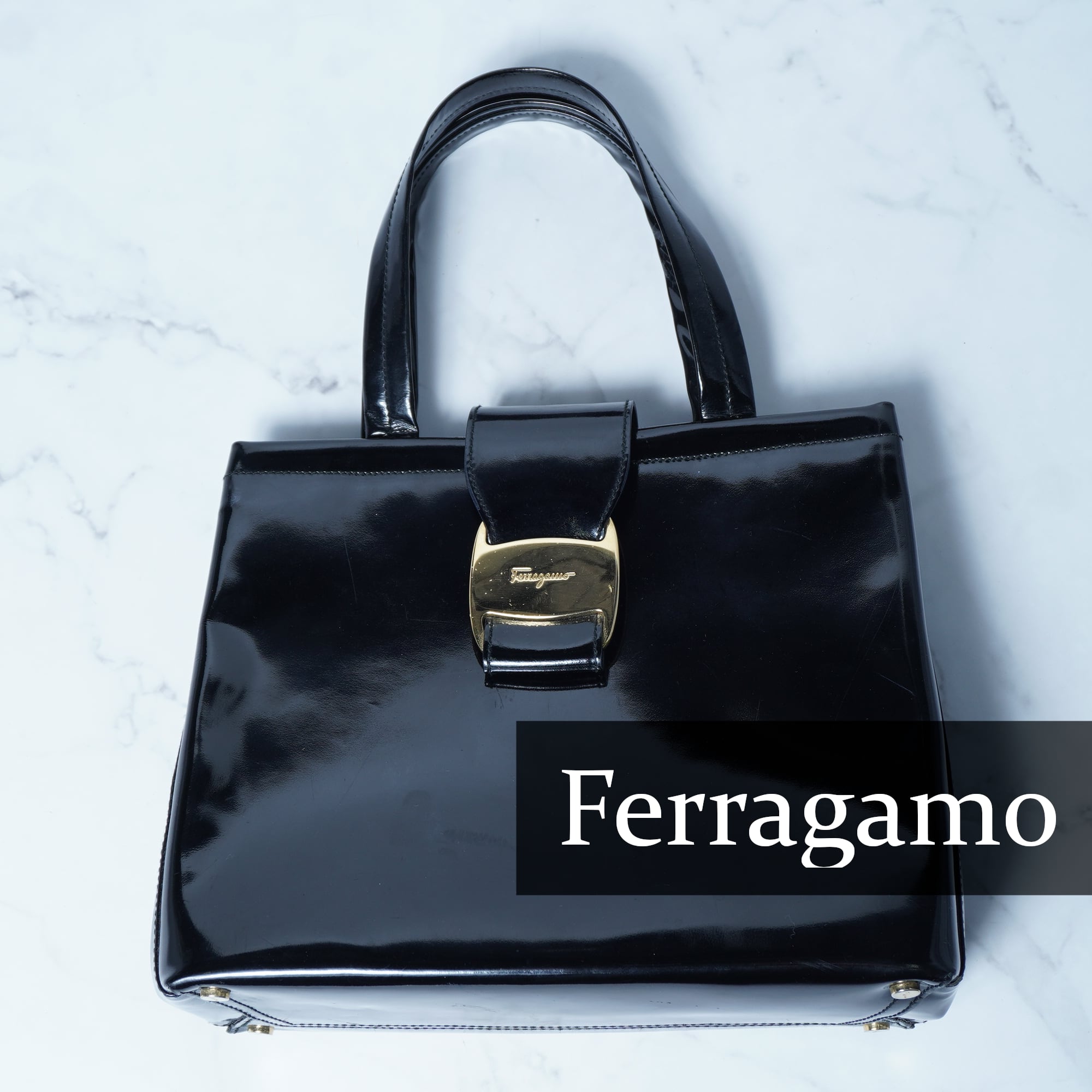【Ferrgamo】フェラガモ 金装飾ロゴ エナメルレザーハンドバッグ black