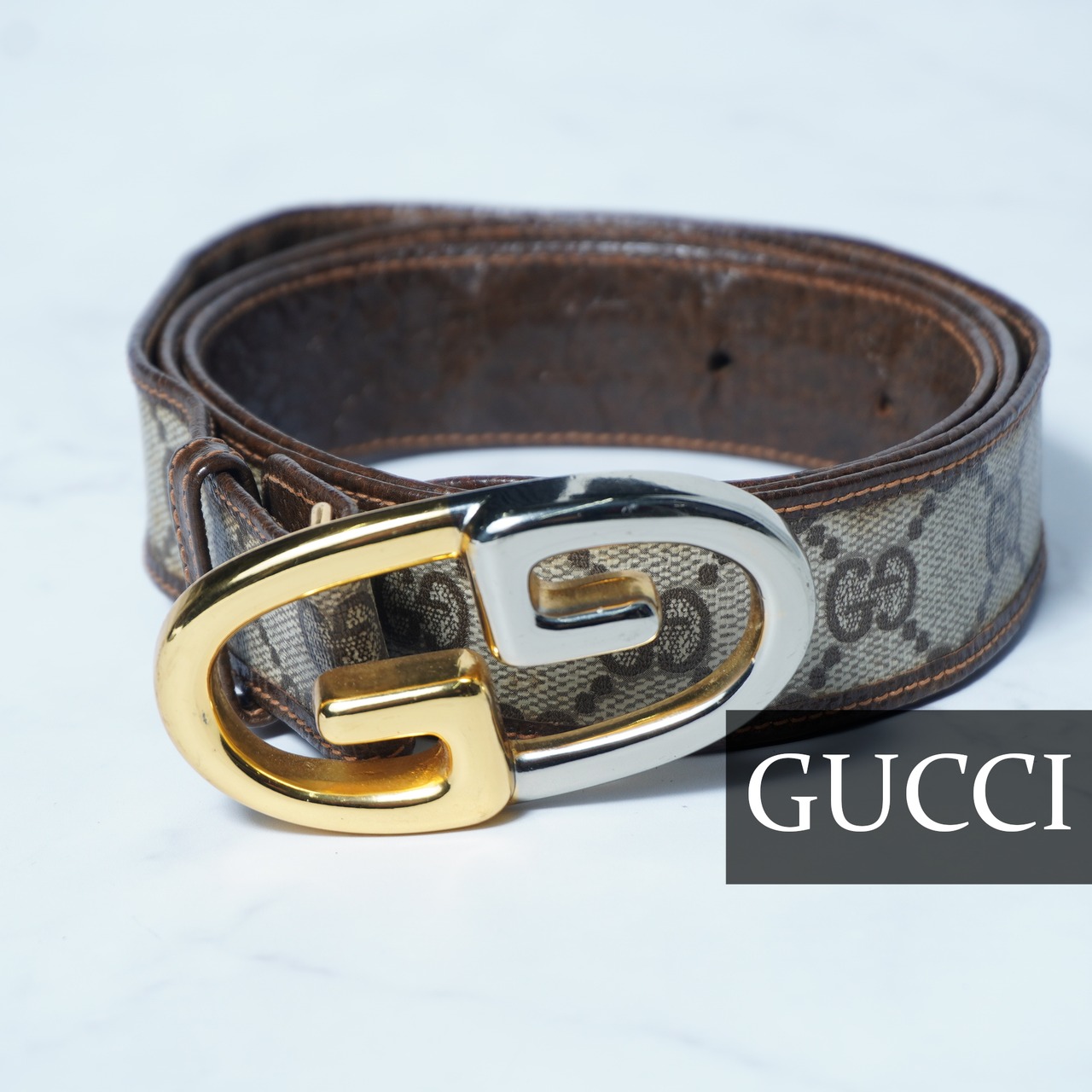 【GUCCI】グッチ シルバー&ゴールドGGロゴバックルGG柄レザーベルト brown