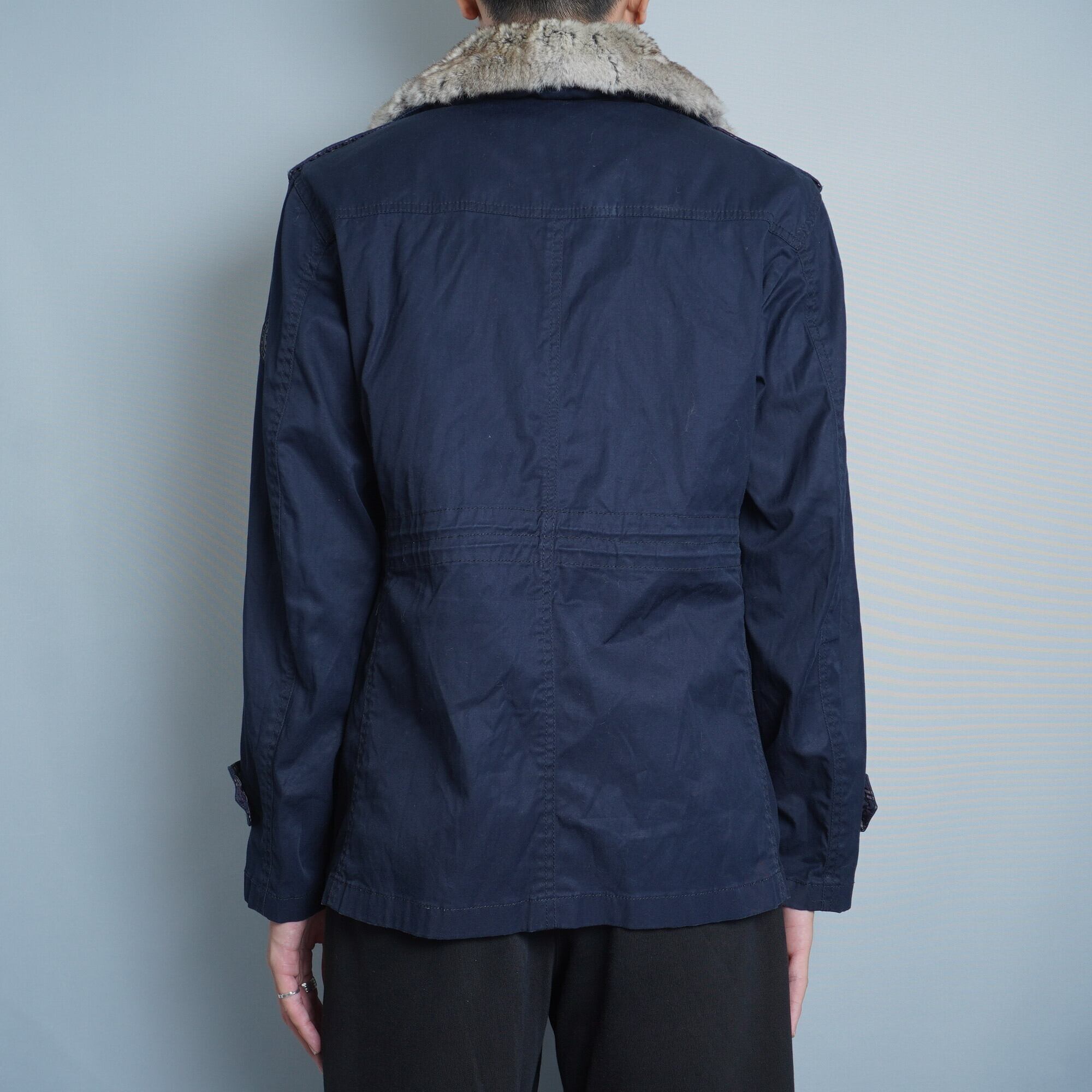 【BURBERRY】バーバリー BLACK LABEL ラビットファー付きコットンボタンワークジャケット navy