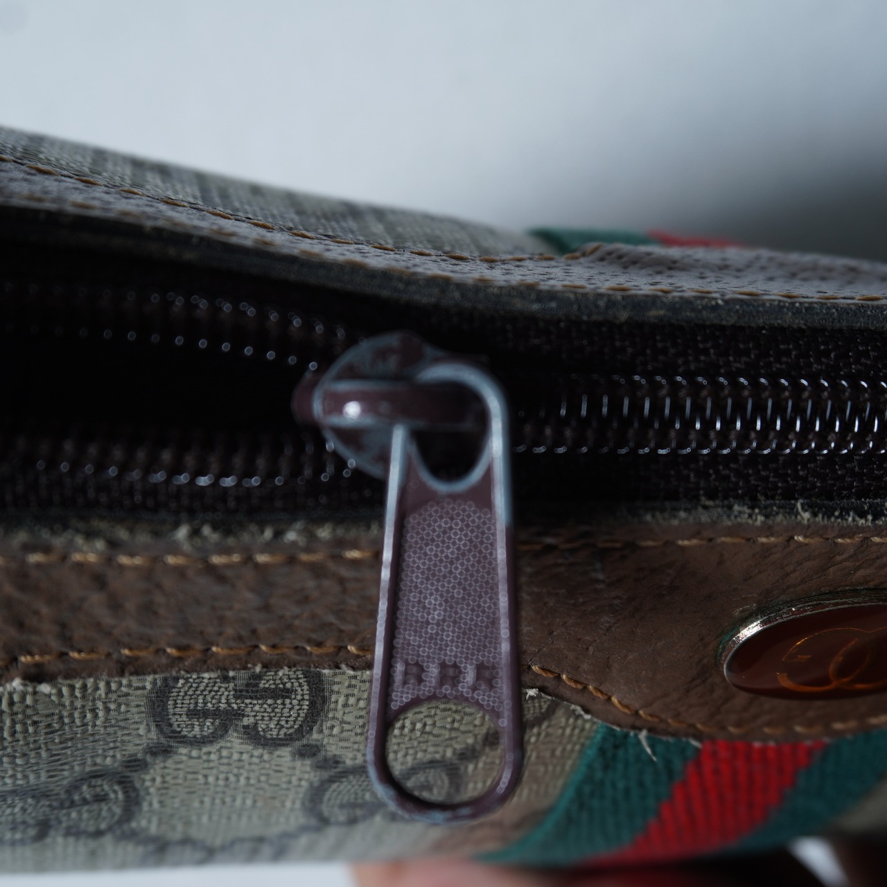 【GUCCI】グッチ ”ロゴ入”GG柄シェリーラインレザーショルダーバッグ beige&brown