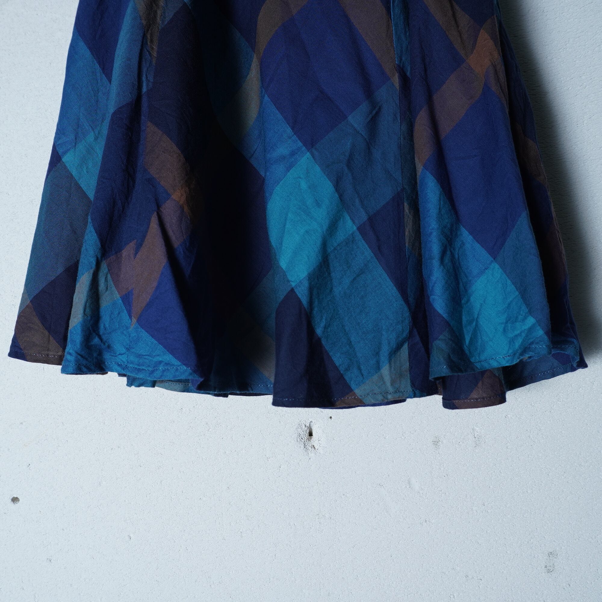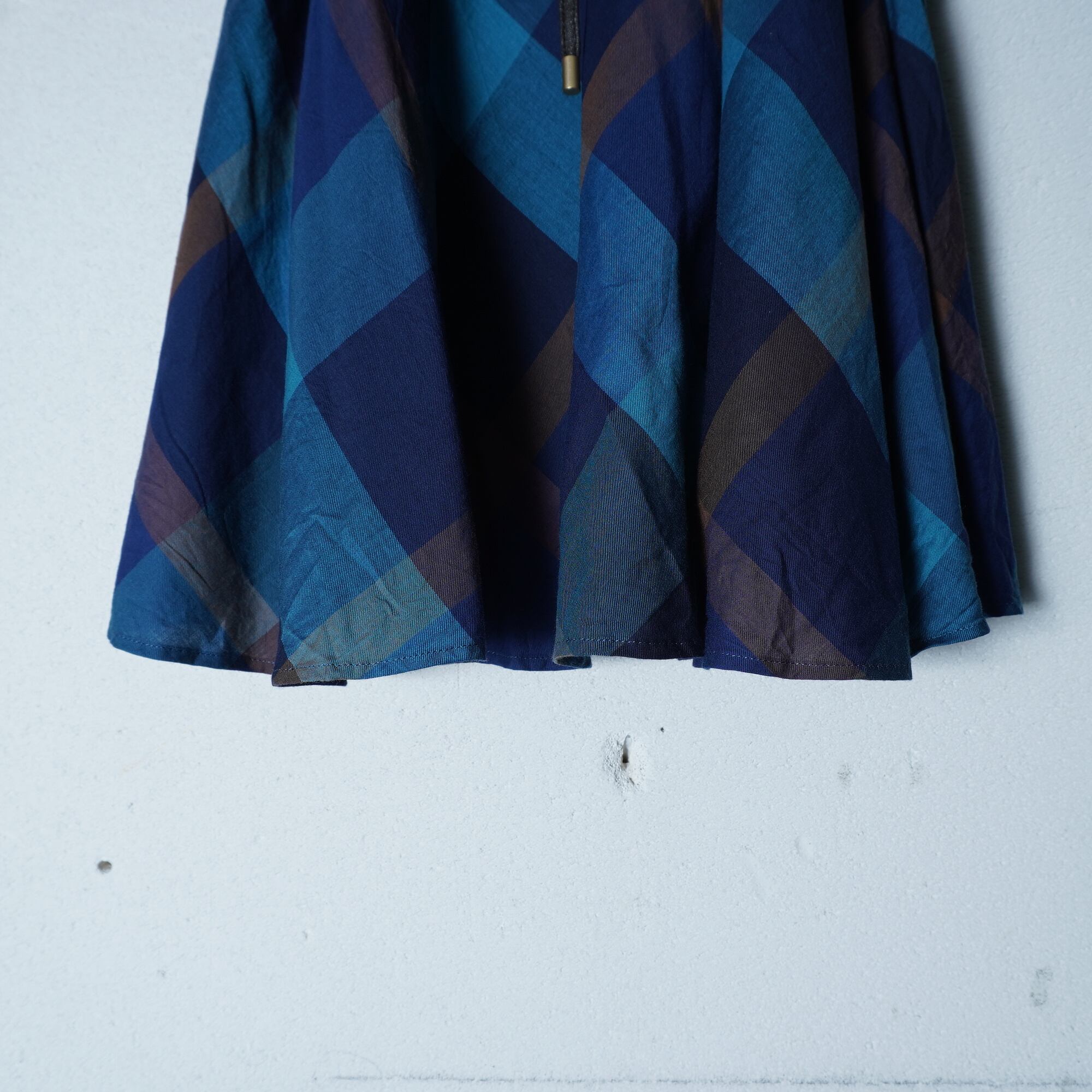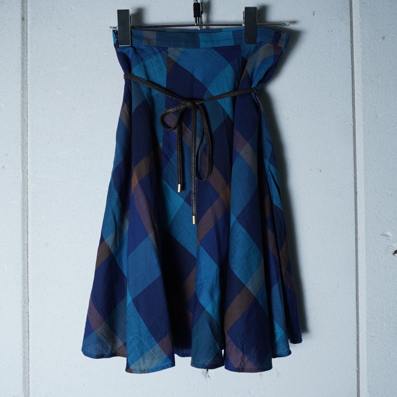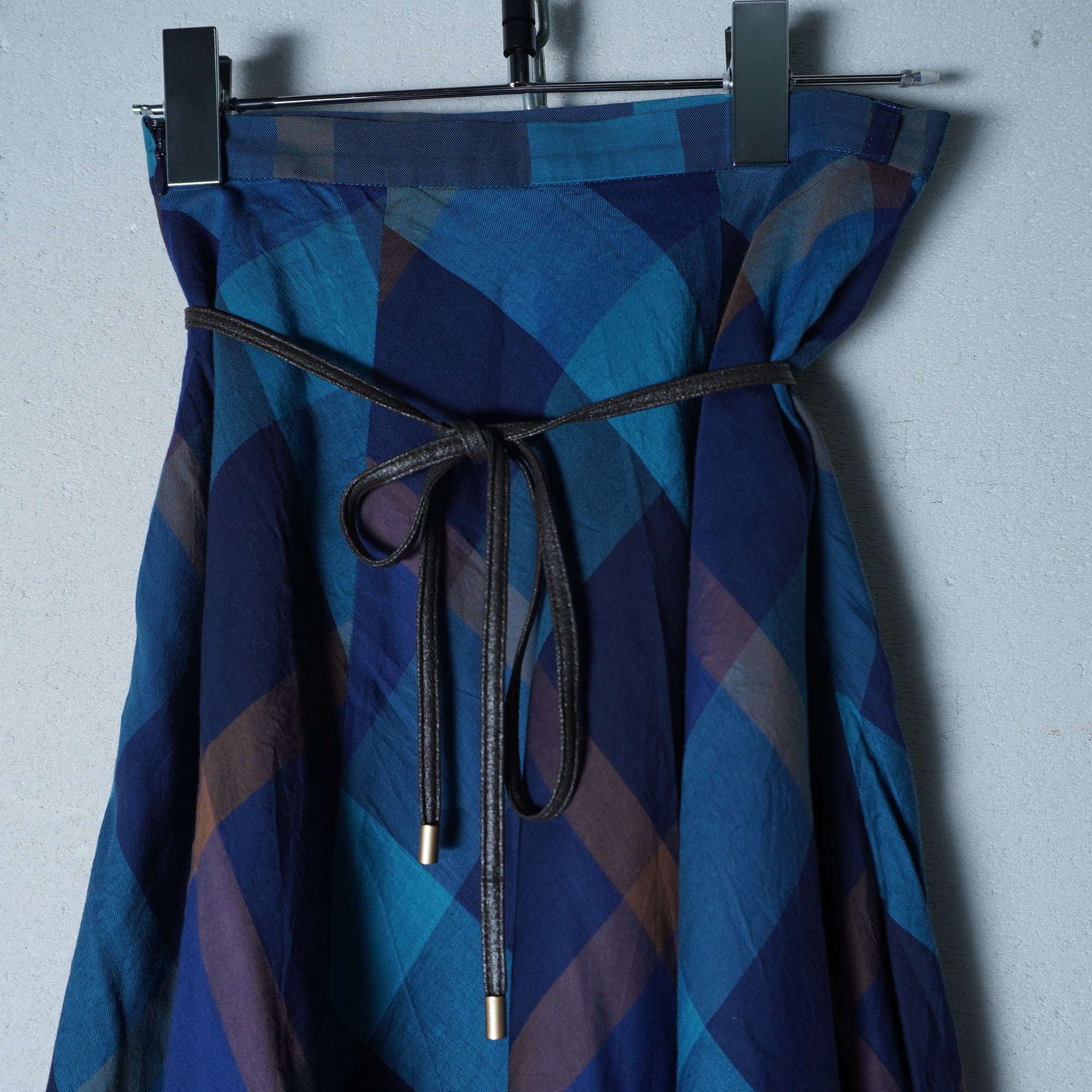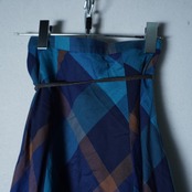 【BURBERRY】バーバリー レザーリボンチェックフレアスカート blue & brown