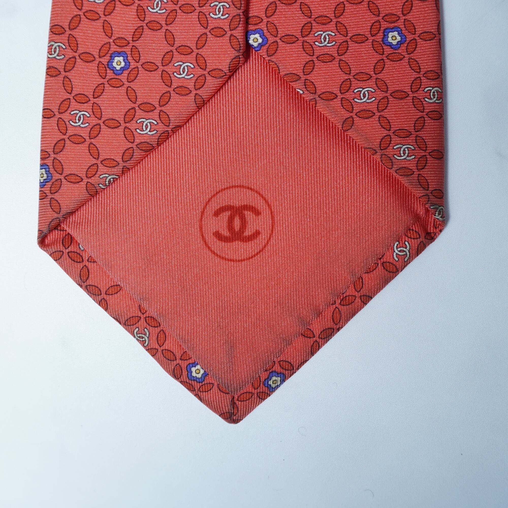 【CHANEL】シャネル ”SILK100%”メタルチェーン・フラワー・ココマーク総柄ネクタイ red