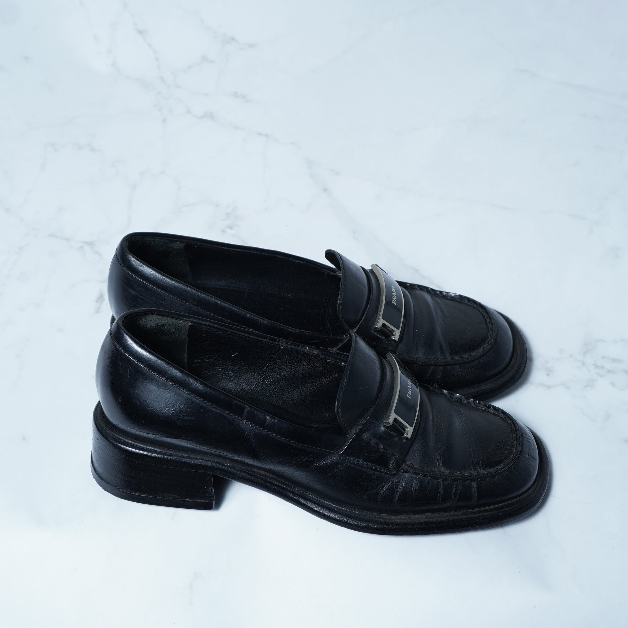 【PRADA】プラダ "ロゴプレート”スクエアトゥレザーローファー black