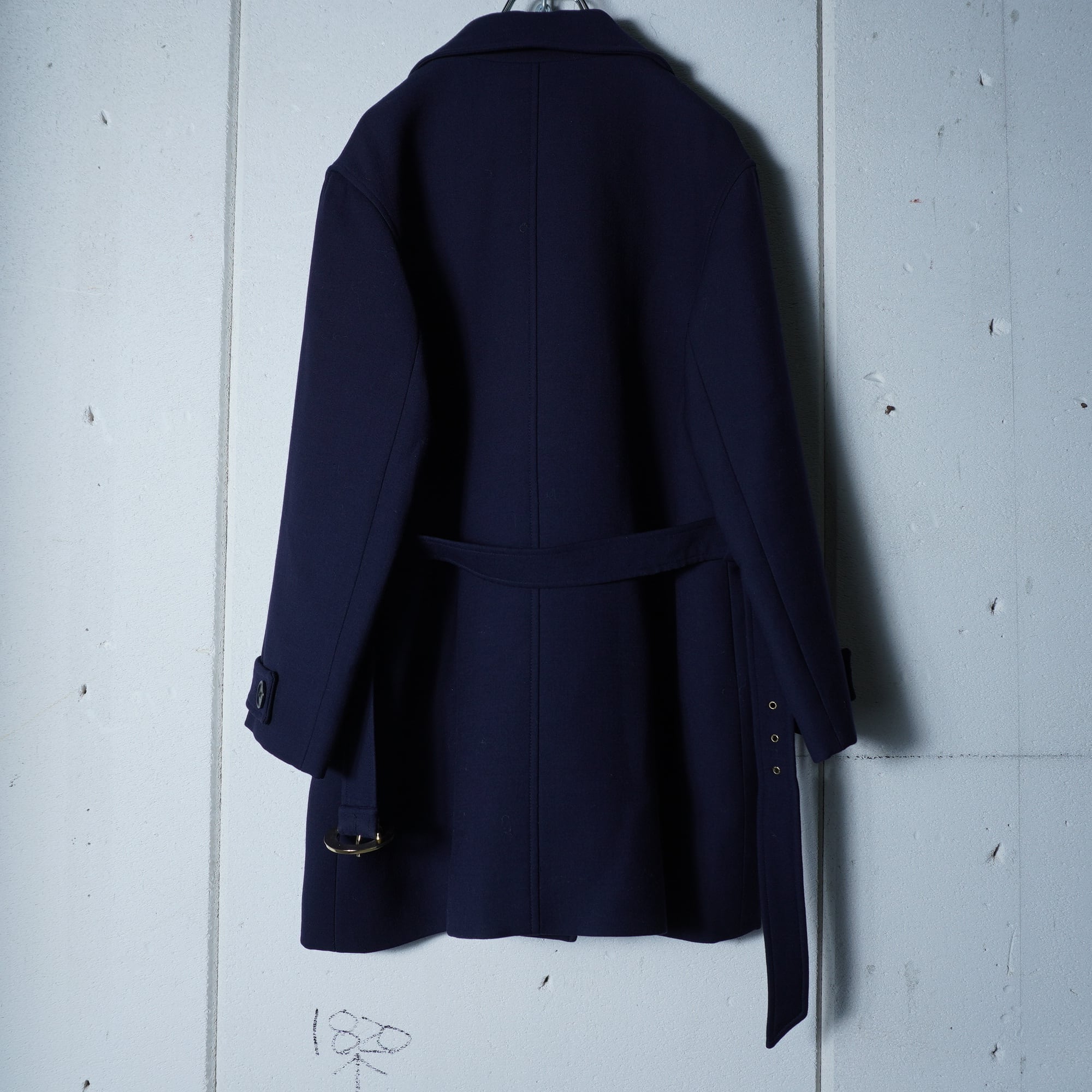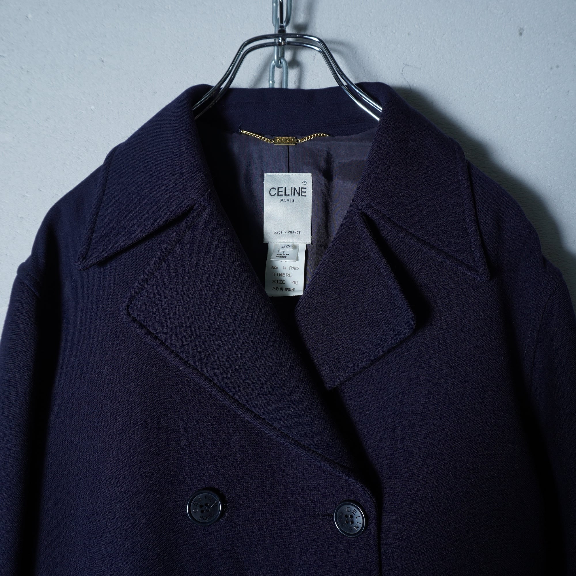 【CELINE】セリーヌ ”WOOL100%” ダブルブレストロゴゴールドバックルベルテッドコート navy
