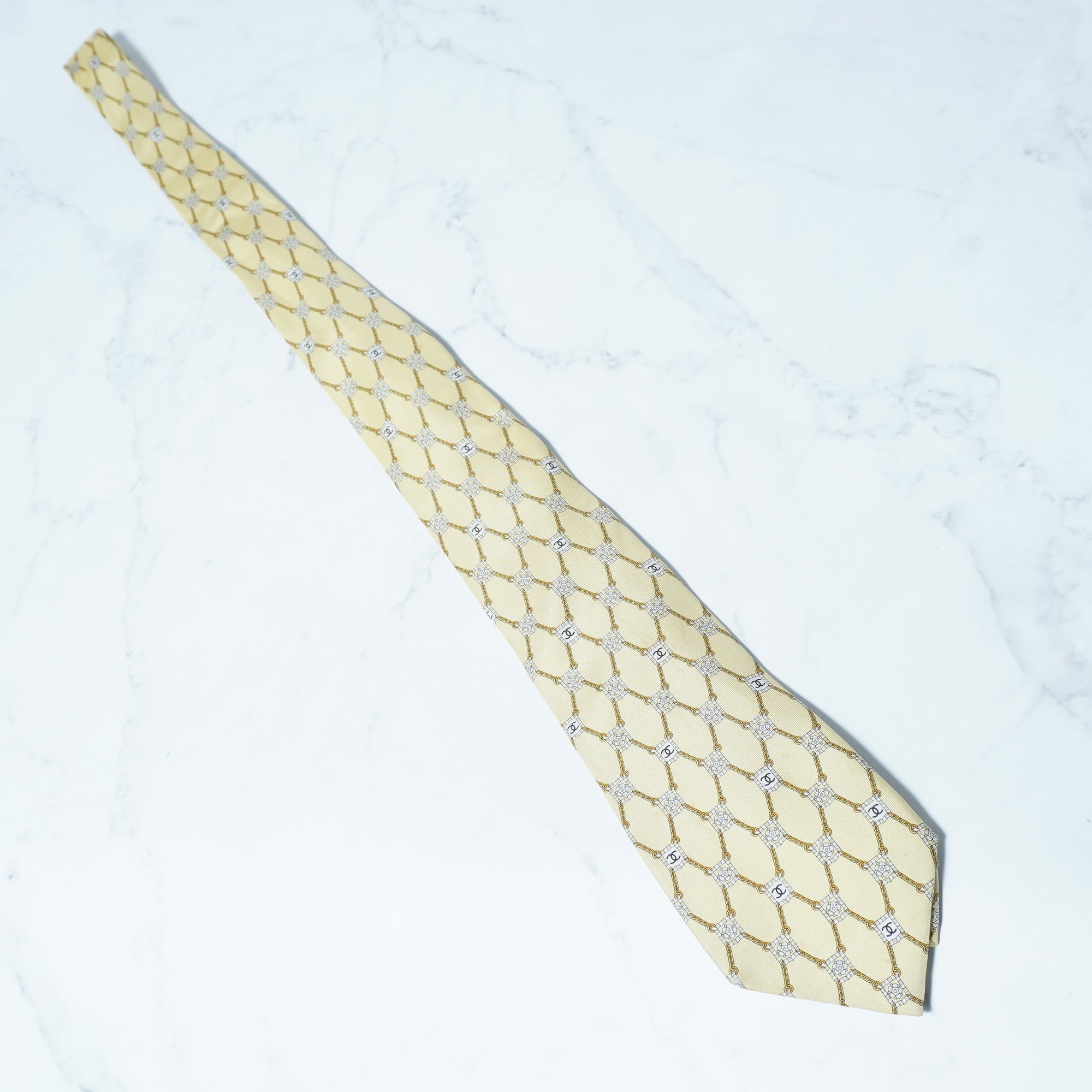 【CHANEL】シャネル "SILK100%" ゴールドチェーン・ココマークフラワーチェーン柄ネクタイ yellow beige