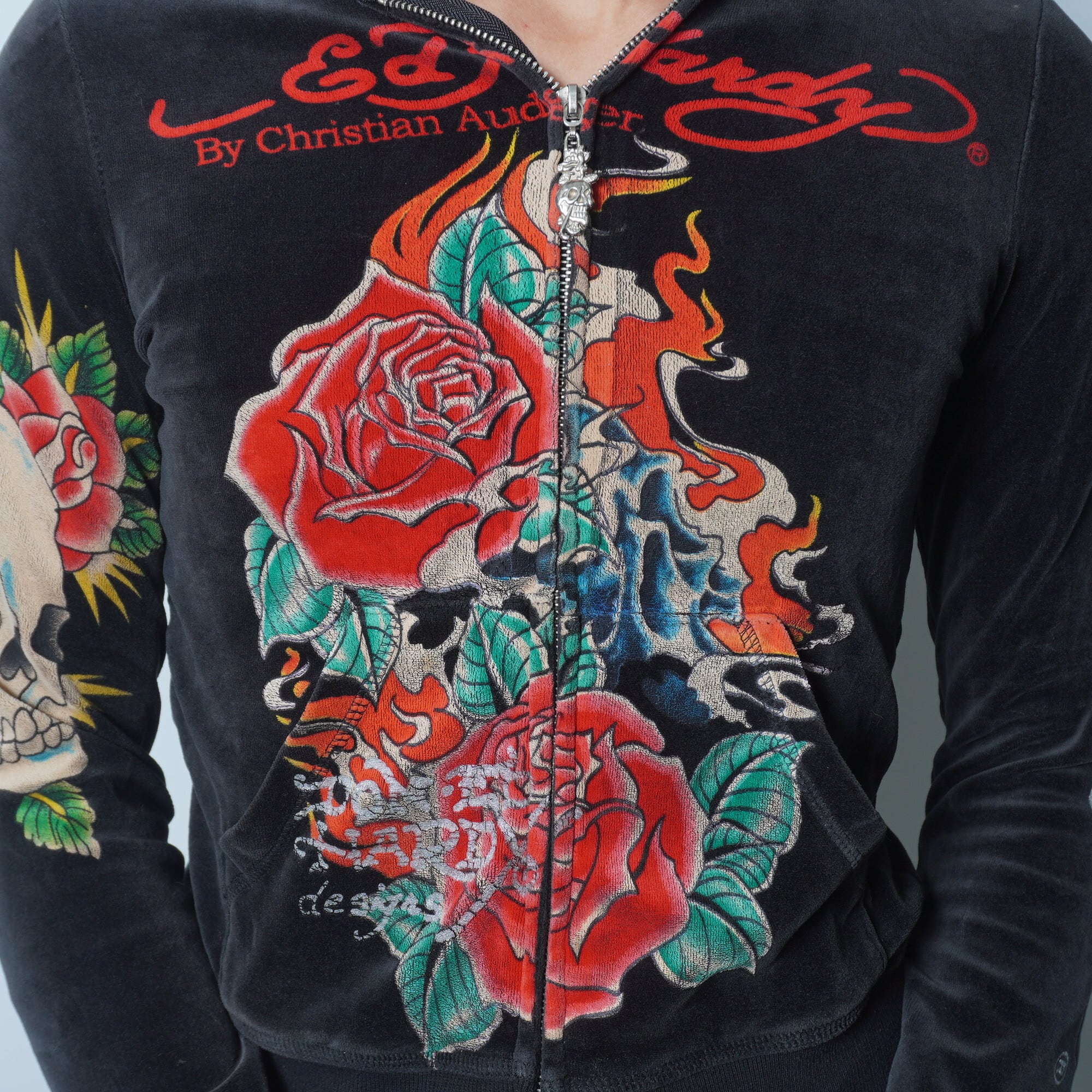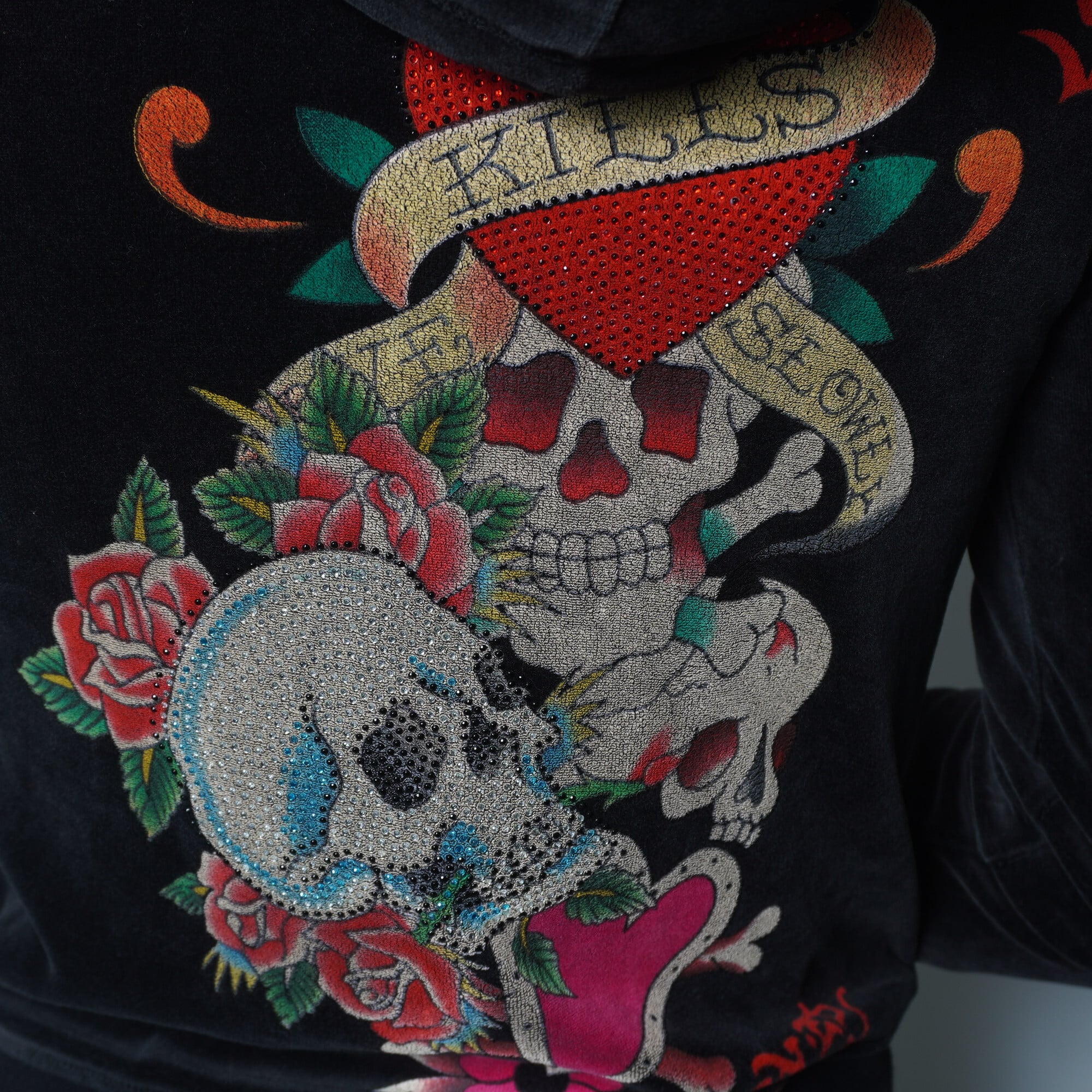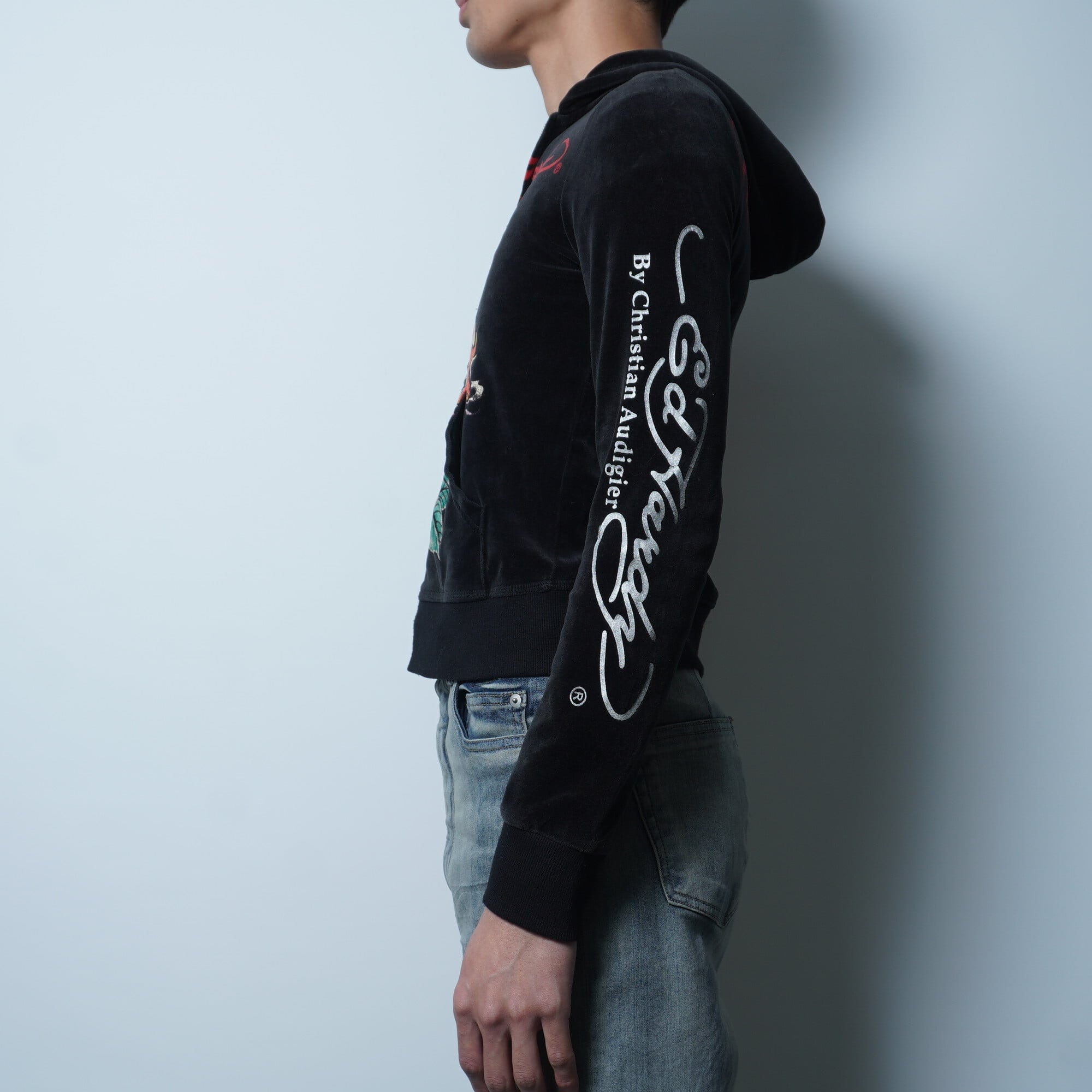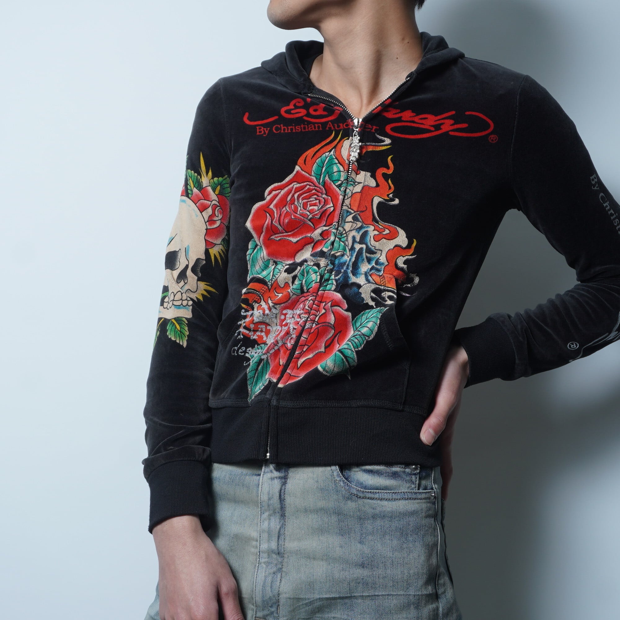 【Ed Hardy】エドハーディー タトゥーグラフィックラインストーンベロアジップパーカー black