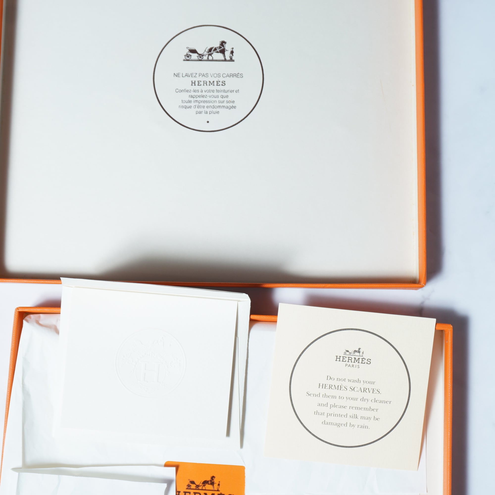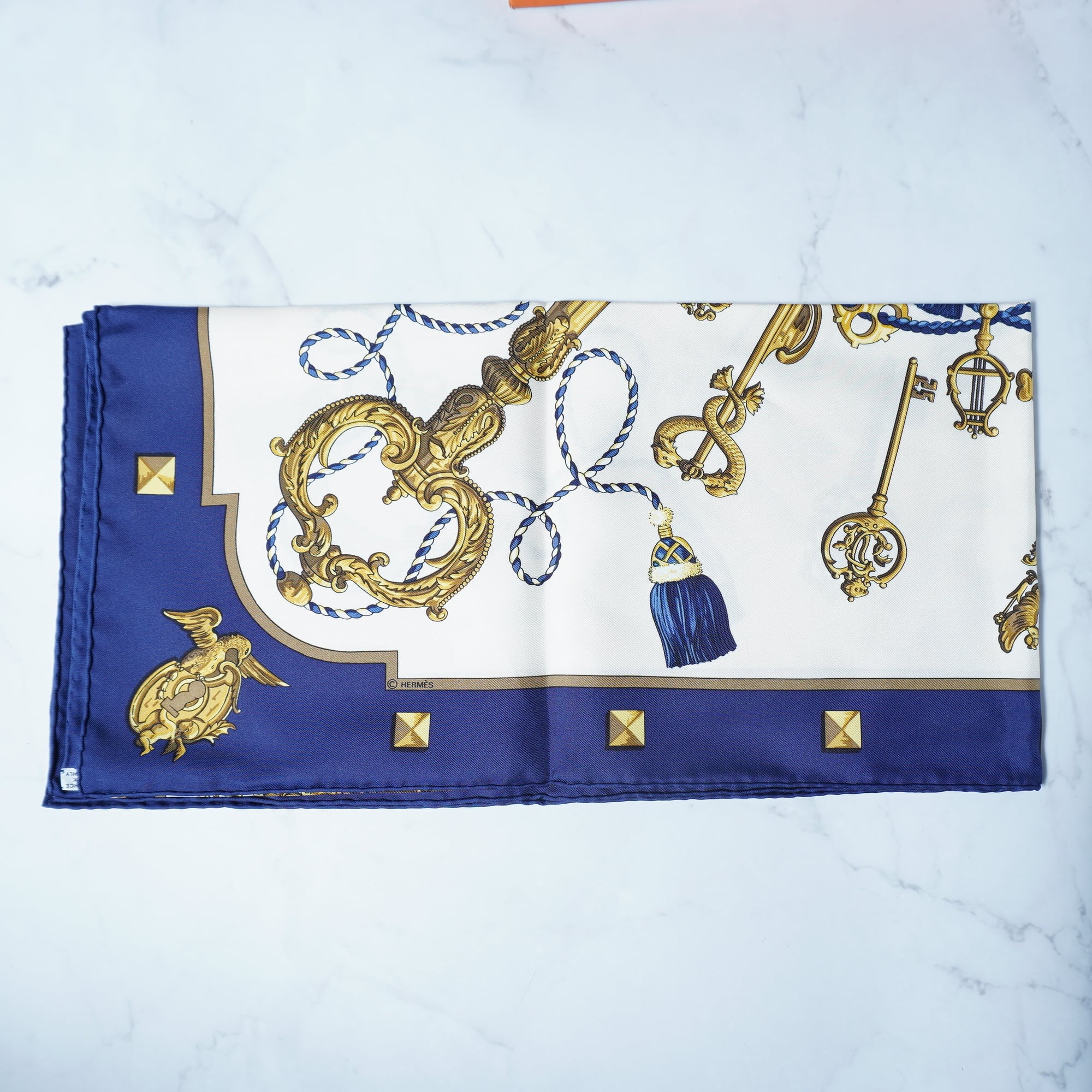 【HERMES】エルメス "ロゴ入””箱付” レ・クレパターン総シルクカレ90スカーフ white&beige&black