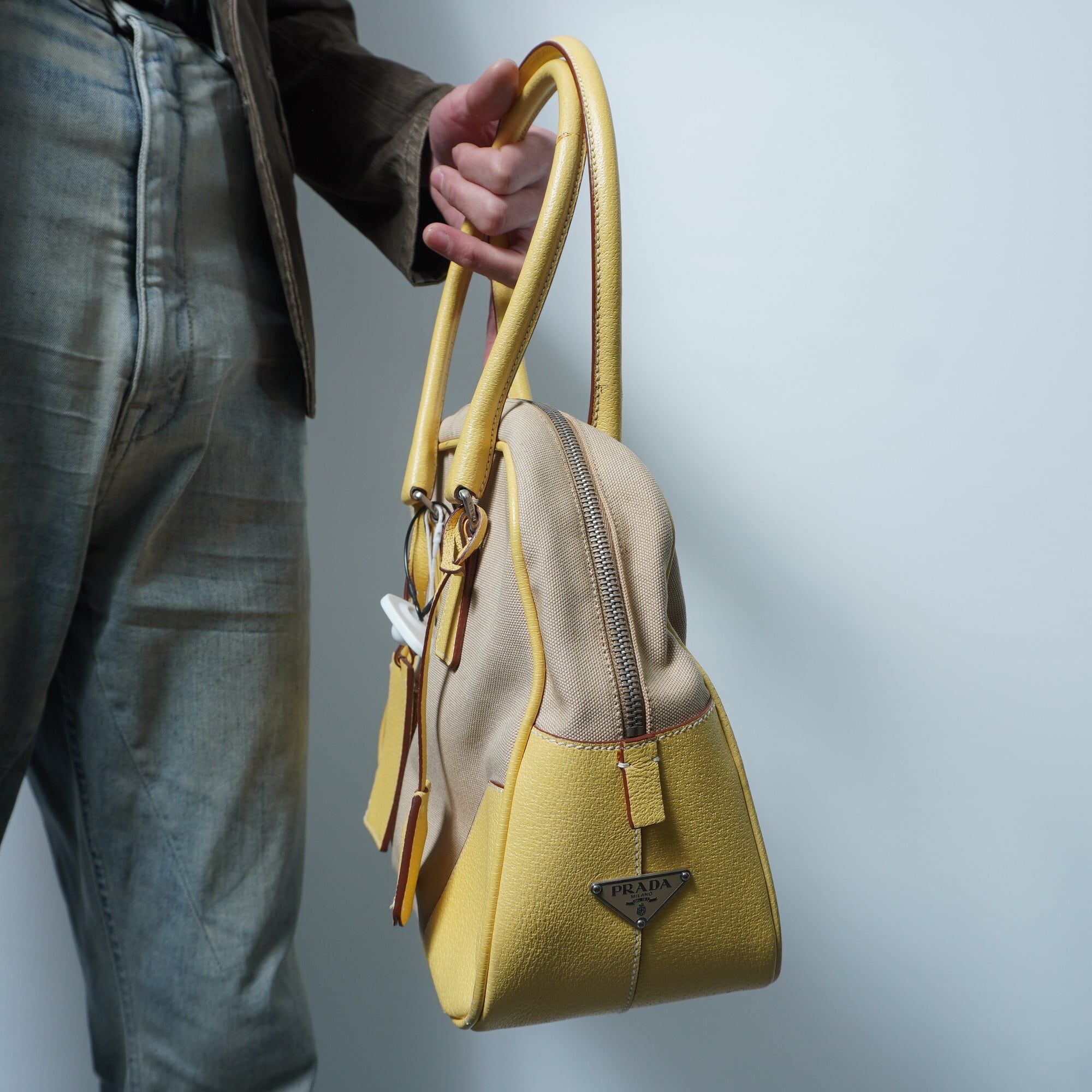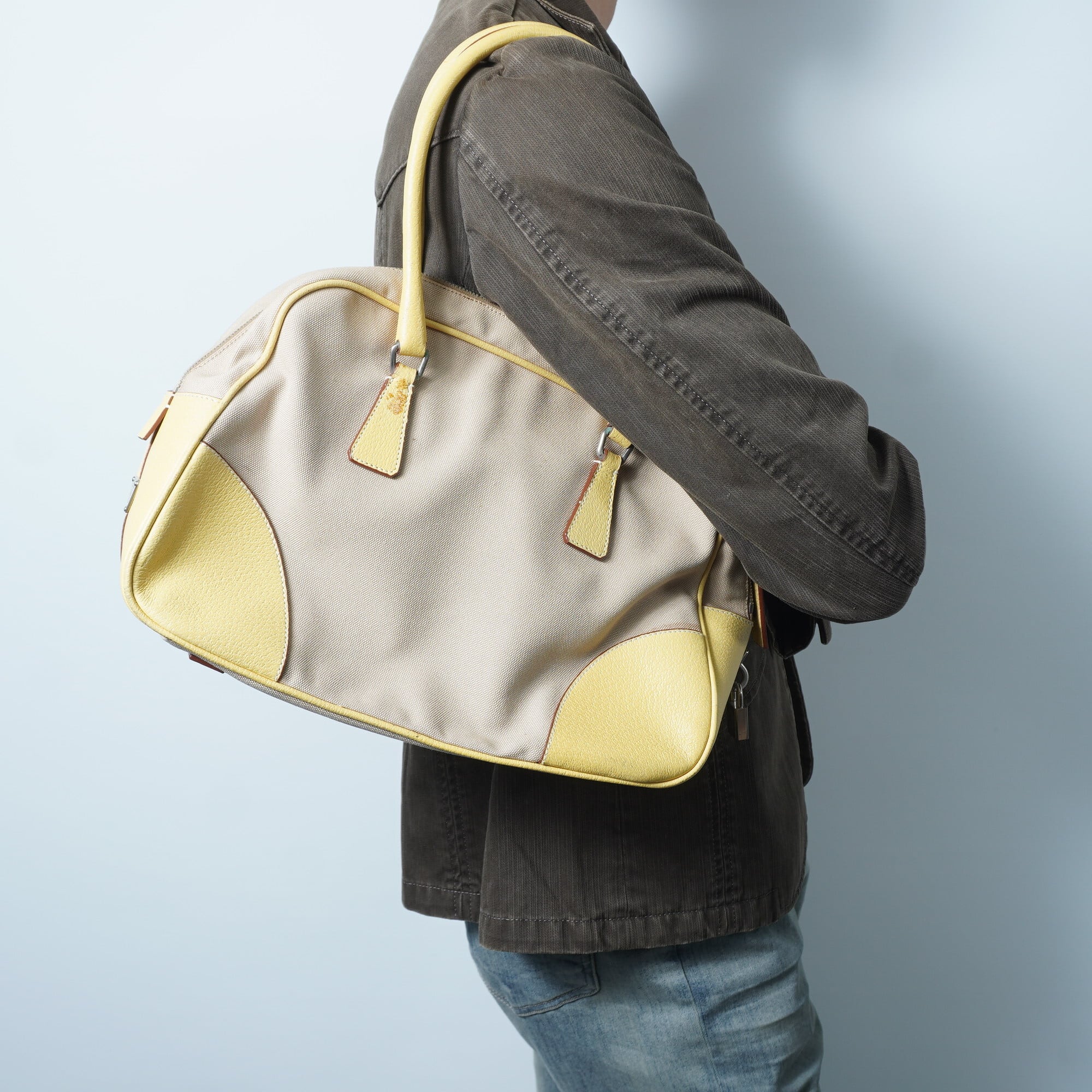 【PRADA】プラダ 三角プレート キャンバス×レザー切替ハンドバッグ yellow