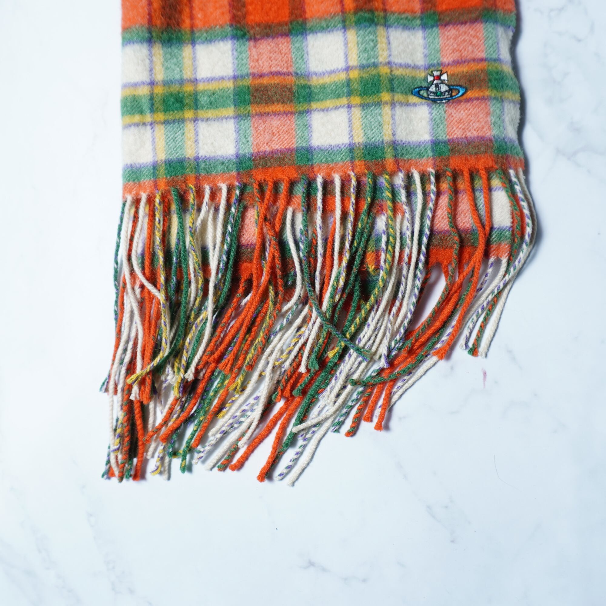 【Vivienne Westwood】ヴィヴィアンウエストウッド "オーブロゴ刺繍” チェック柄カシミアフリンジマフラー orange & green & white