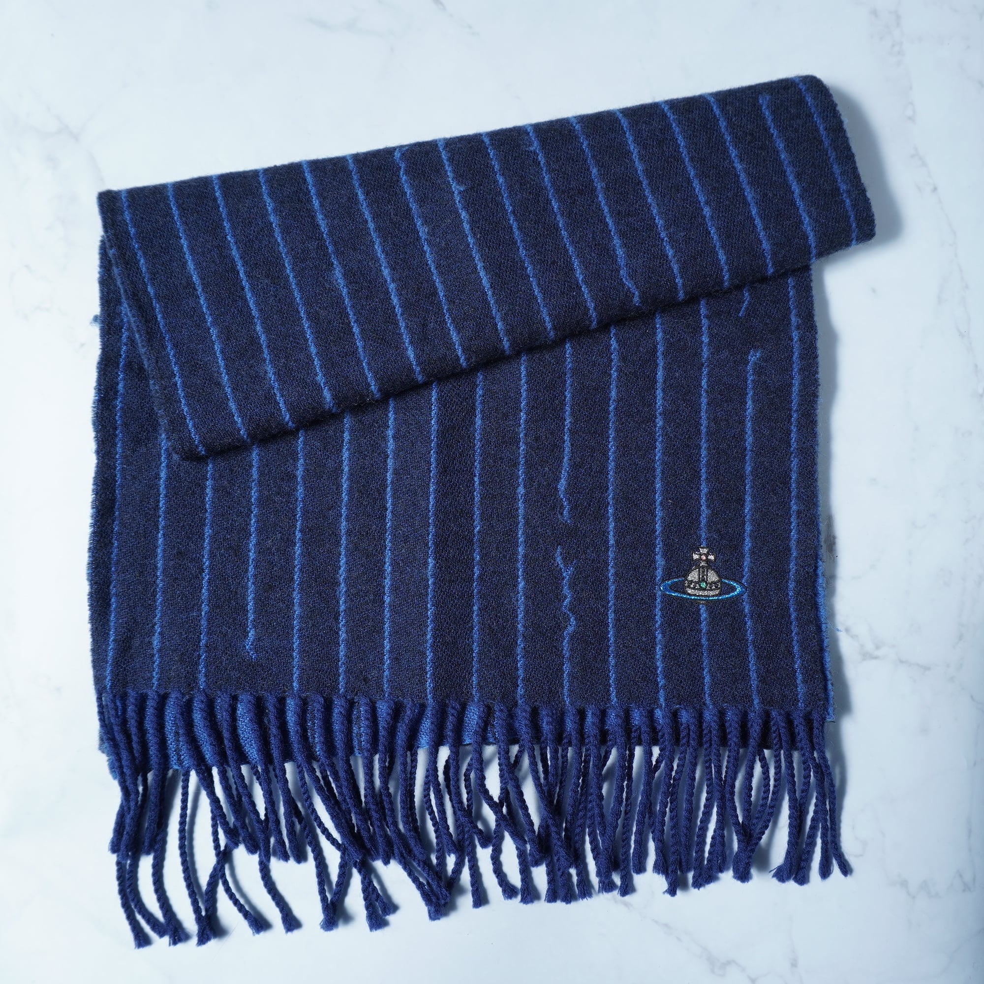 【Vivienne Westwood】ヴィヴィアンウエストウッド "オーブロゴ刺繍”ストライプウールマフラー navy & blue