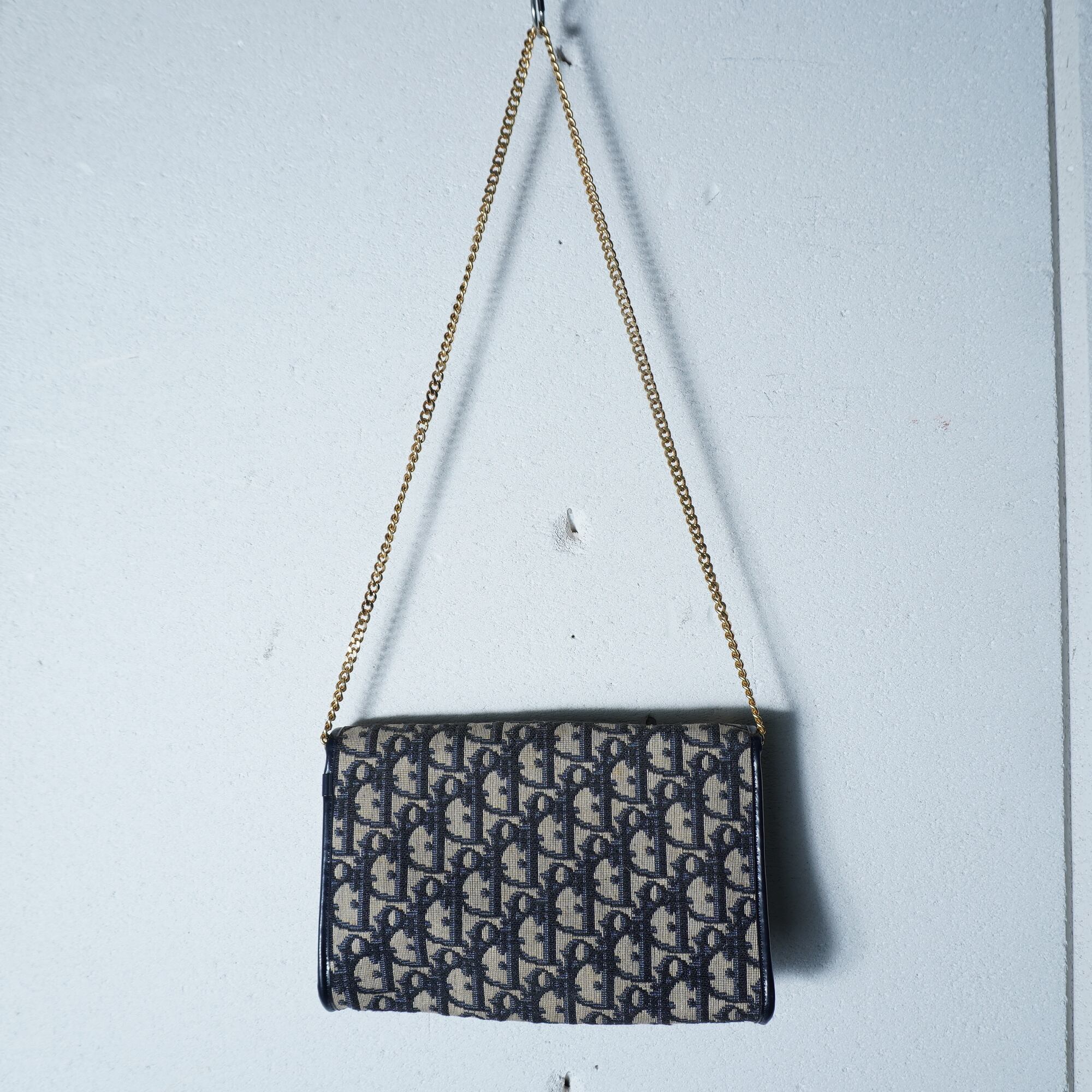 【Christian Dior】クリスチャンディオール ”トロッター柄” ゴールドロゴ・ゴールドチェーンワンショルダーバッグ navy&beige
