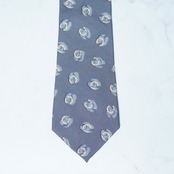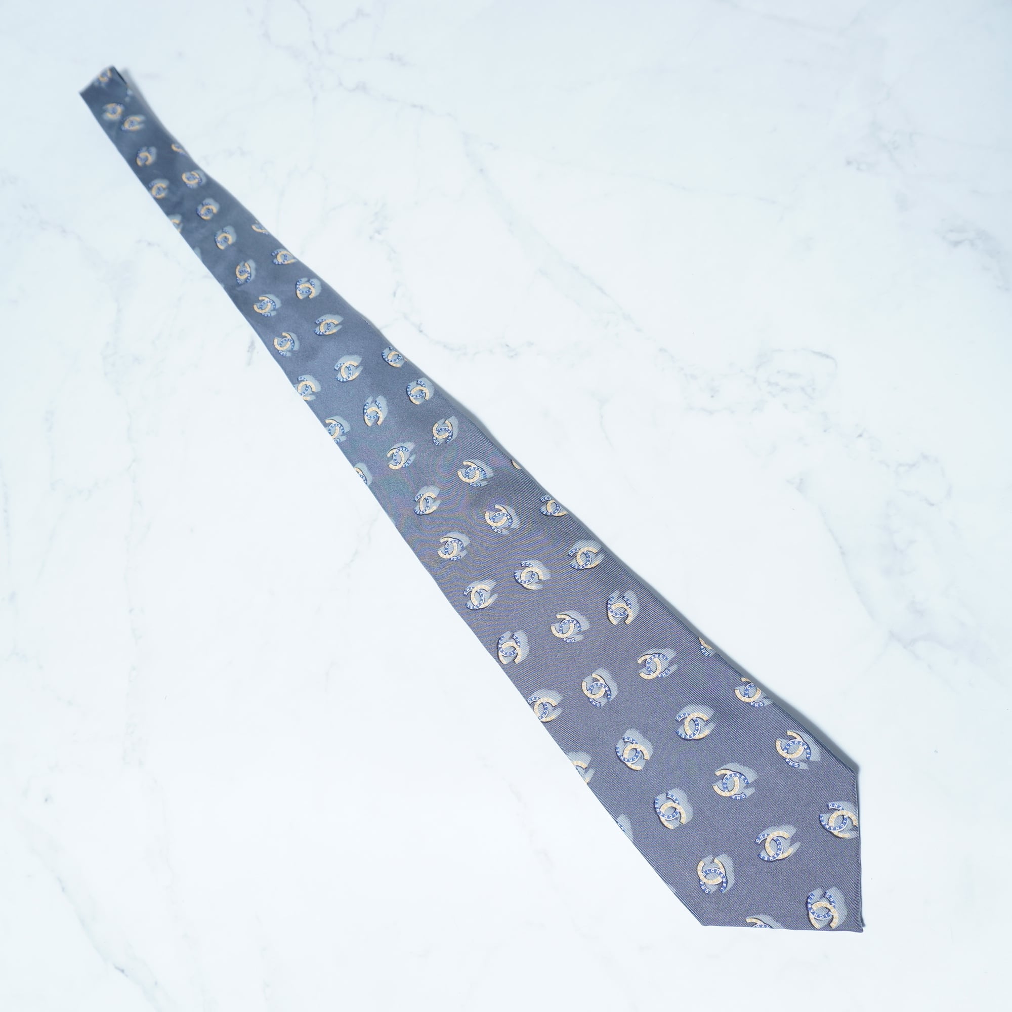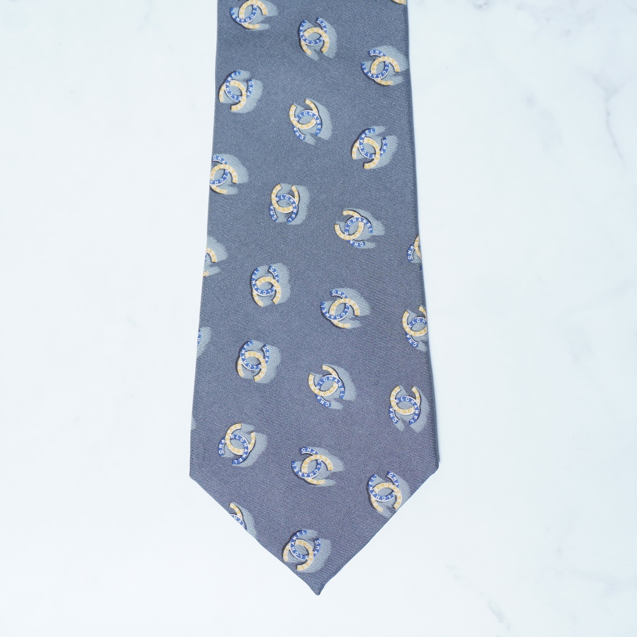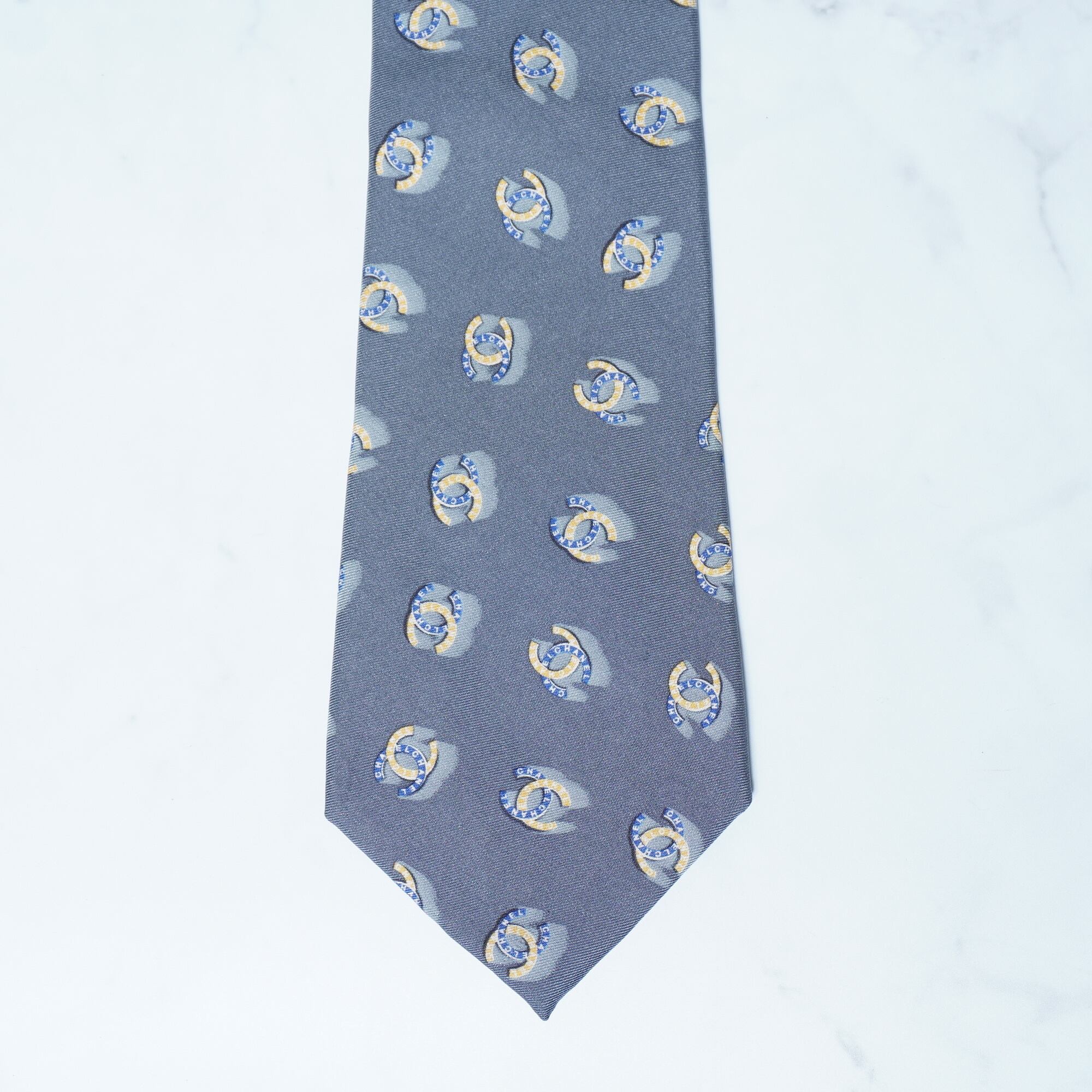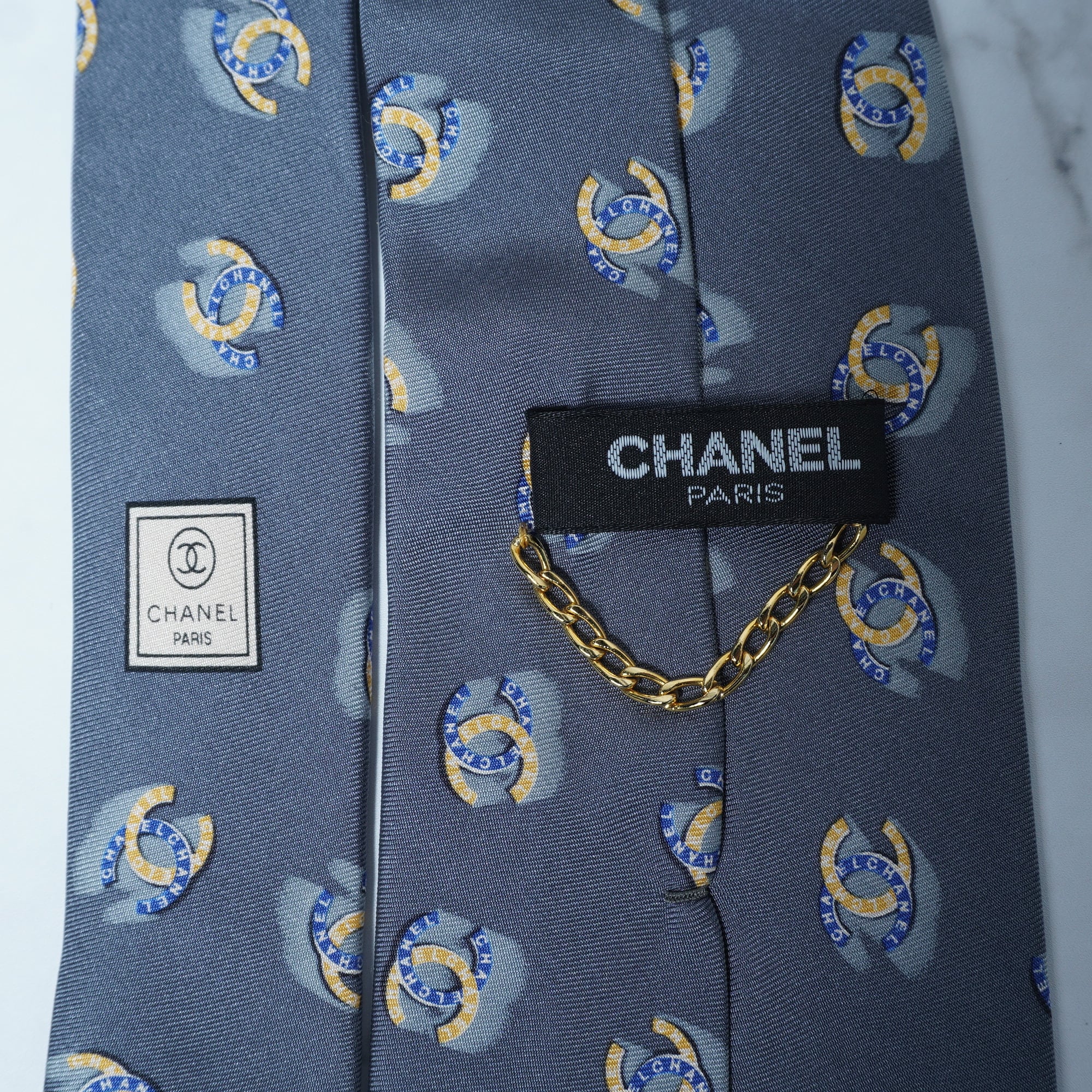 【CHANEL】シャネル シルク100% ゴールド・チェーン・ココマーク・ロゴ総柄ネクタイ gray&blue&yellow