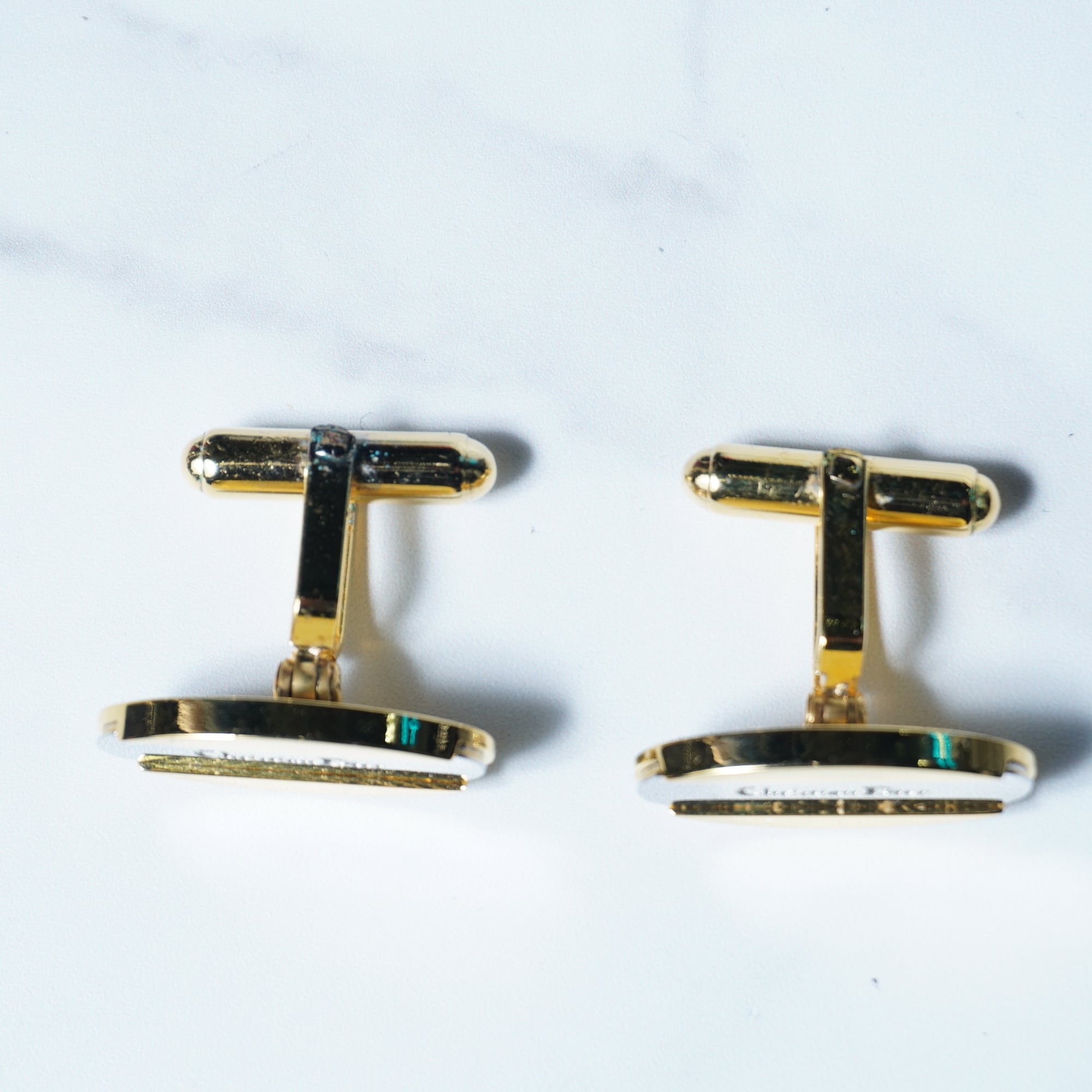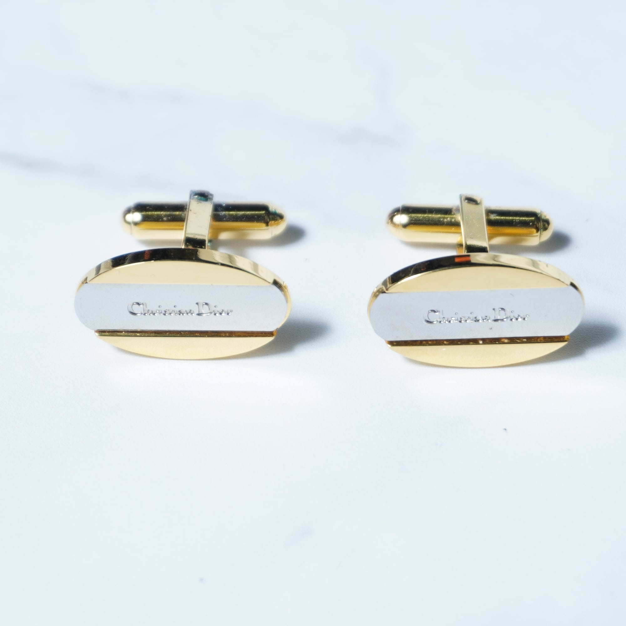 【Christian Dior】クリスチャンディオール "ロゴ入" ツートンカラータイピン・カフスピンセット 箱付き silver&gold