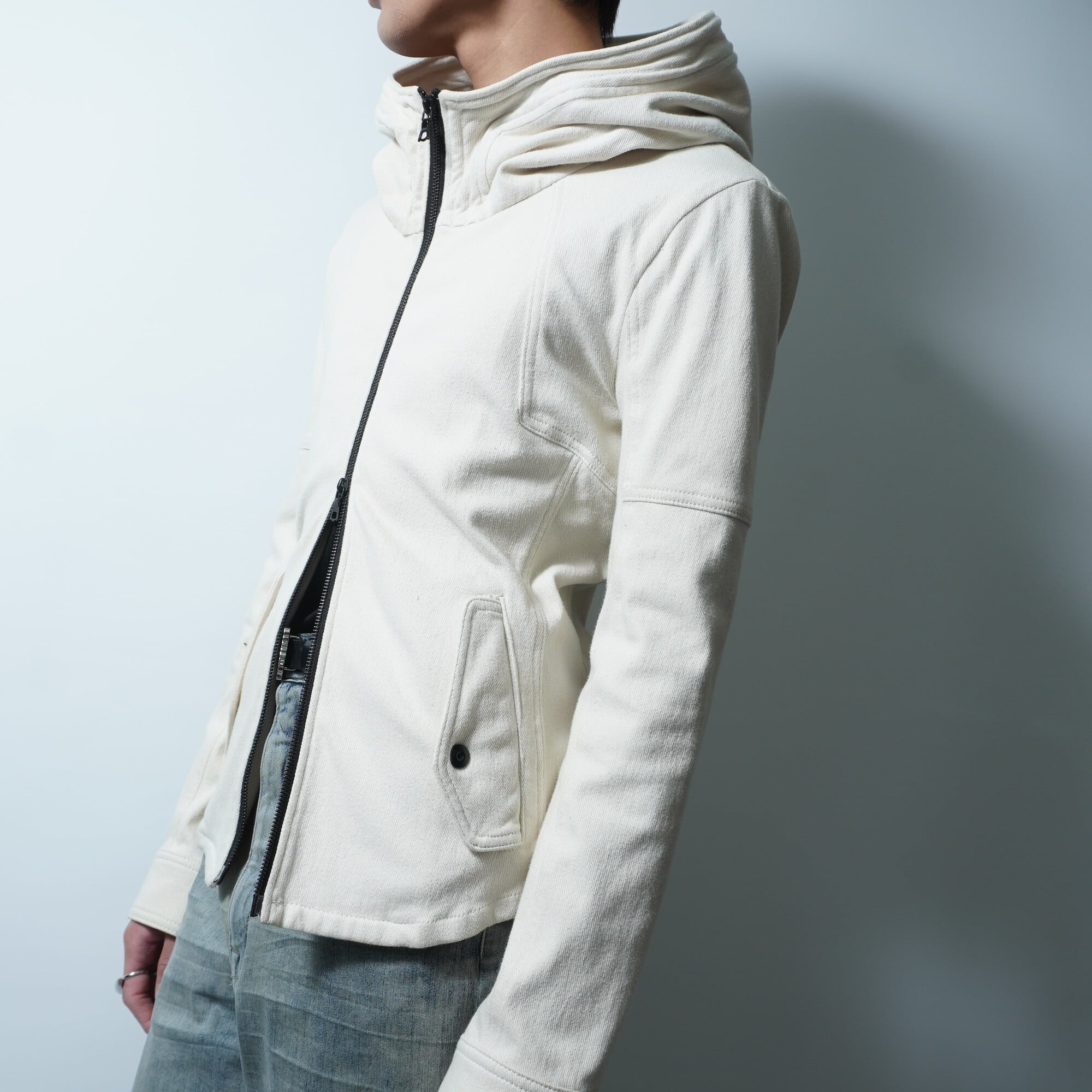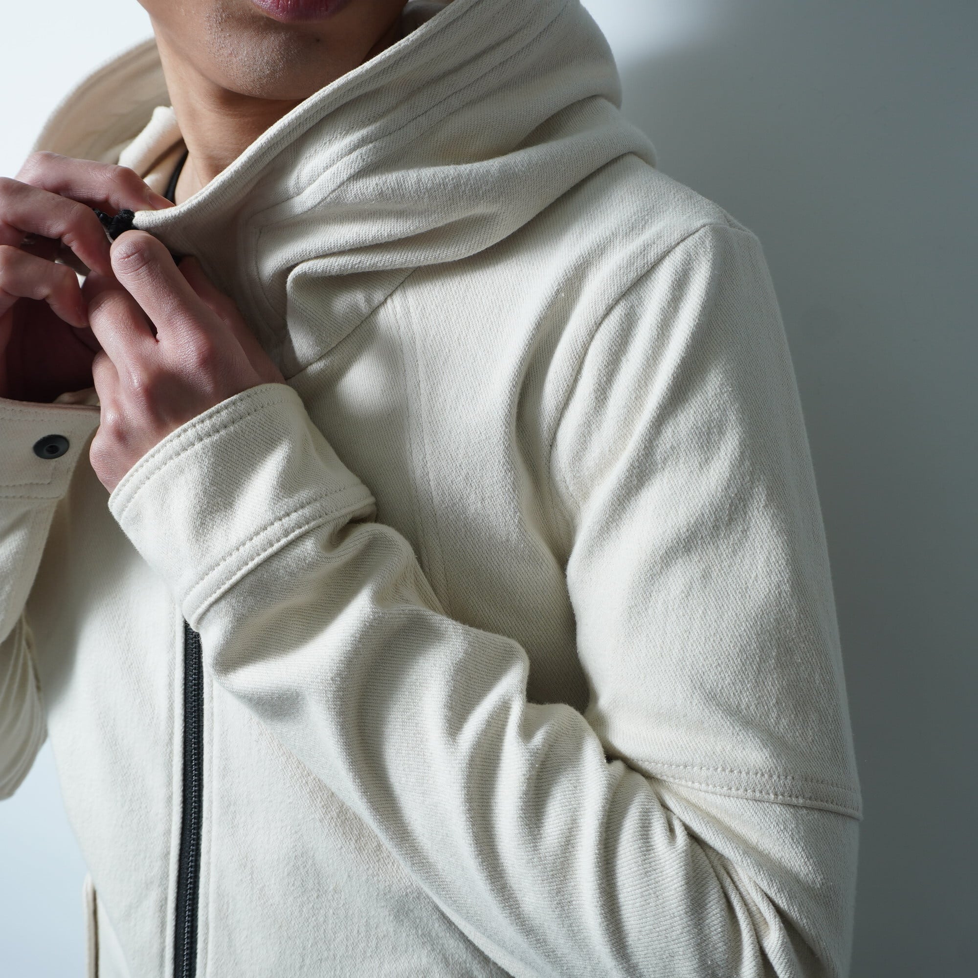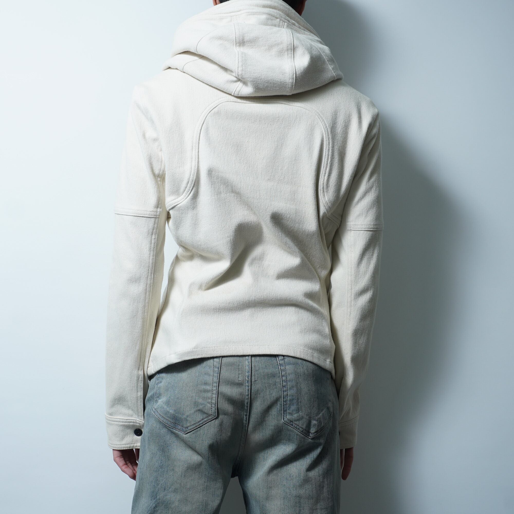 ・洗練されたデザインのニットデニムを使用した【NO ID.】ノーアイディ 14's ニットデニムZIPUPフーデッドブルゾン ivory