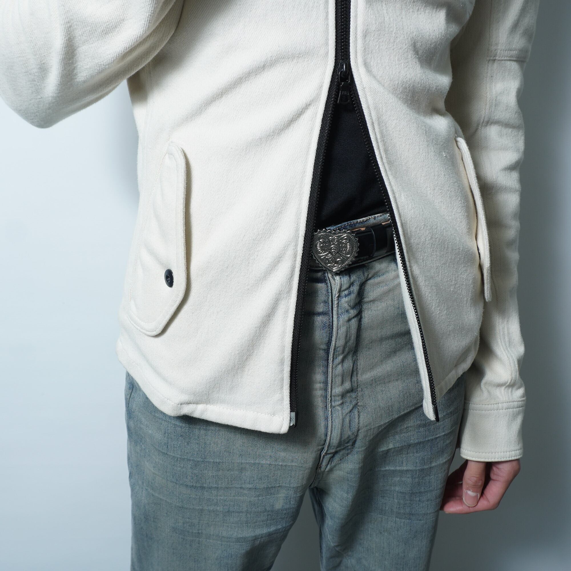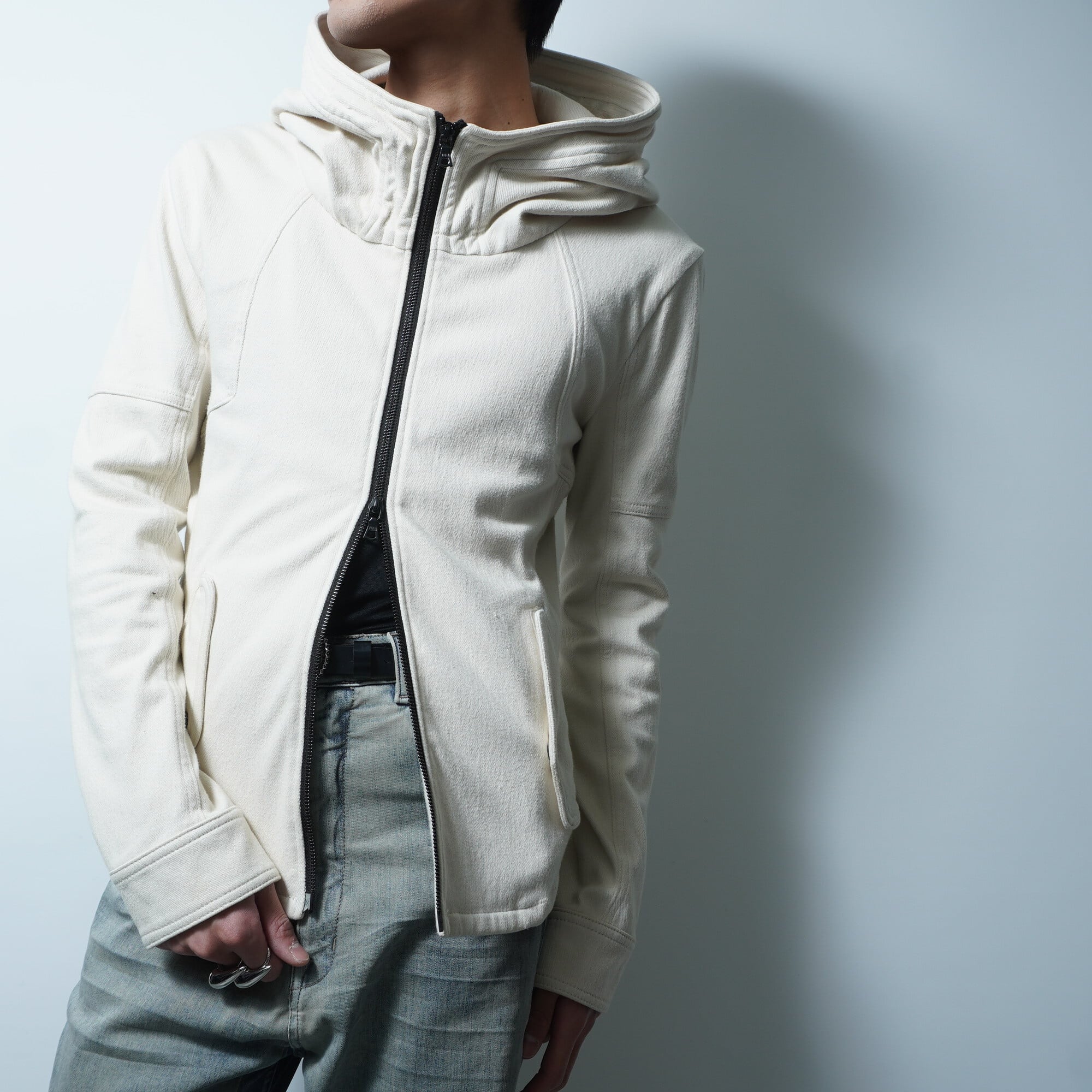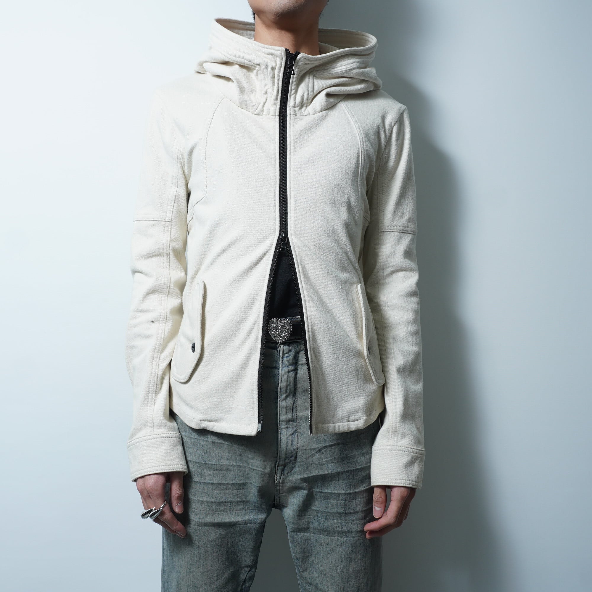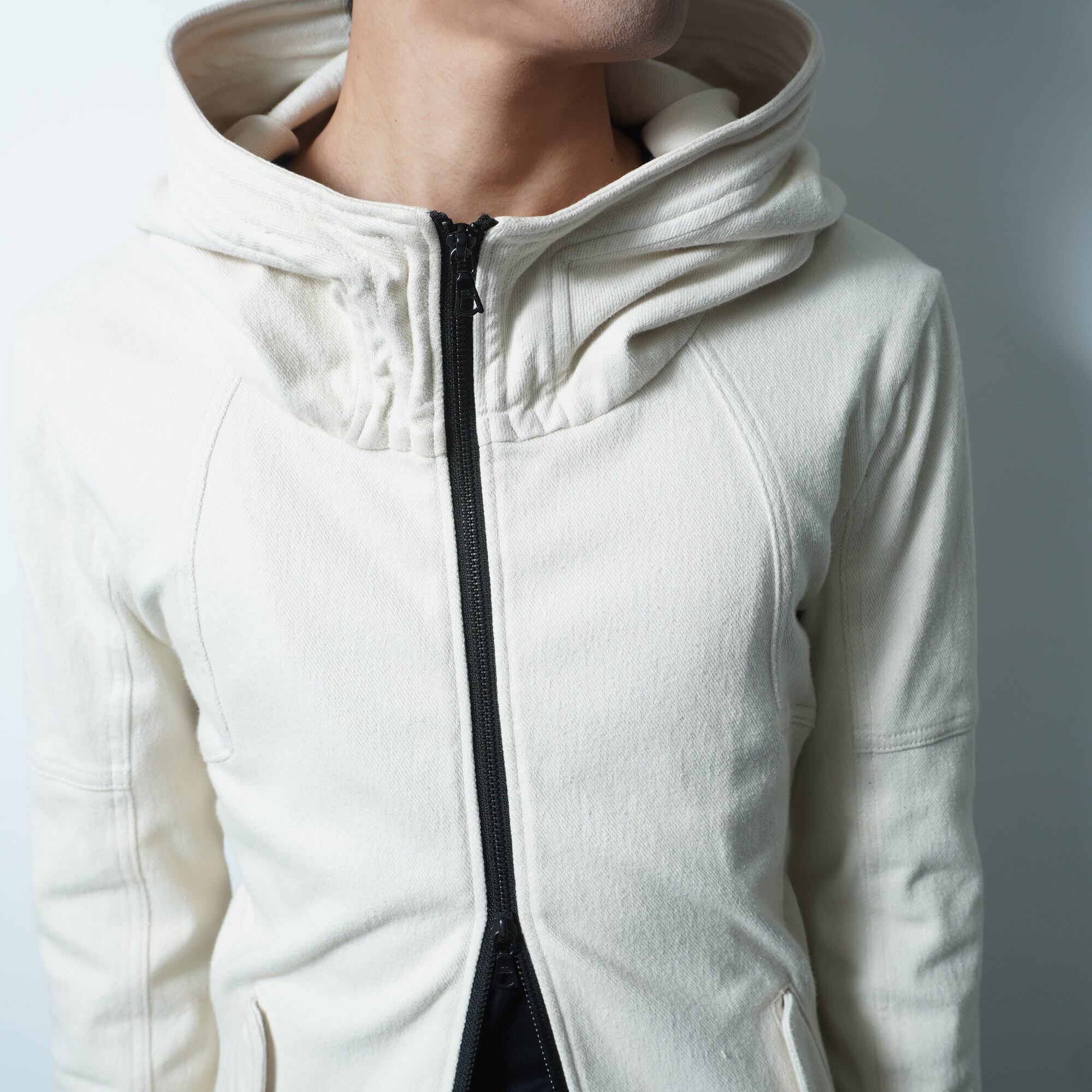・洗練されたデザインのニットデニムを使用した【NO ID.】ノーアイディ 14's ニットデニムZIPUPフーデッドブルゾン ivory