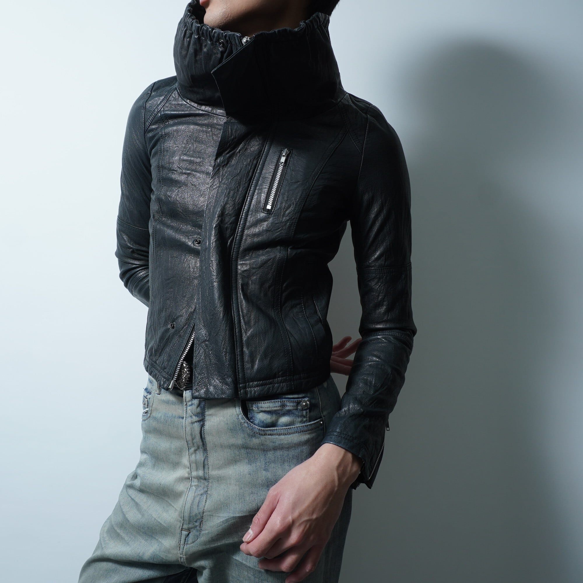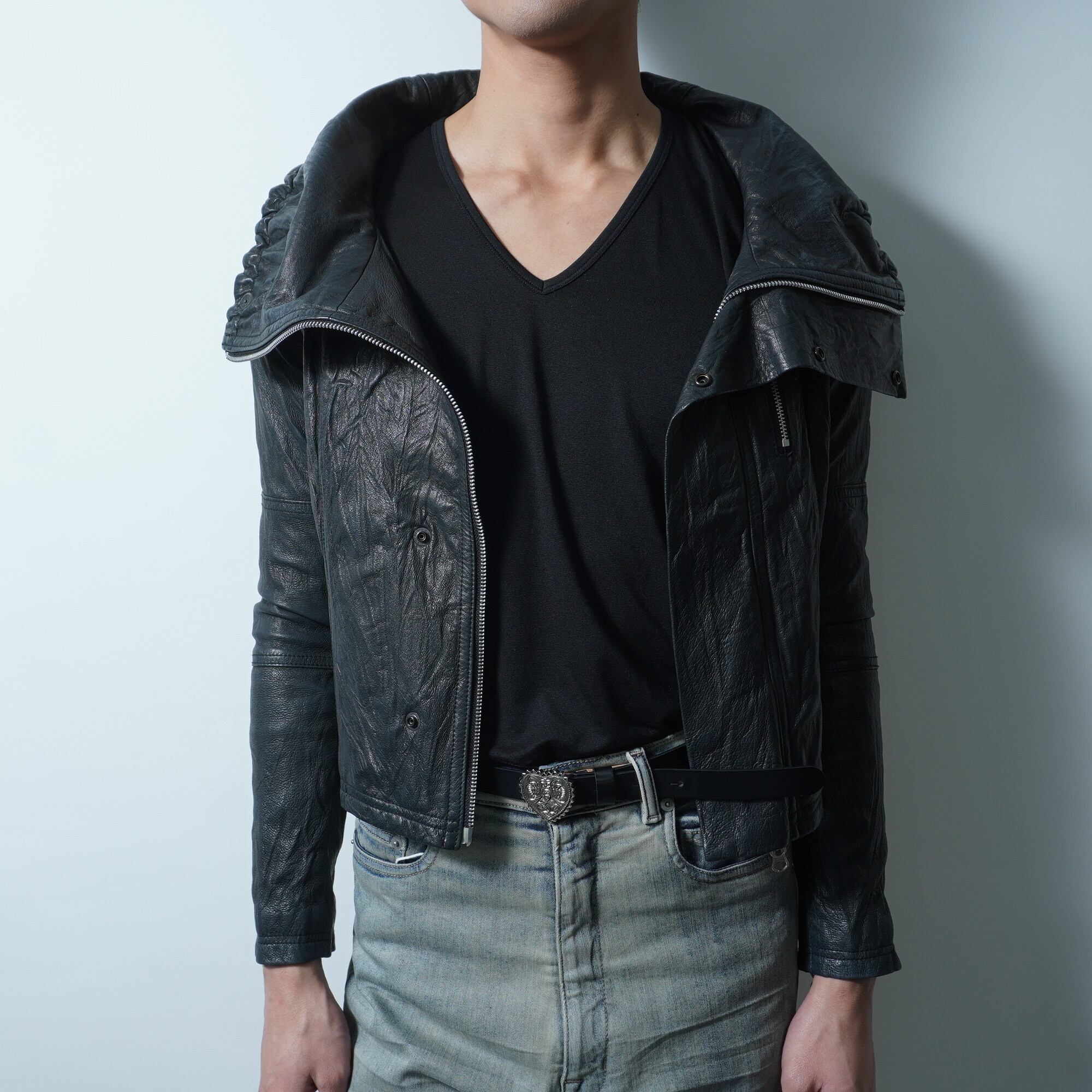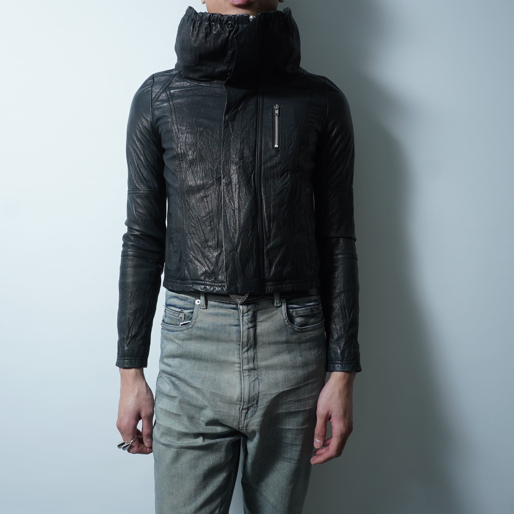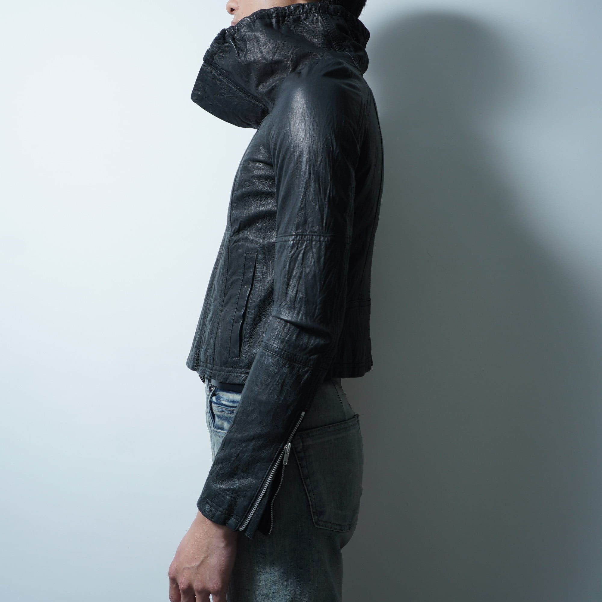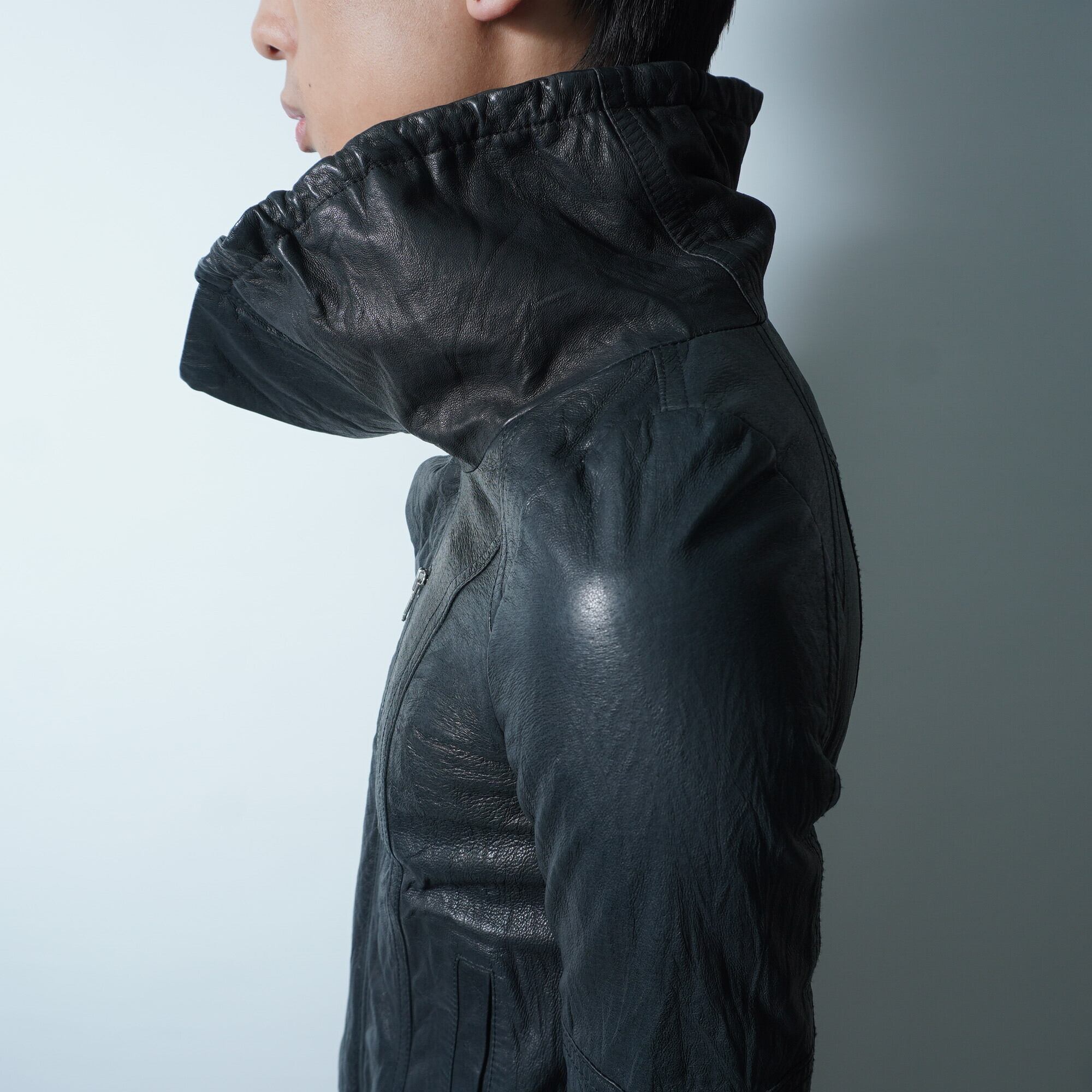 【paper chest】ペーパーチェスト シワ加工豚革ハイネックジャケット black