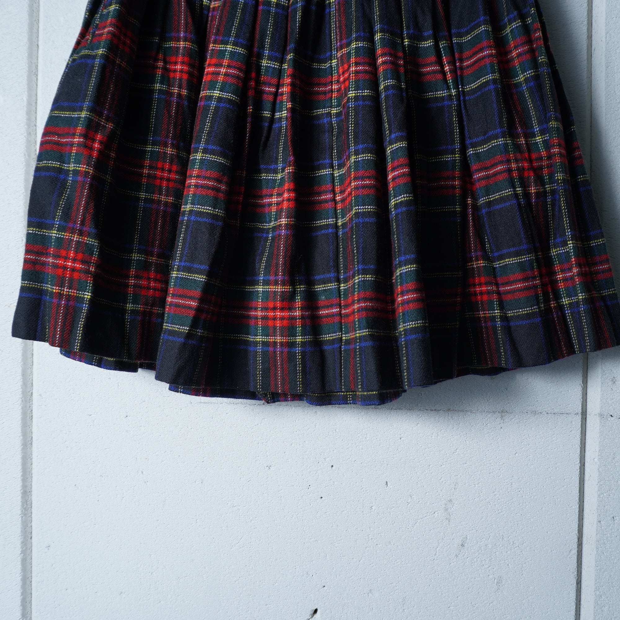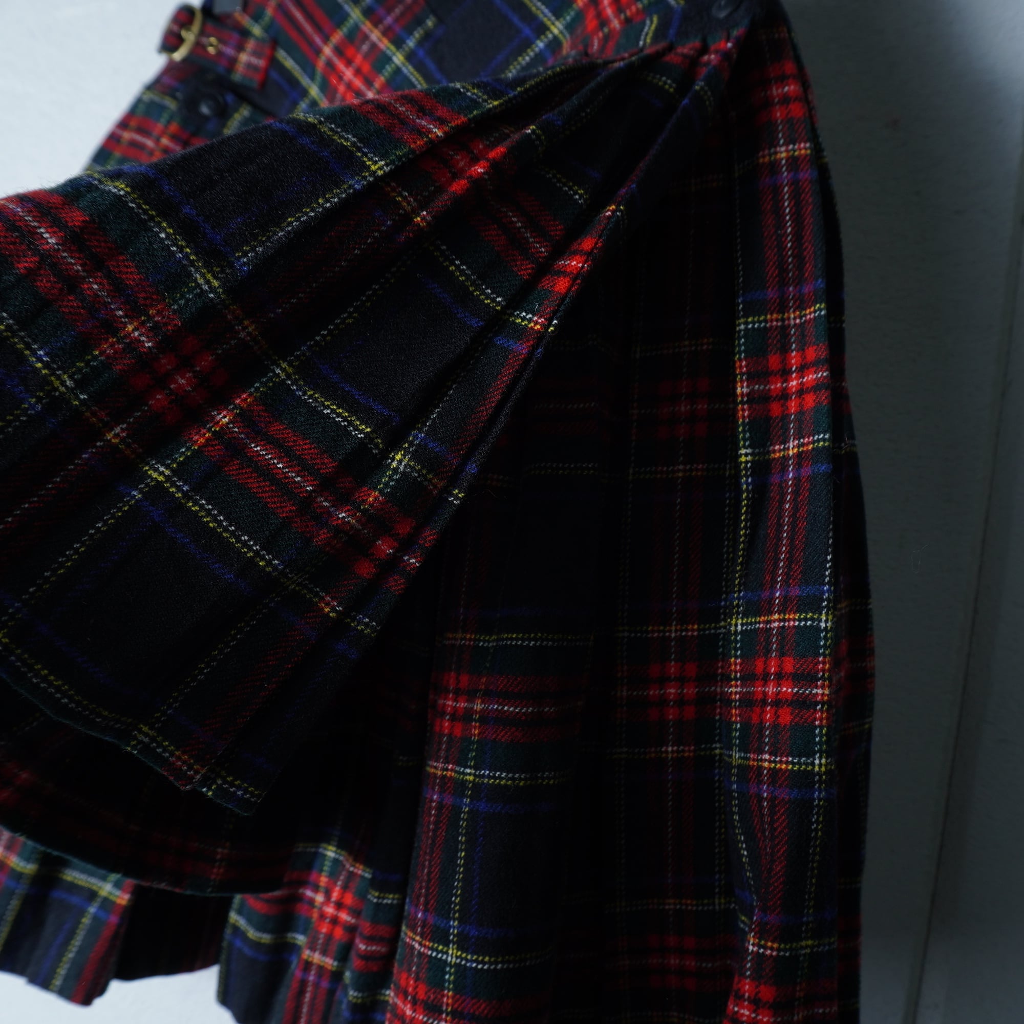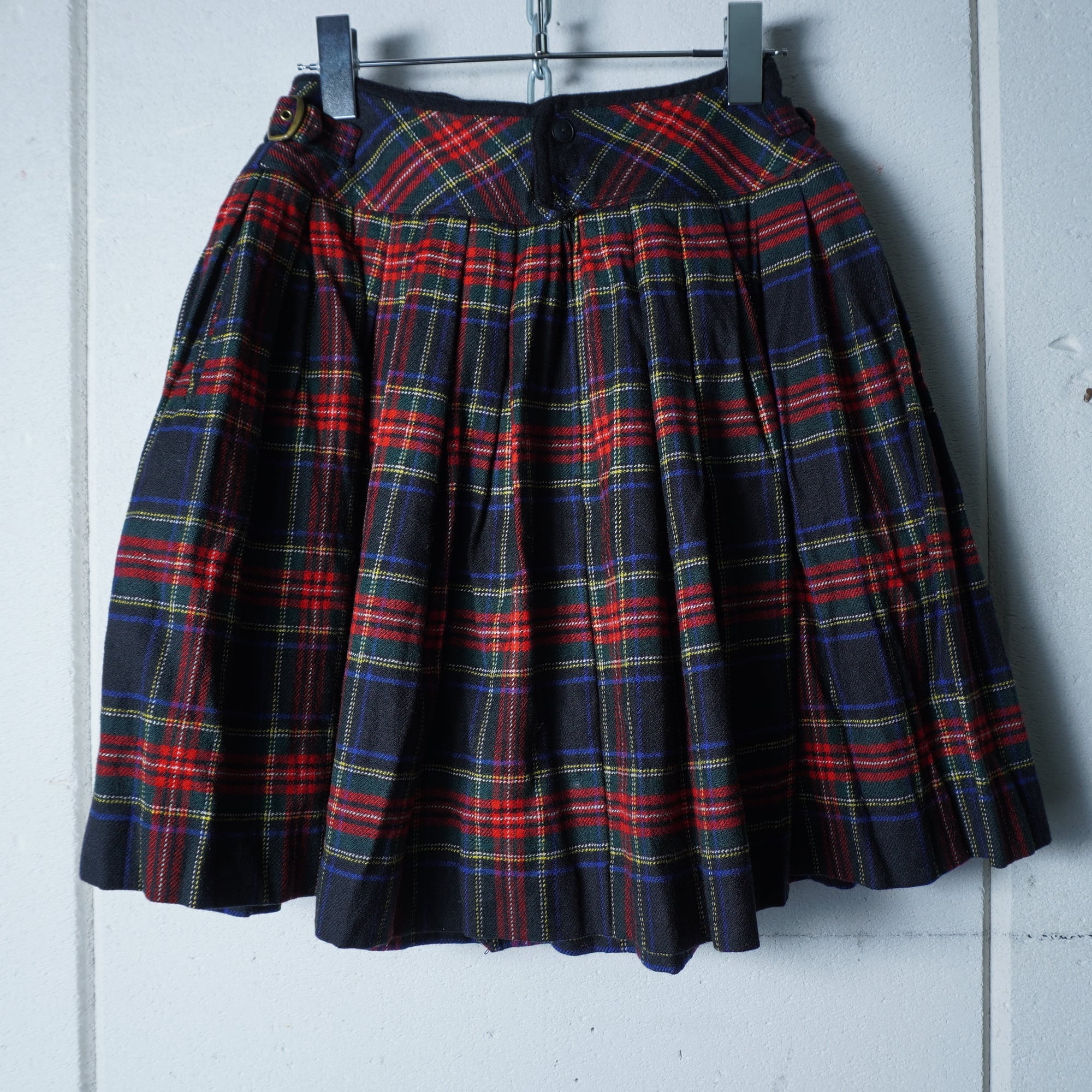 ・魅力的なフラップデザインのウールプリーツスカート