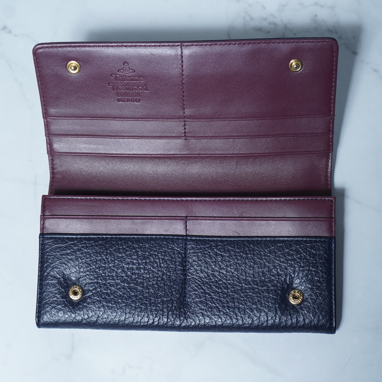 【Vivienne Westwood】ヴィヴィアンウエストウッド オーブロゴ シボ加工レザーロングウォレット navy
