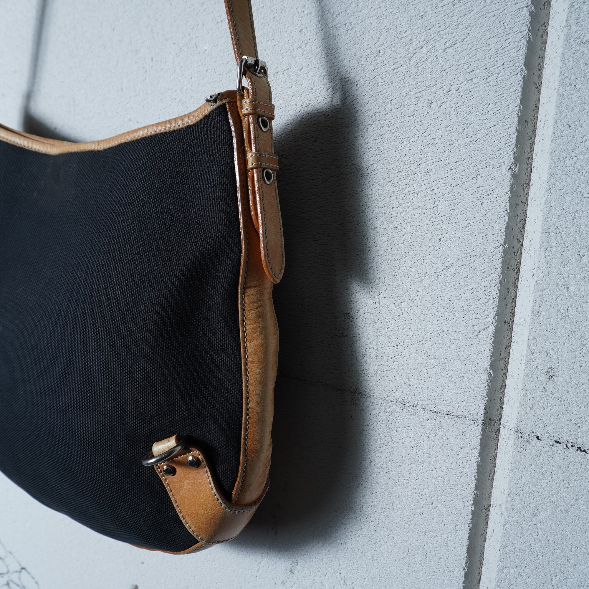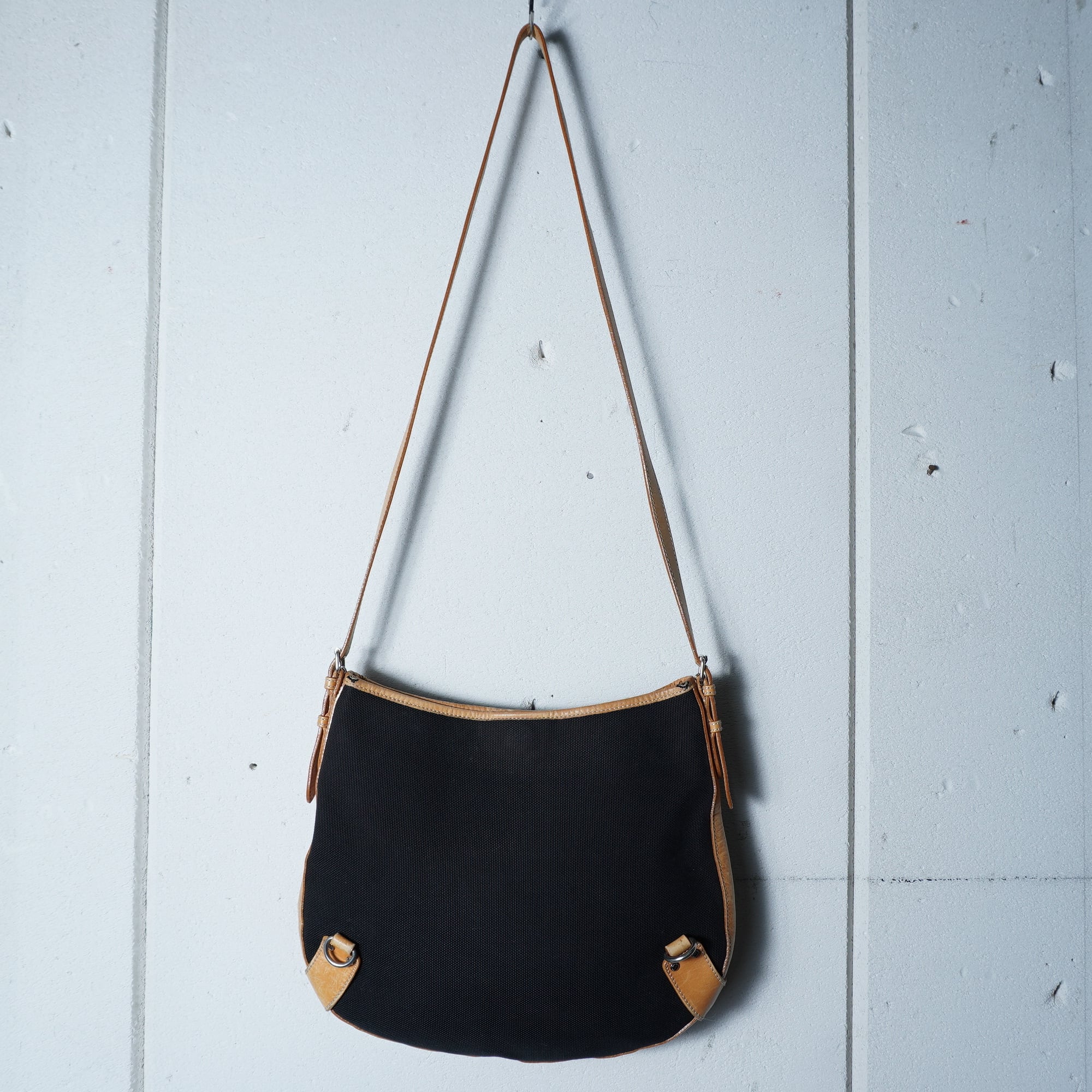 【BURBERRY】バーバリー "ホースロゴ刺繍” レザー切替キャンバスショルダーバッグ black&brown