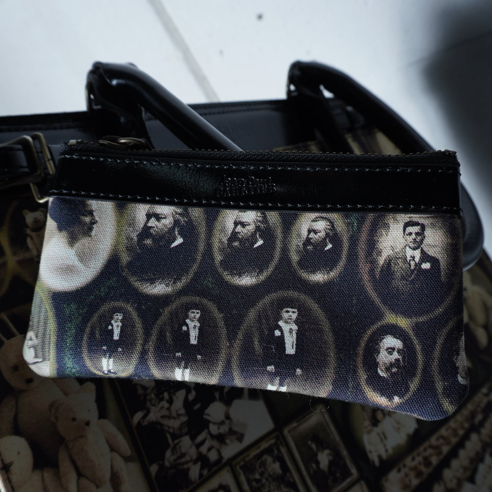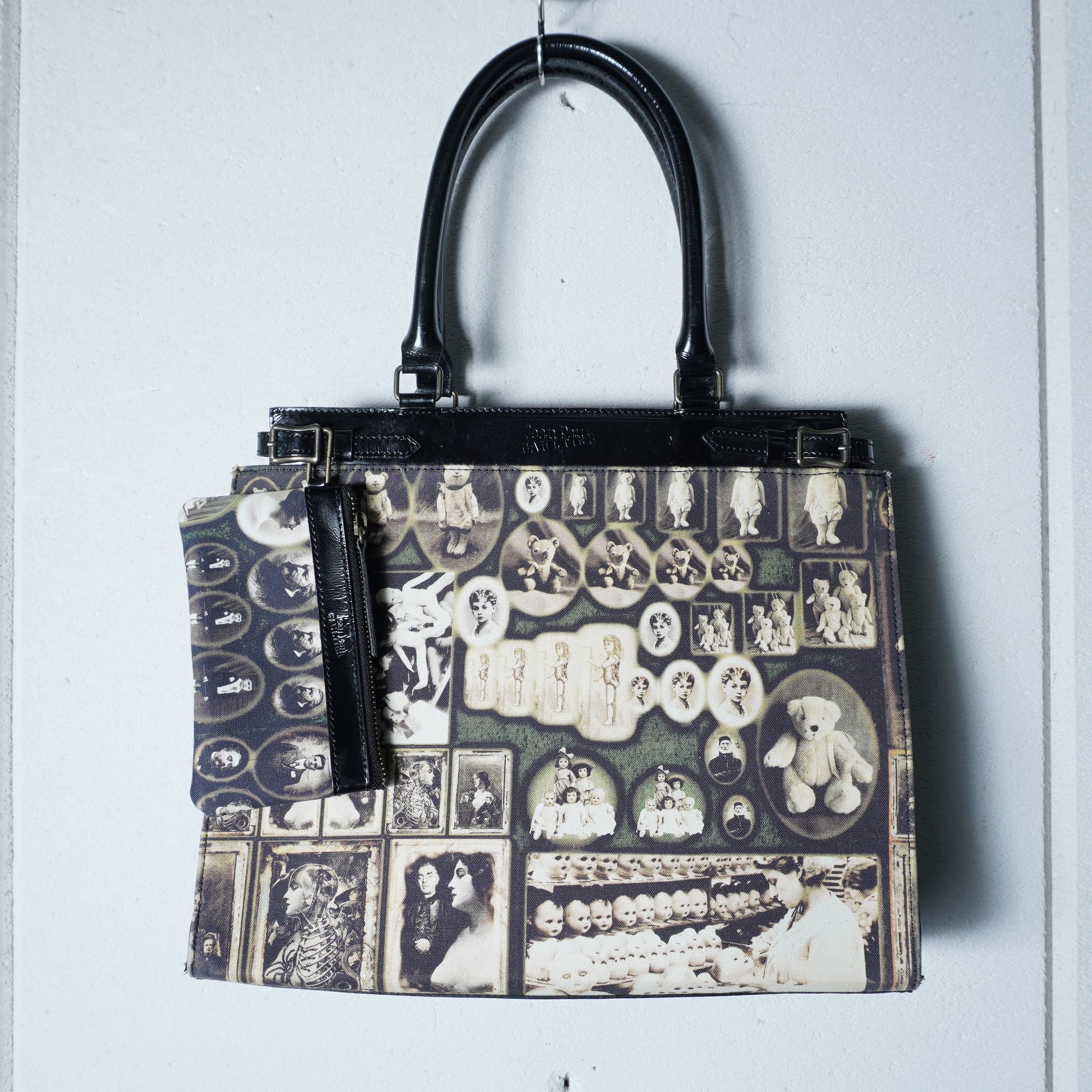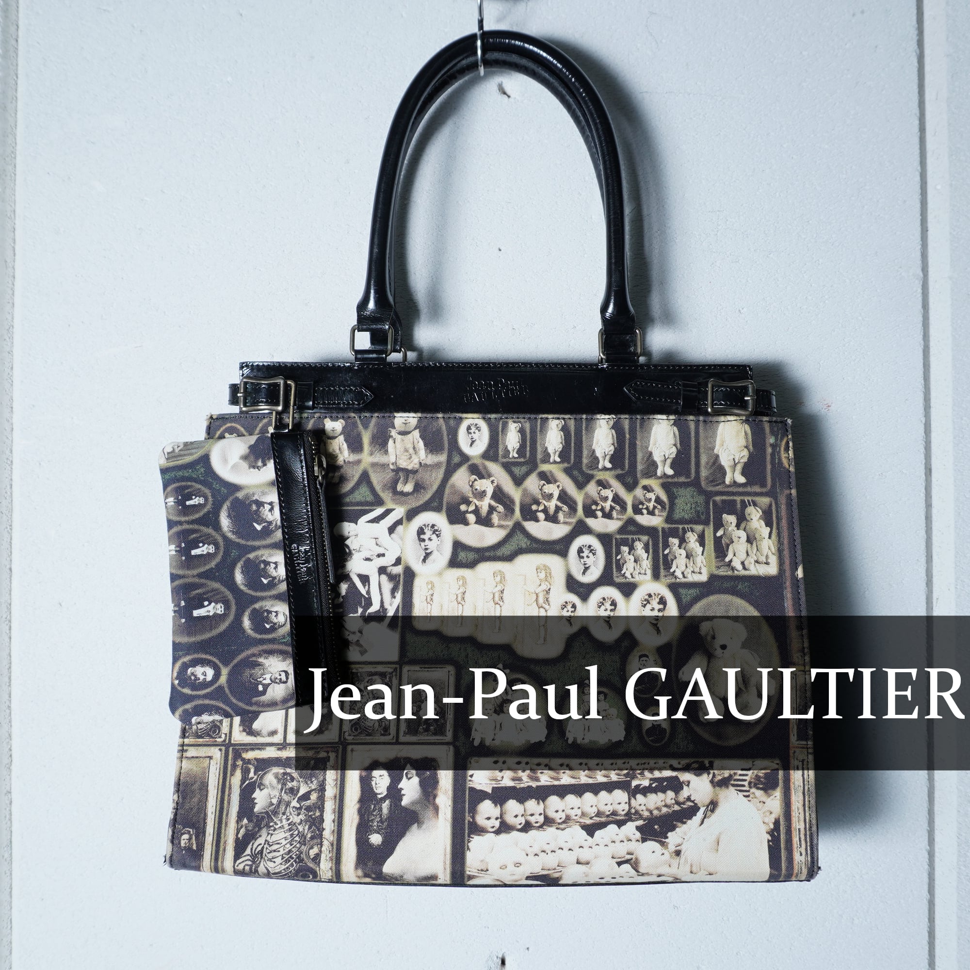 【Jean Paul GAULTIER】ジャンポールゴルチエ ”ロゴ入””ARCHIVE"ミニポーチ付アンティークドール&テディベア柄トートバッグ black&beige&red