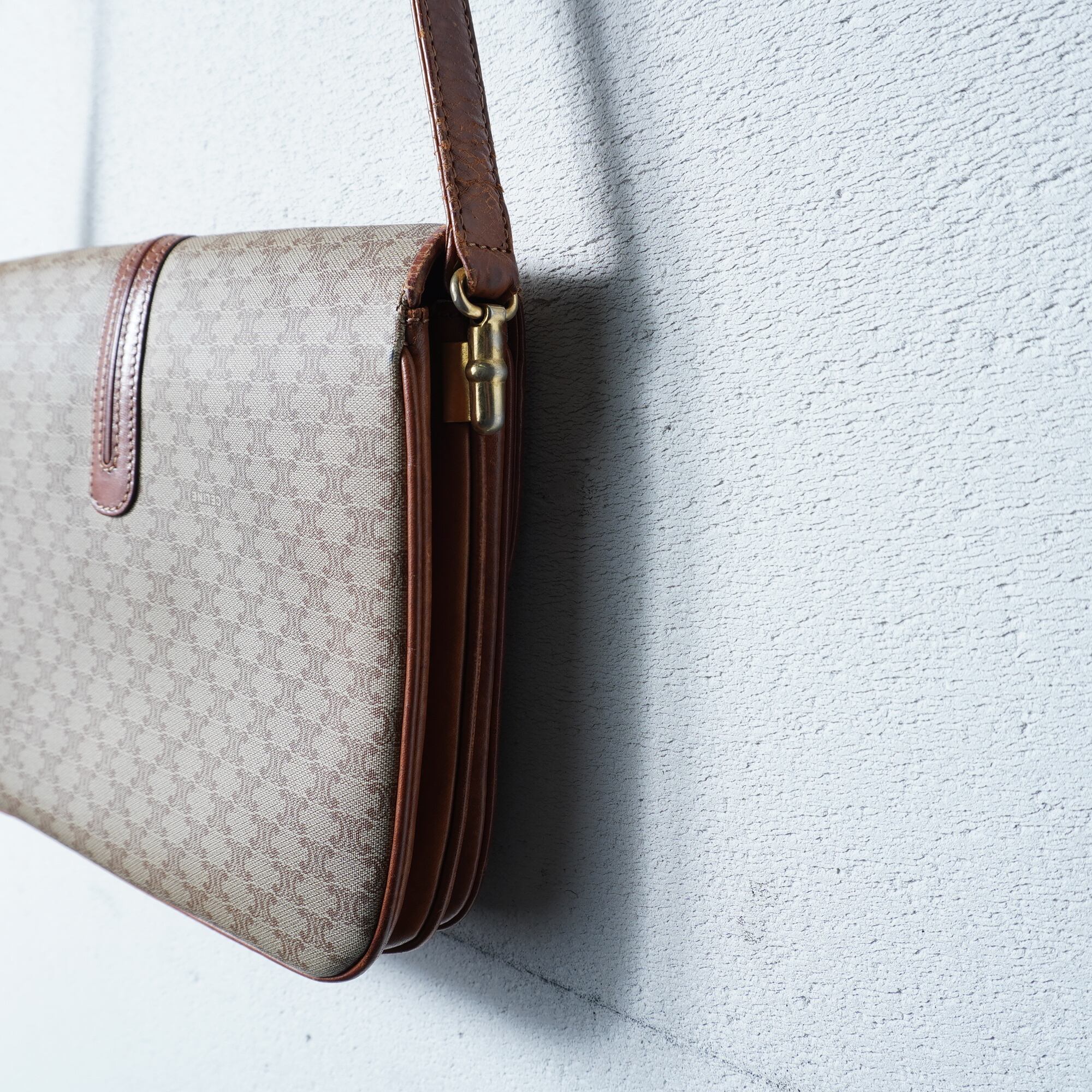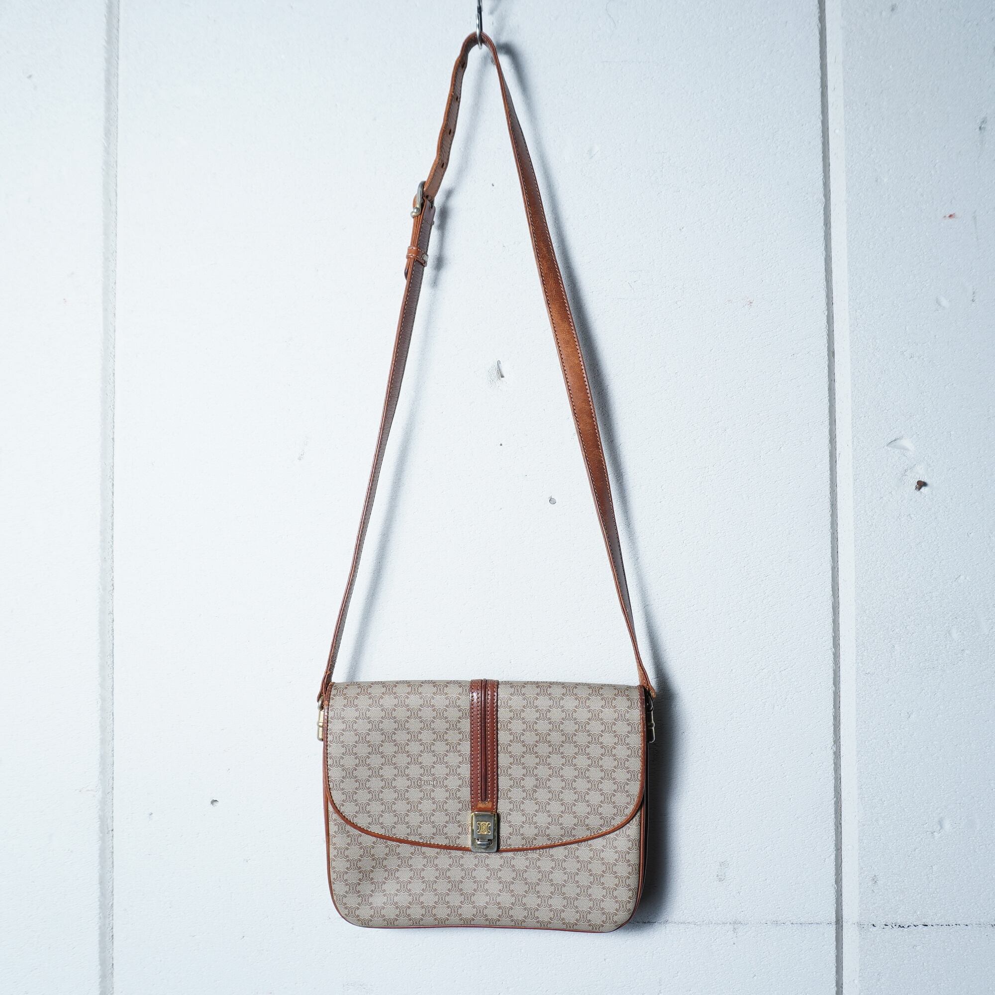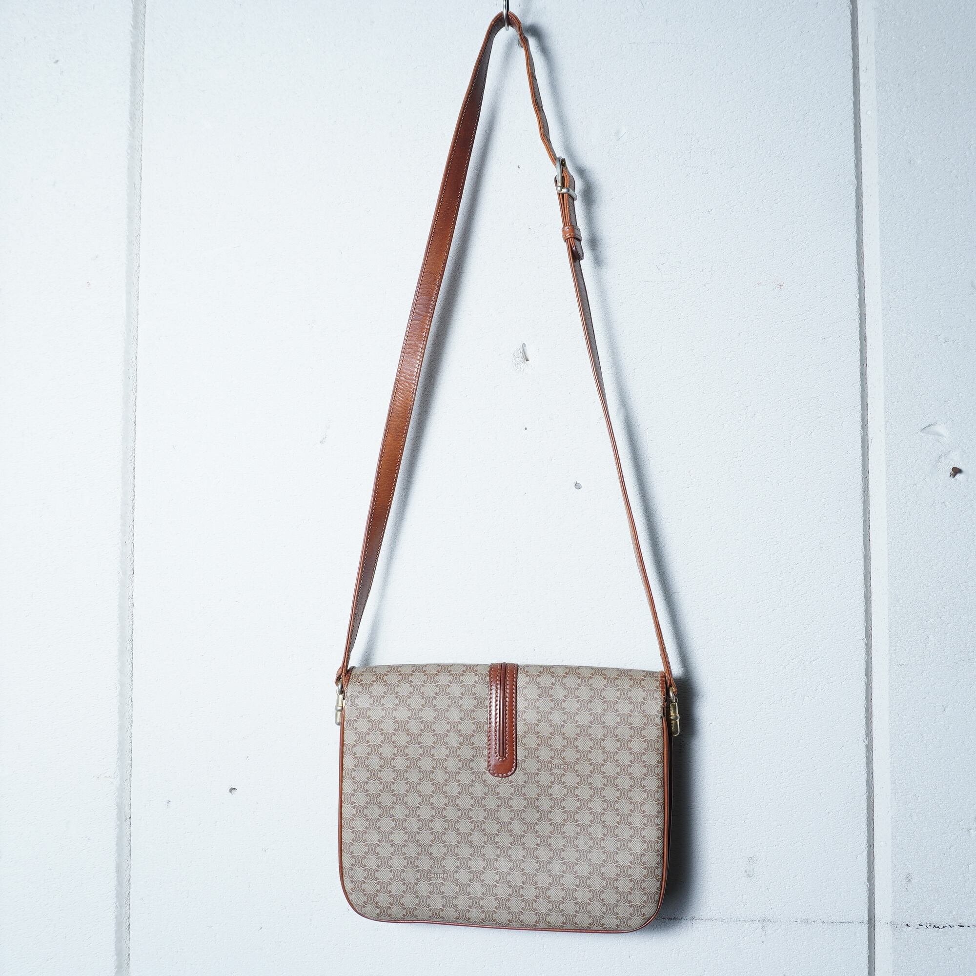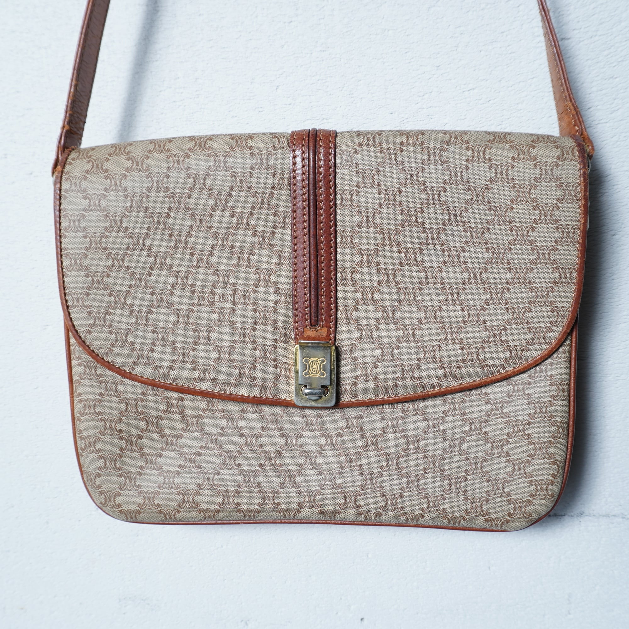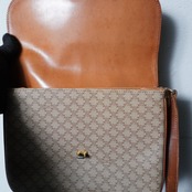 【CELINE】セリーヌ ”マカダム柄”レザーフラップショルダーバッグ beige & brown