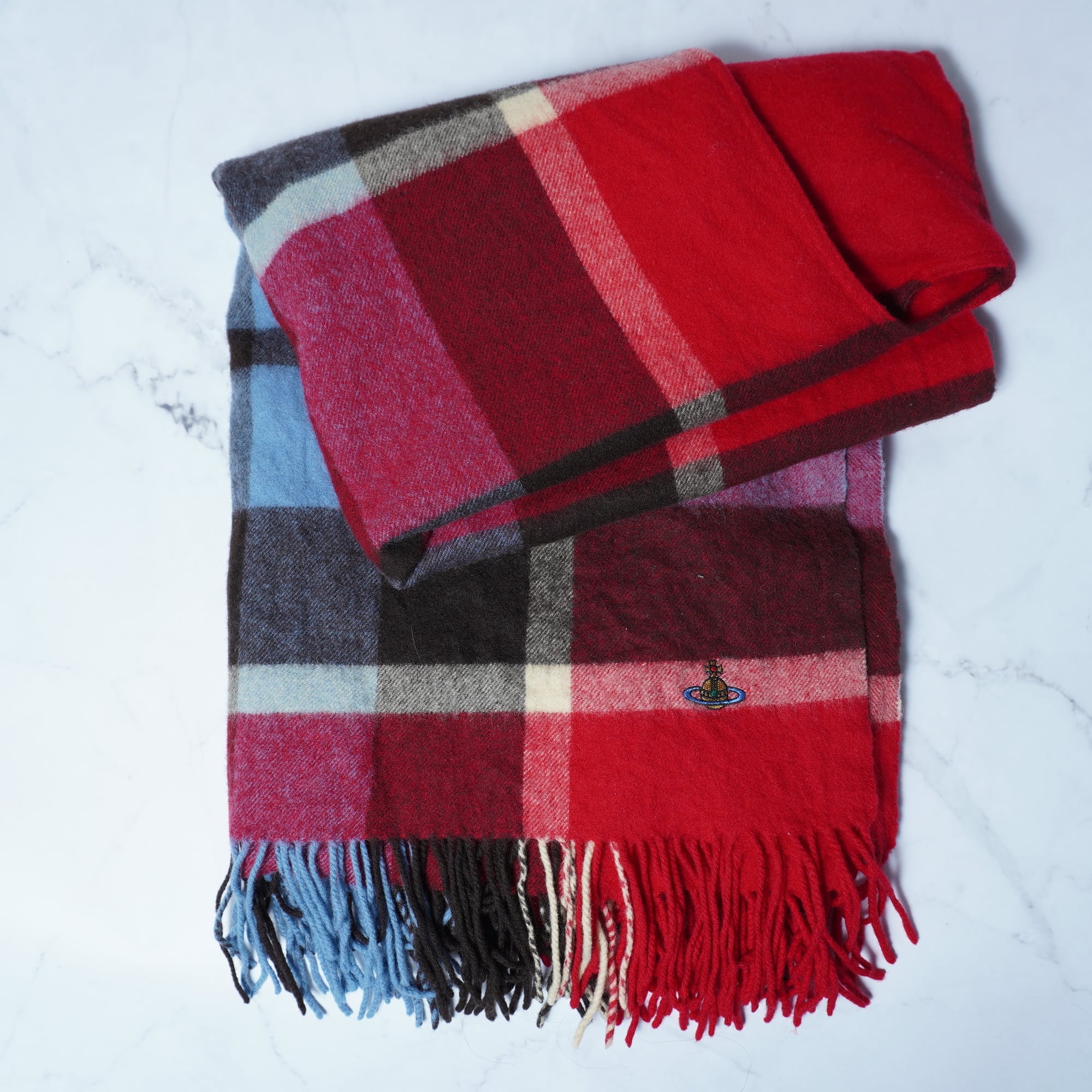 【Vivienne Westwood】ヴィヴィアンウエストウッド ”オーブロゴ刺繍” WOOL100%チェック柄ショールマフラー red&blue&brown