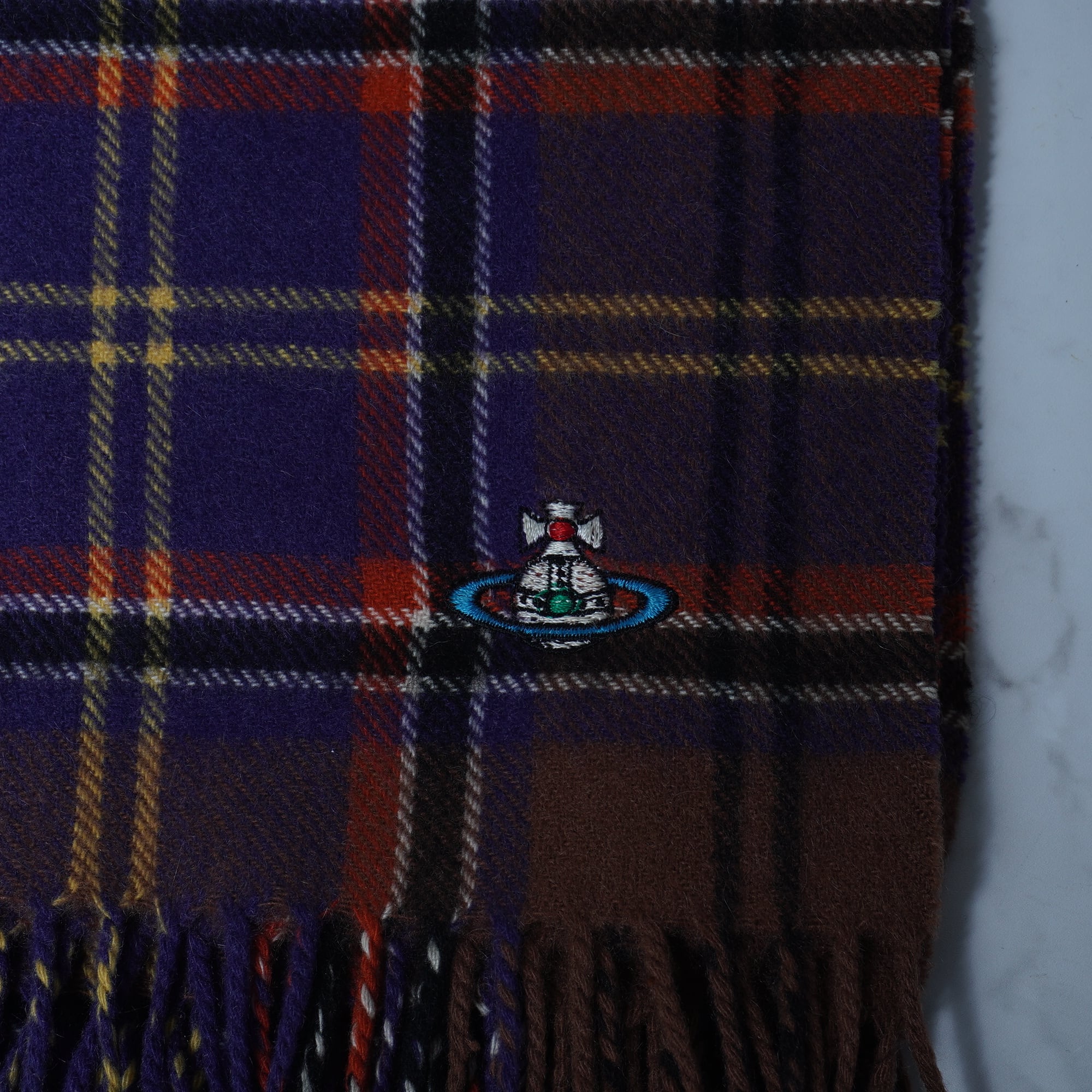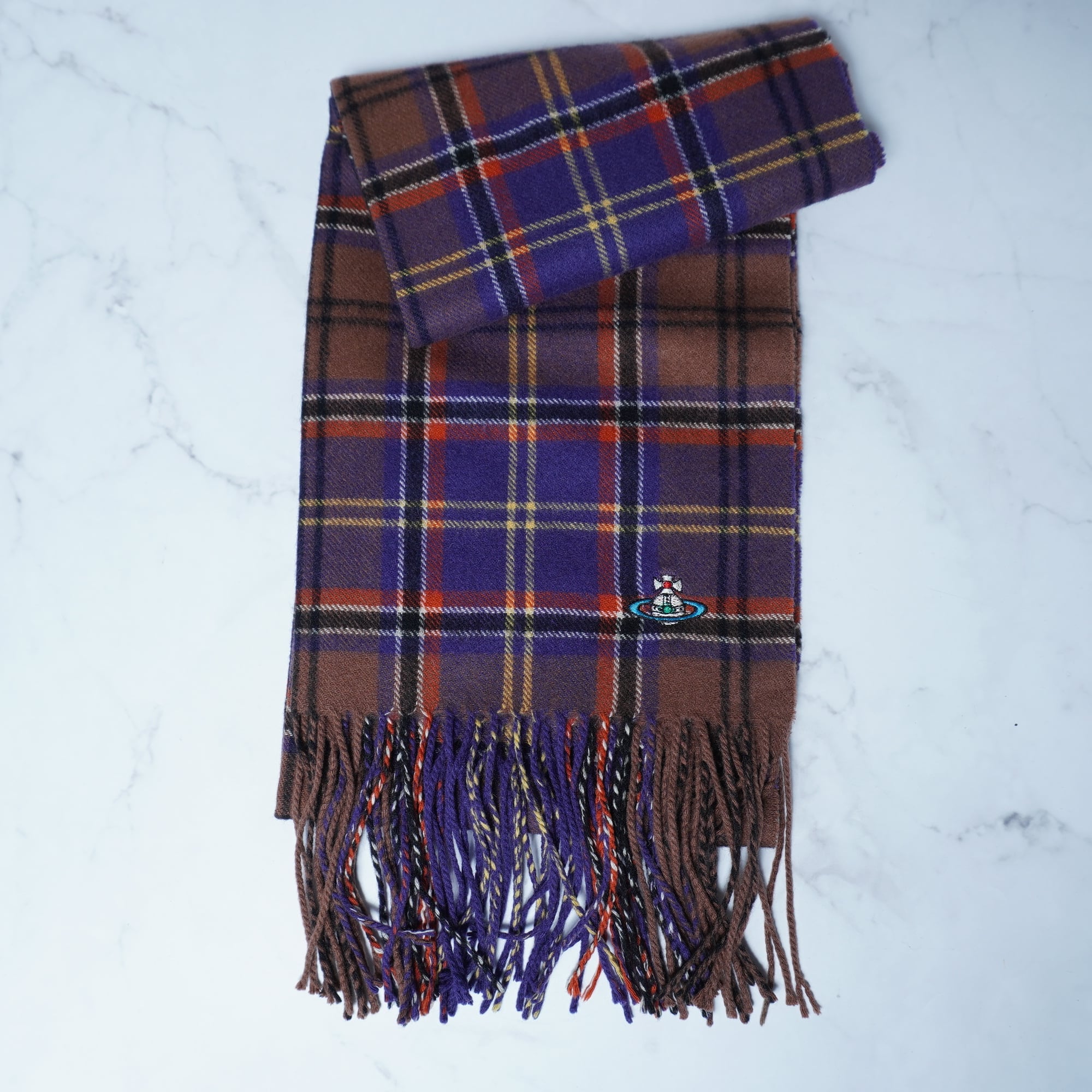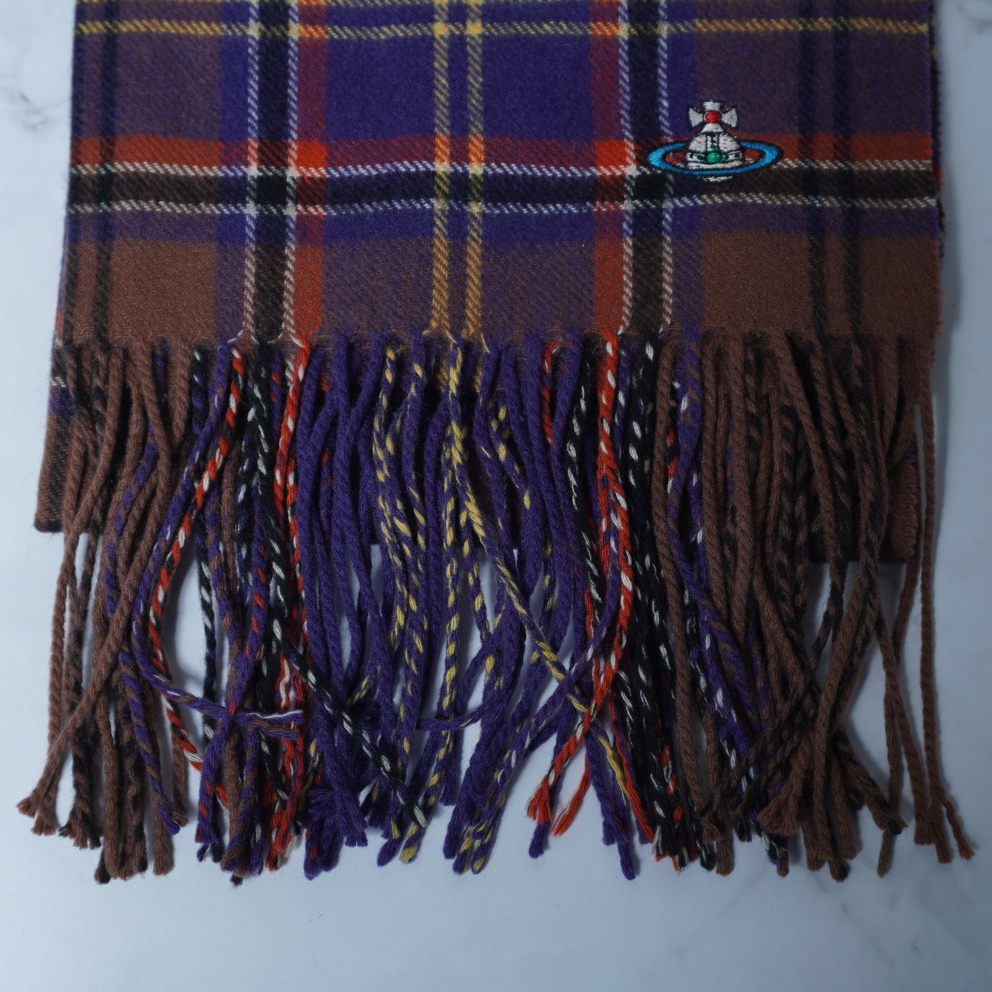 【Vivienne Westwood】ヴィヴィアンウエストウッド ”オーブロゴ刺繍” CASHMERE100%フリンジマフラー purple&brown&orange