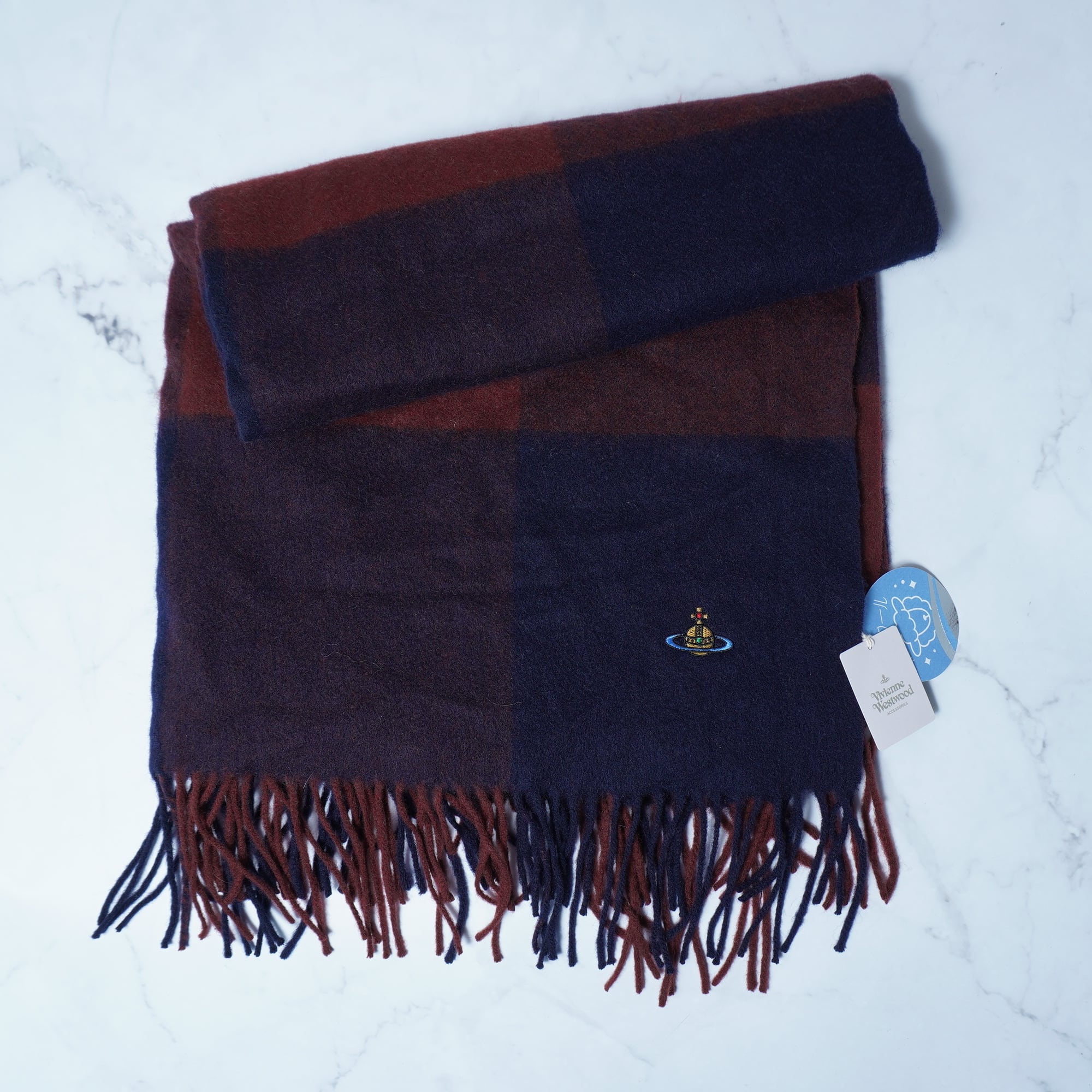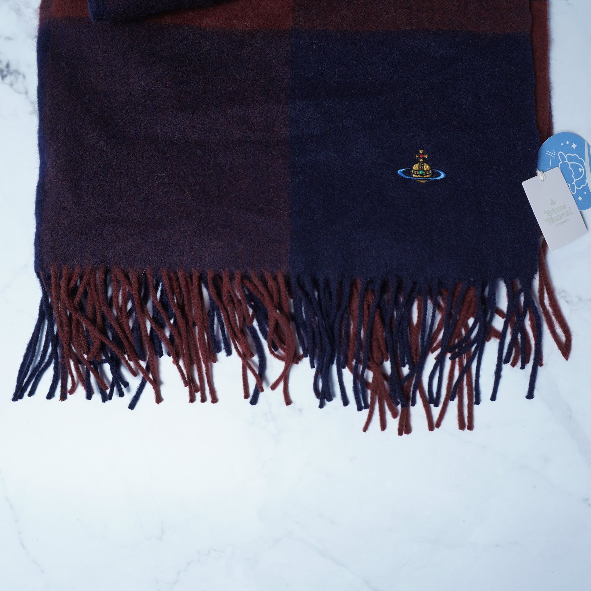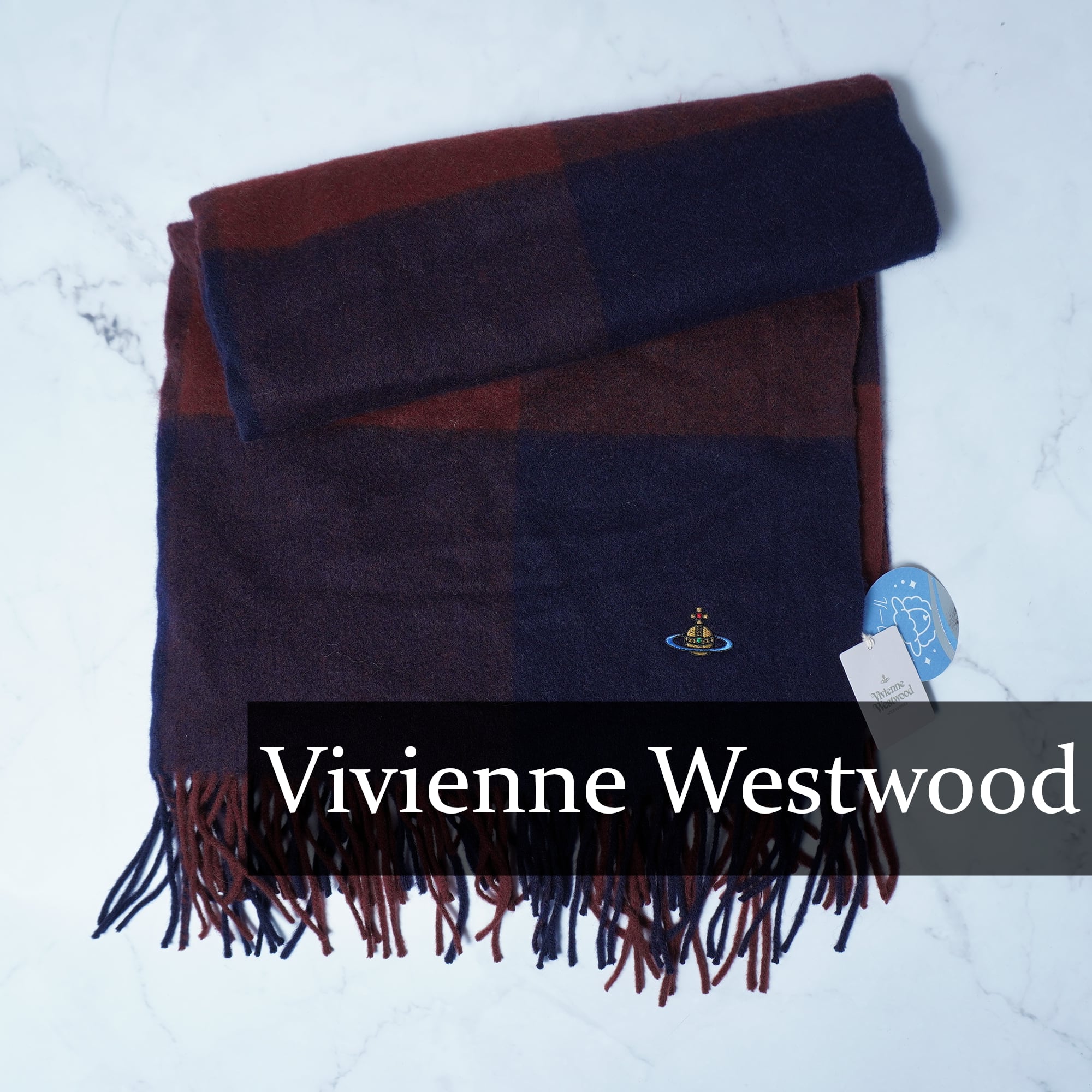 【Vivienne Westwood】ヴィヴィアンウエストウッド ”オーブロゴ刺繍” タグ付WOOL100%チェック柄ショールマフラー navy&brown