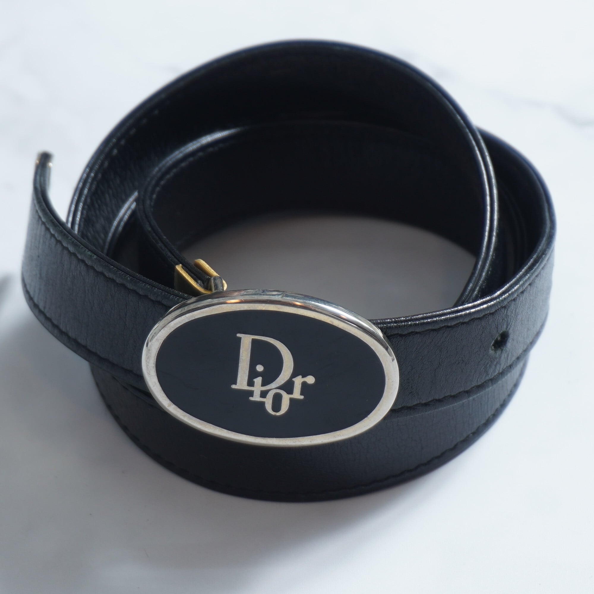 【Christian Dior】vintage フランス製”Dior”ロゴプレートナローカーフレザーベルト65 Black