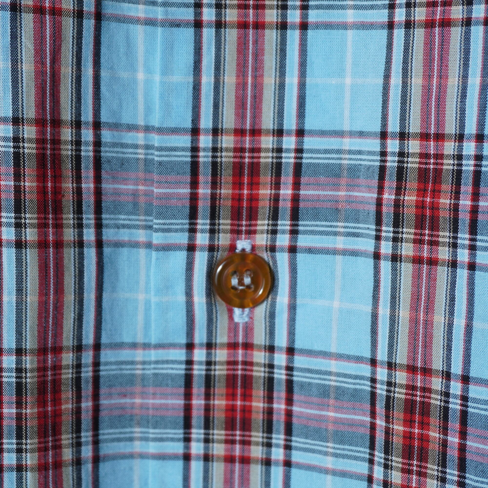 ・青と赤のチェック柄が、ファッションに遊び心をプラス