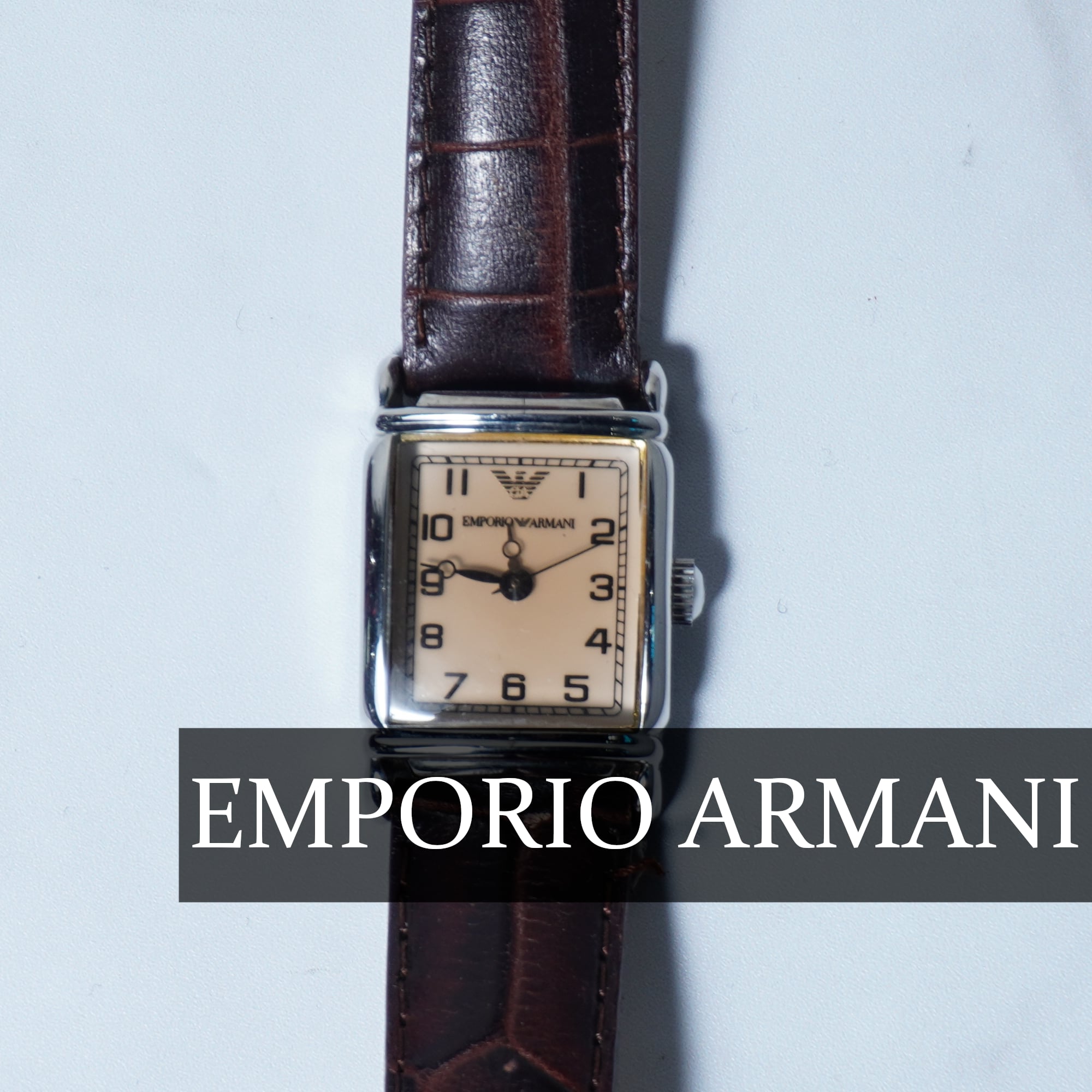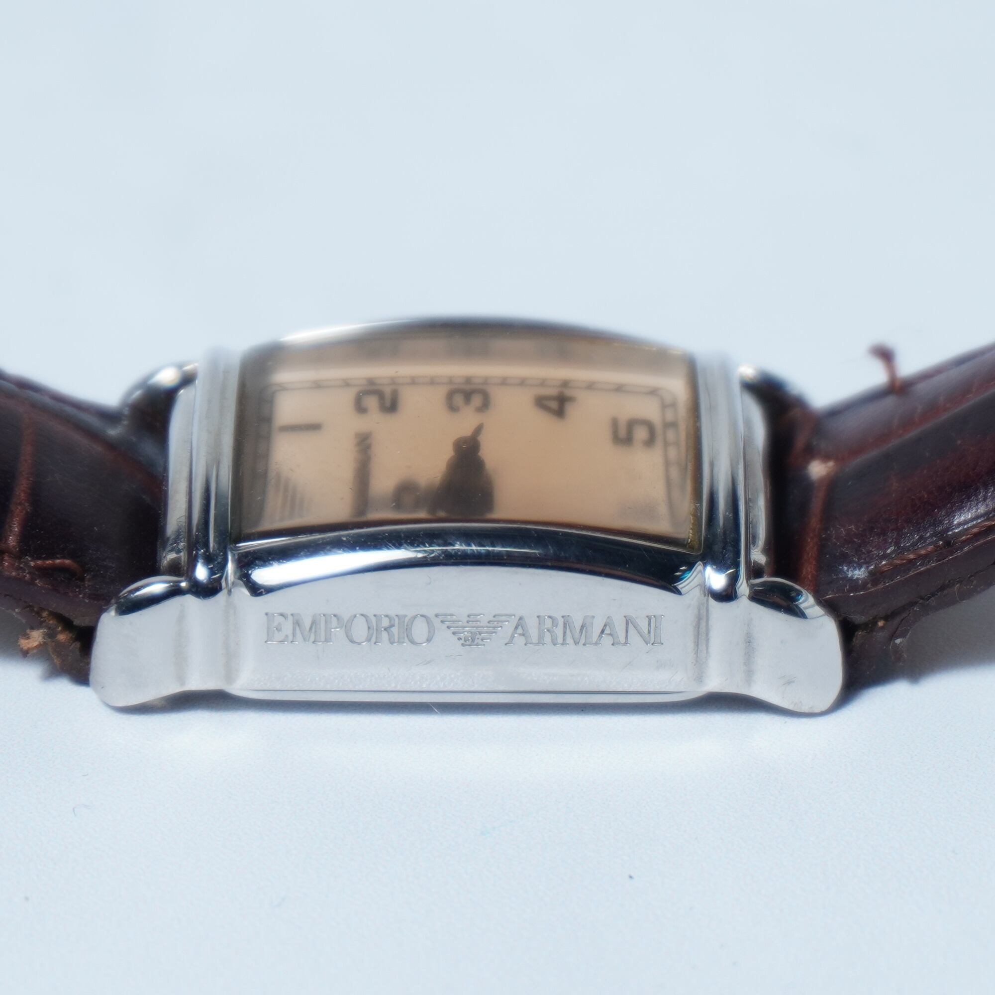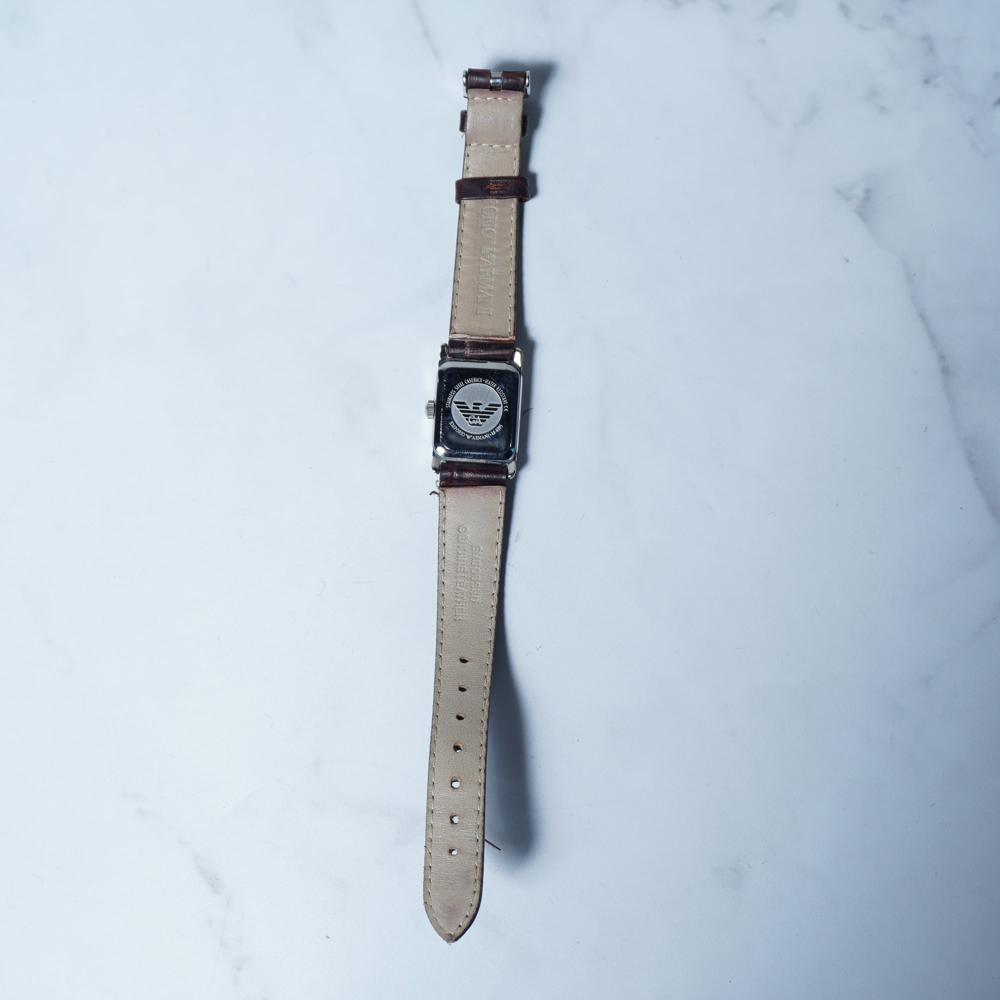 【EMPORIO ARMANI】エンポリオアルマーニ ロゴ入 稼働品レザーハンドスクエアクォーツウォッチ silver&brown