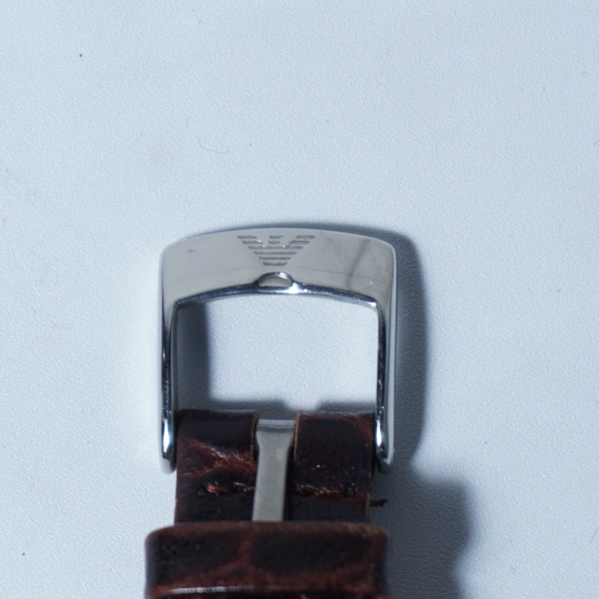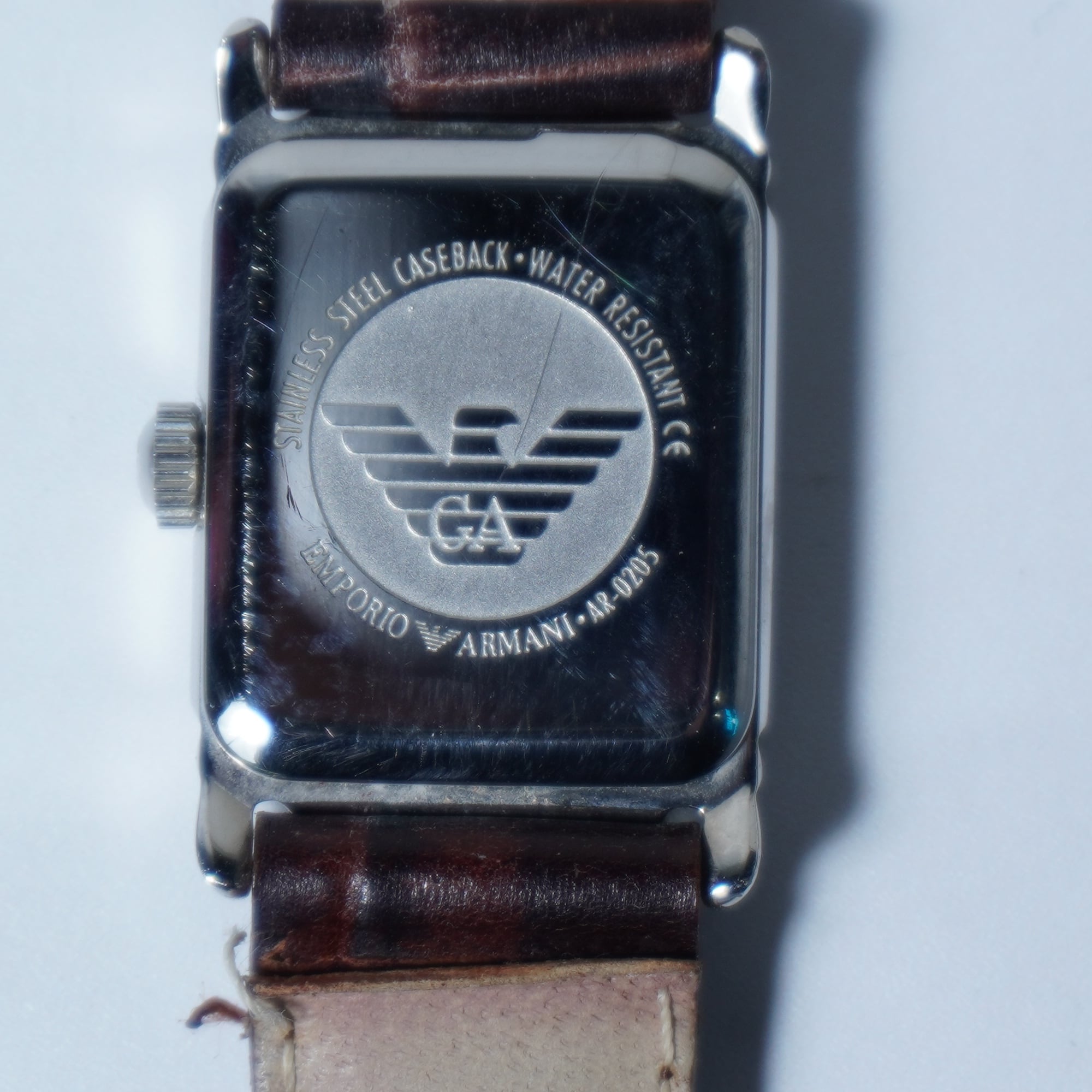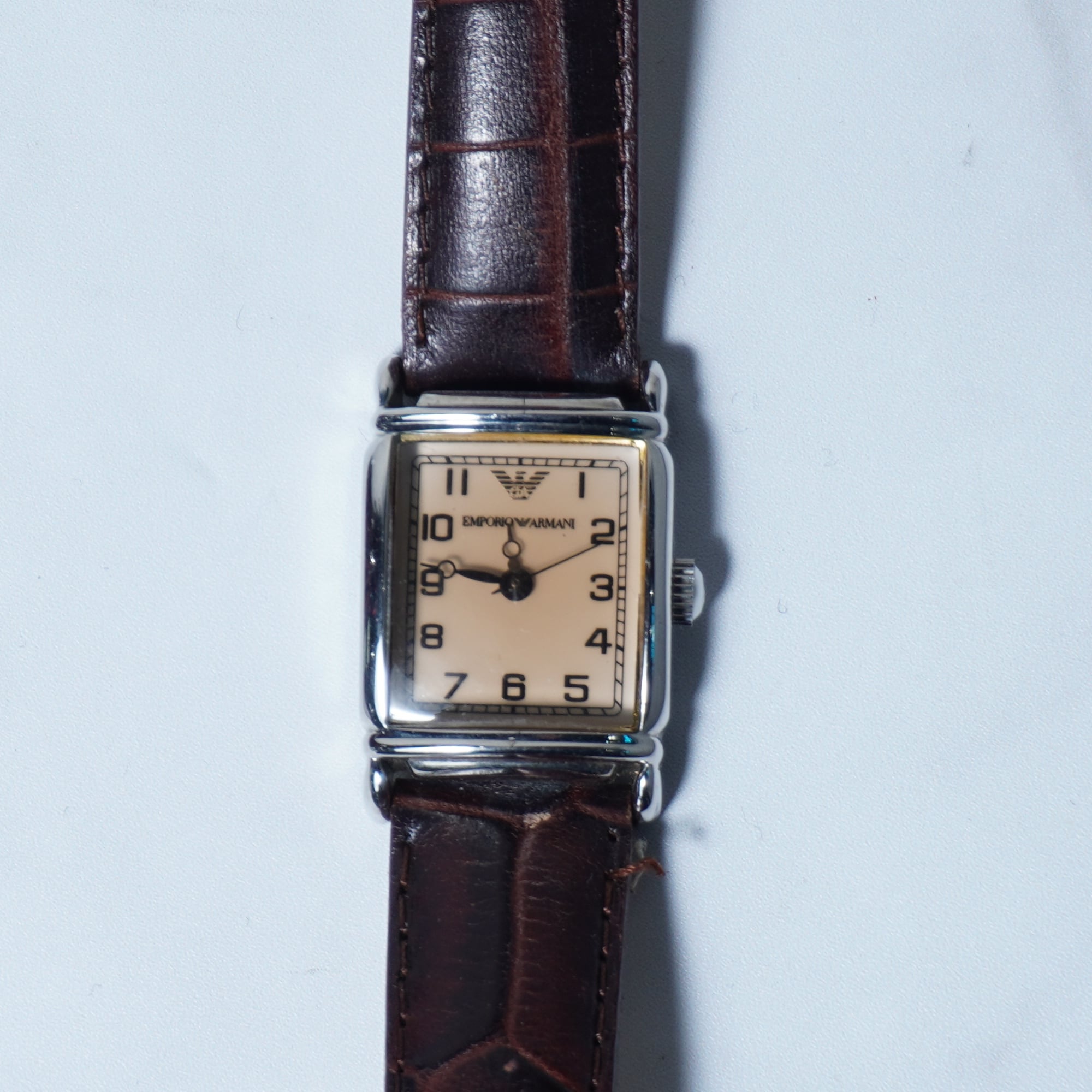 【EMPORIO ARMANI】エンポリオアルマーニ ロゴ入 稼働品レザーハンドスクエアクォーツウォッチ silver&brown