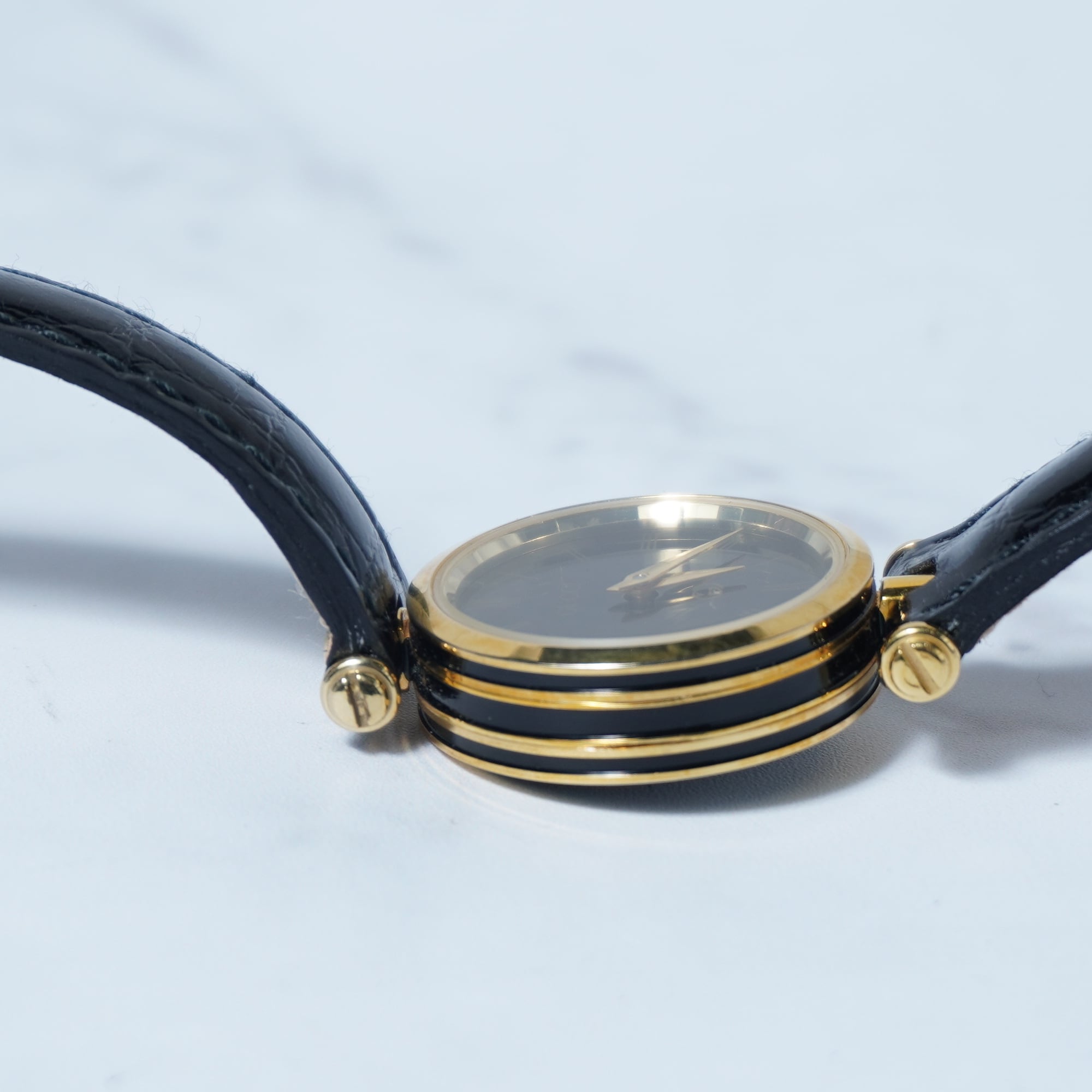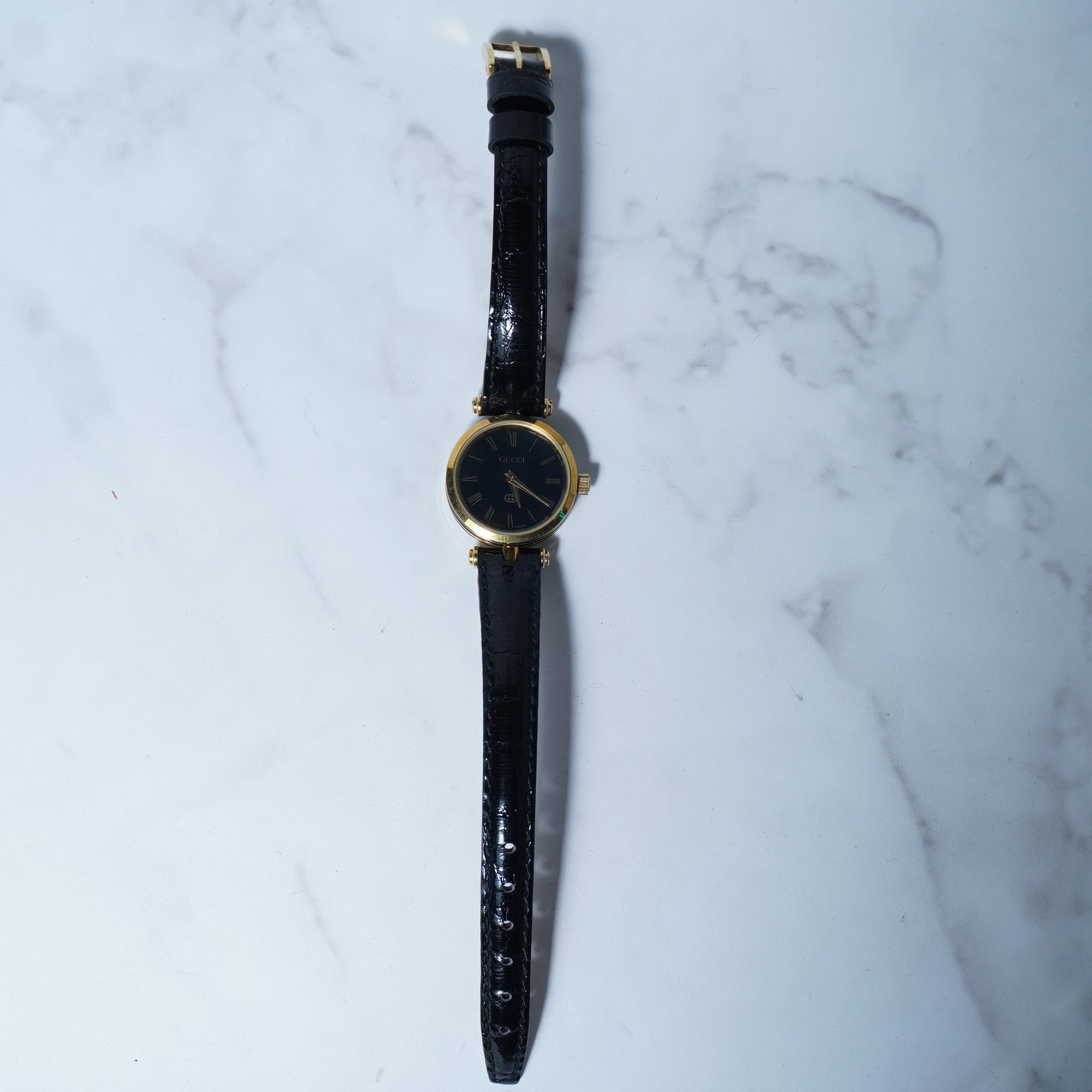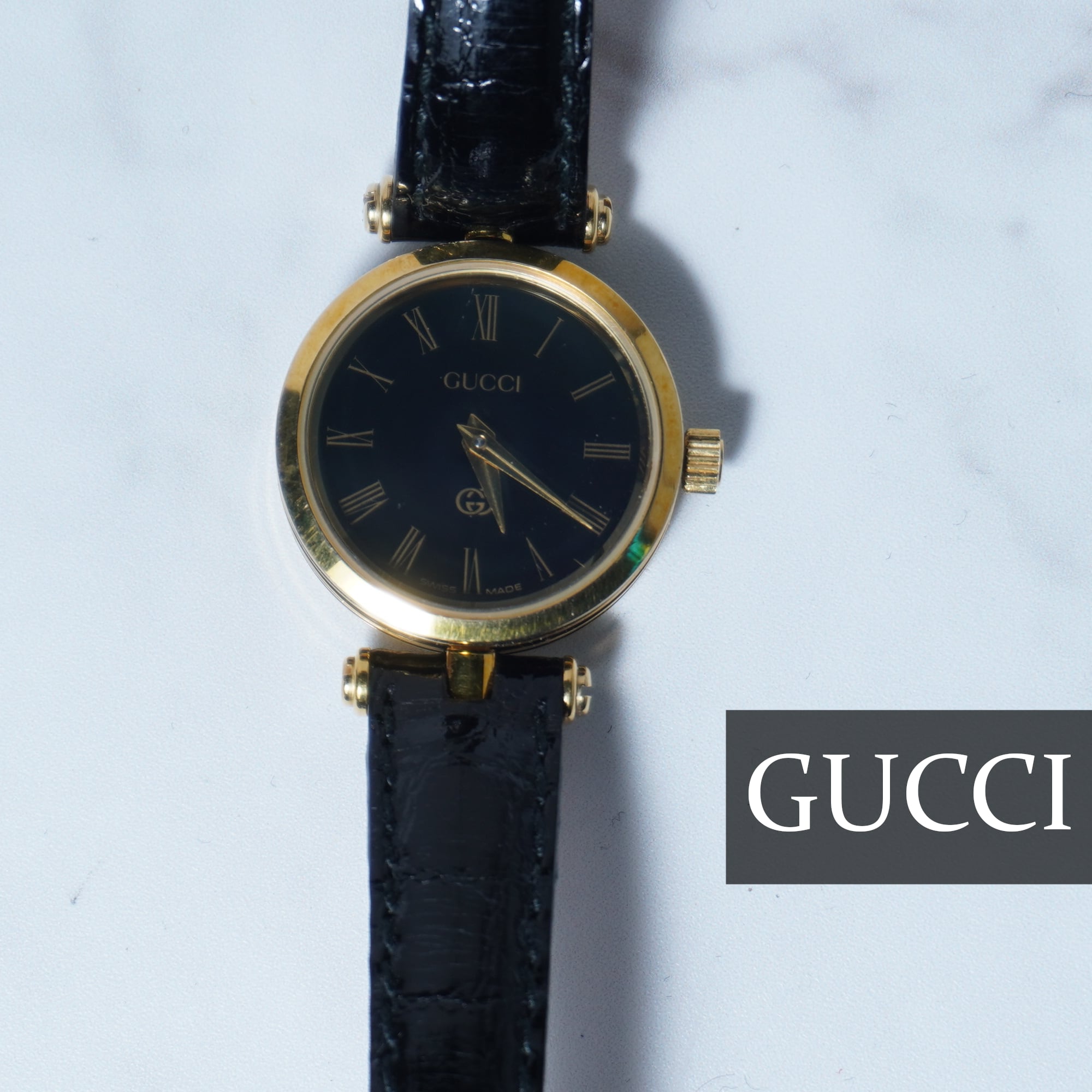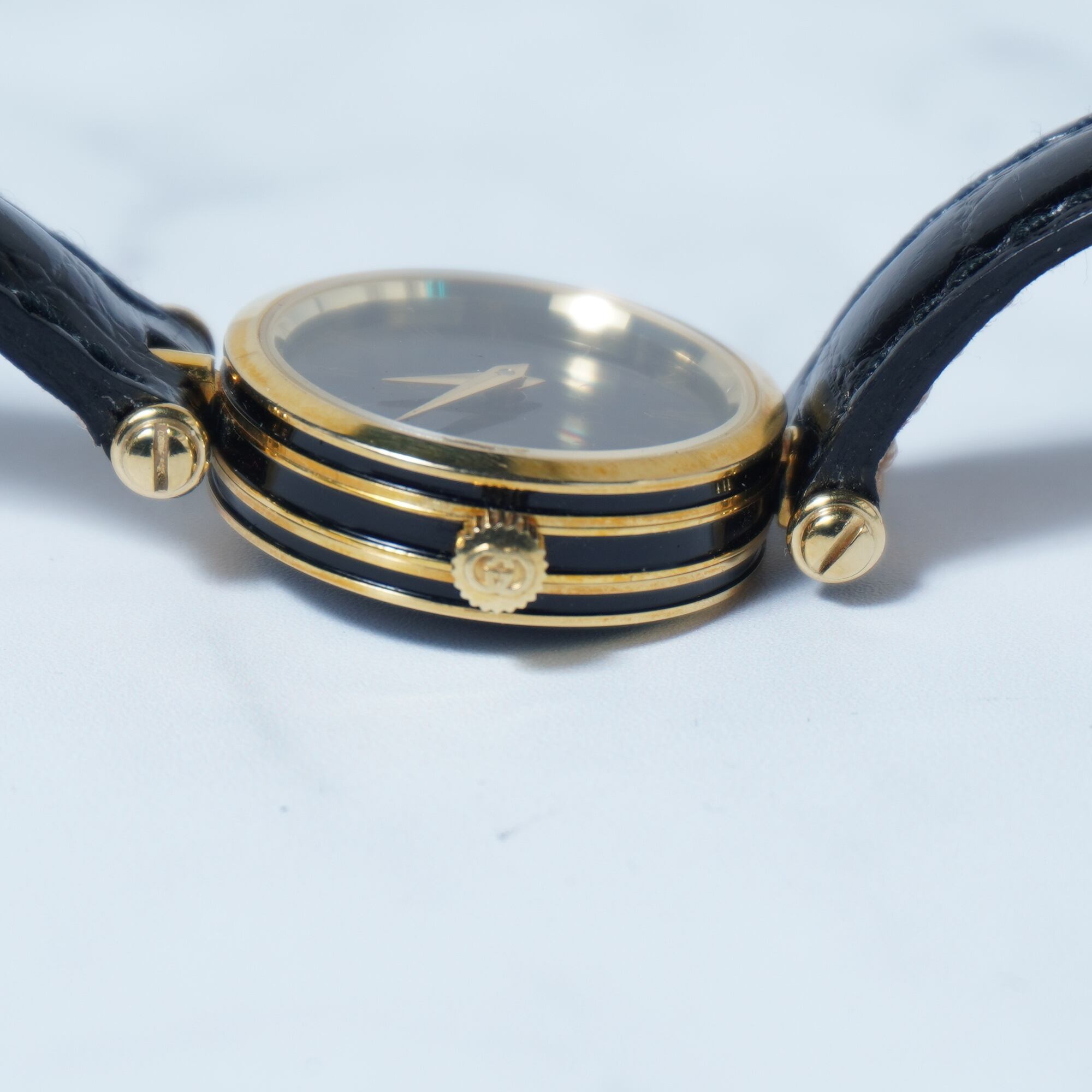 【GUCCI】グッチ”ロゴ入り”ブラックフェイスクウォーツウォッチ gold&black