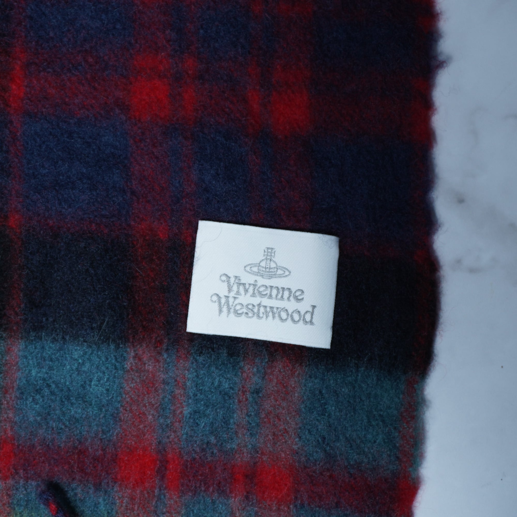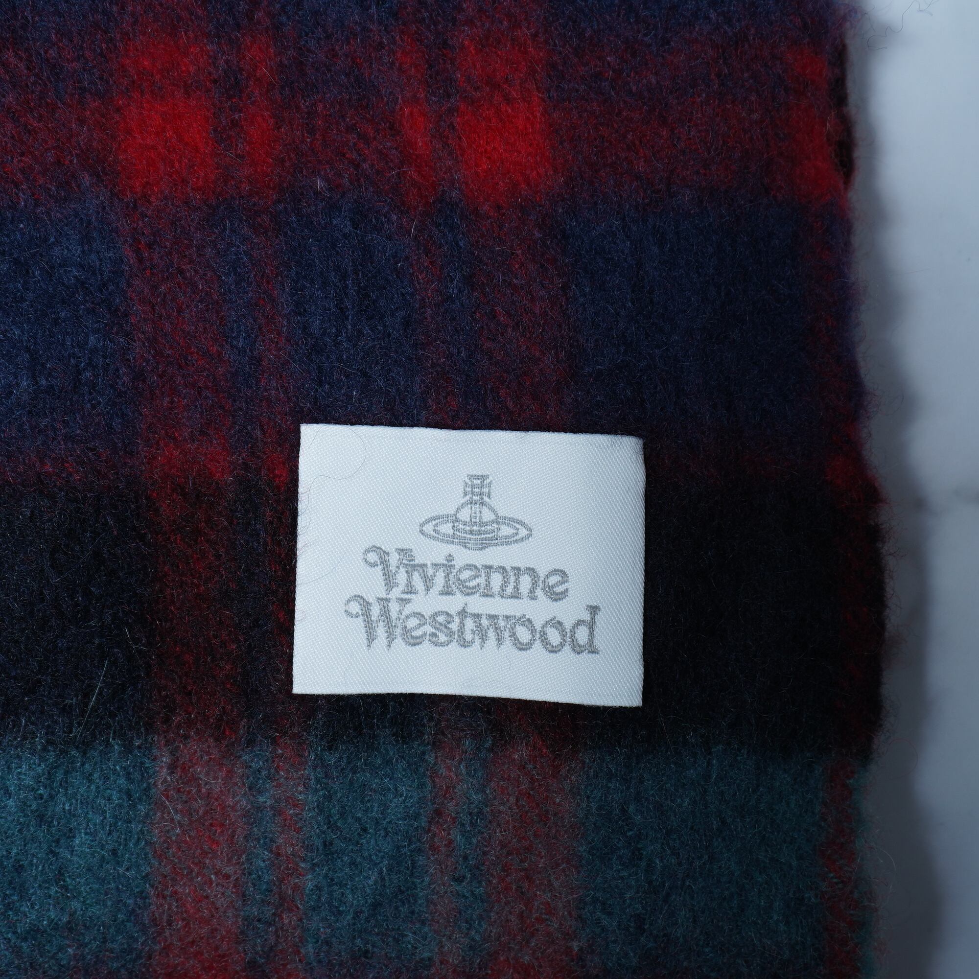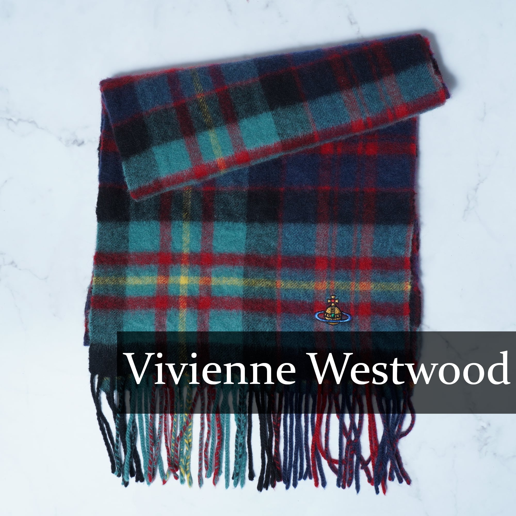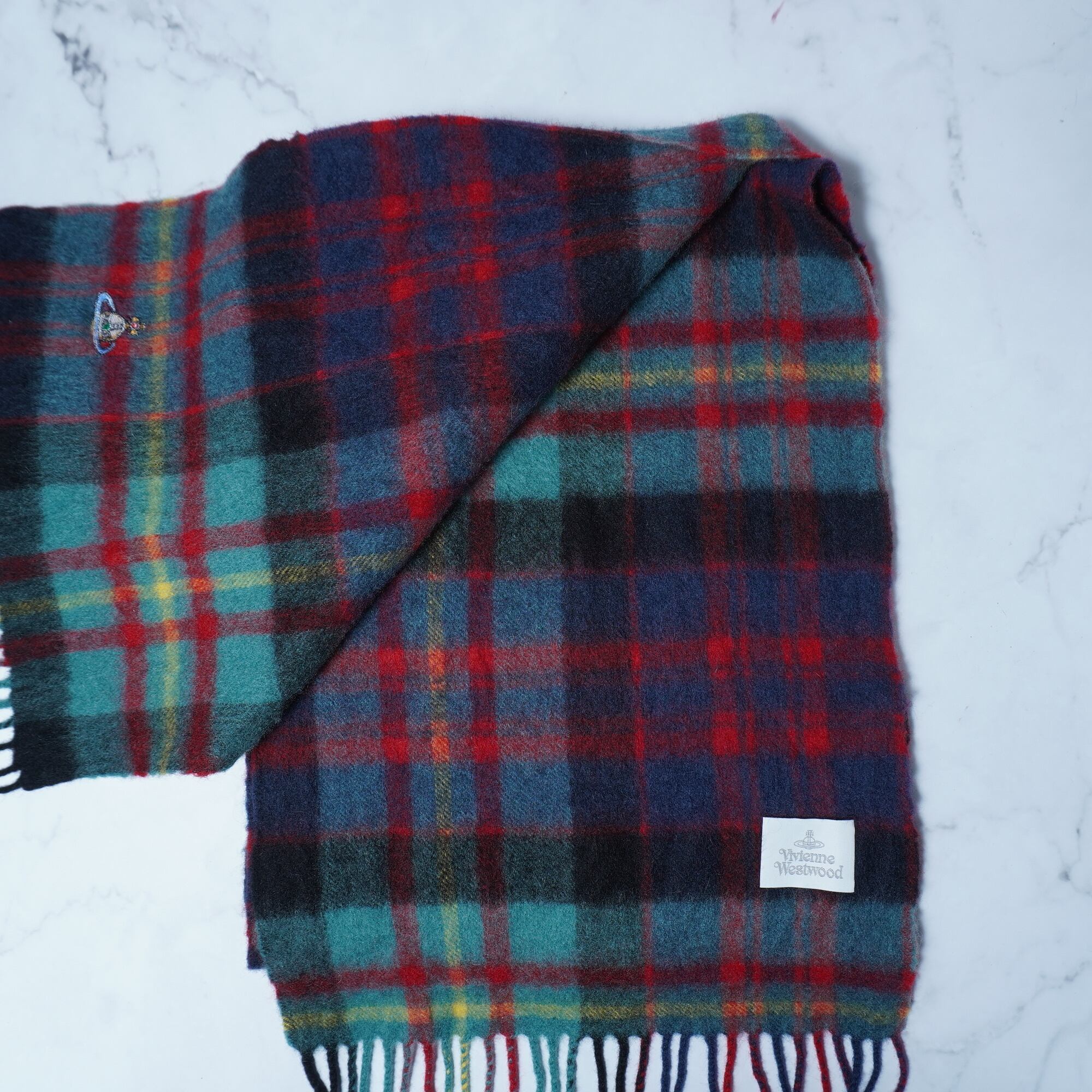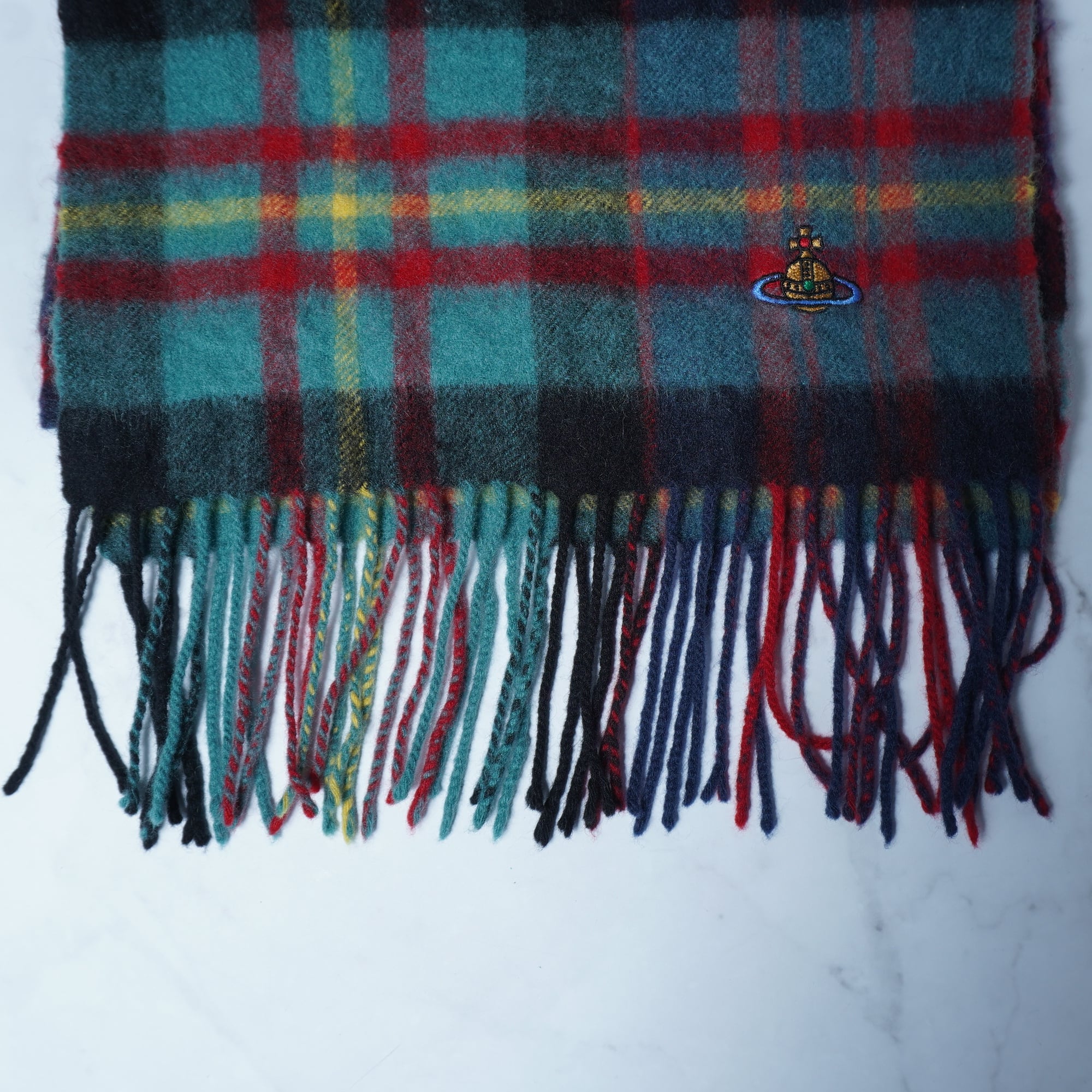 【Vivienne Westwood】ヴィヴィアンウエストウッド "オーブロゴ刺繍" ウールフリンジマフラー green&red&navy