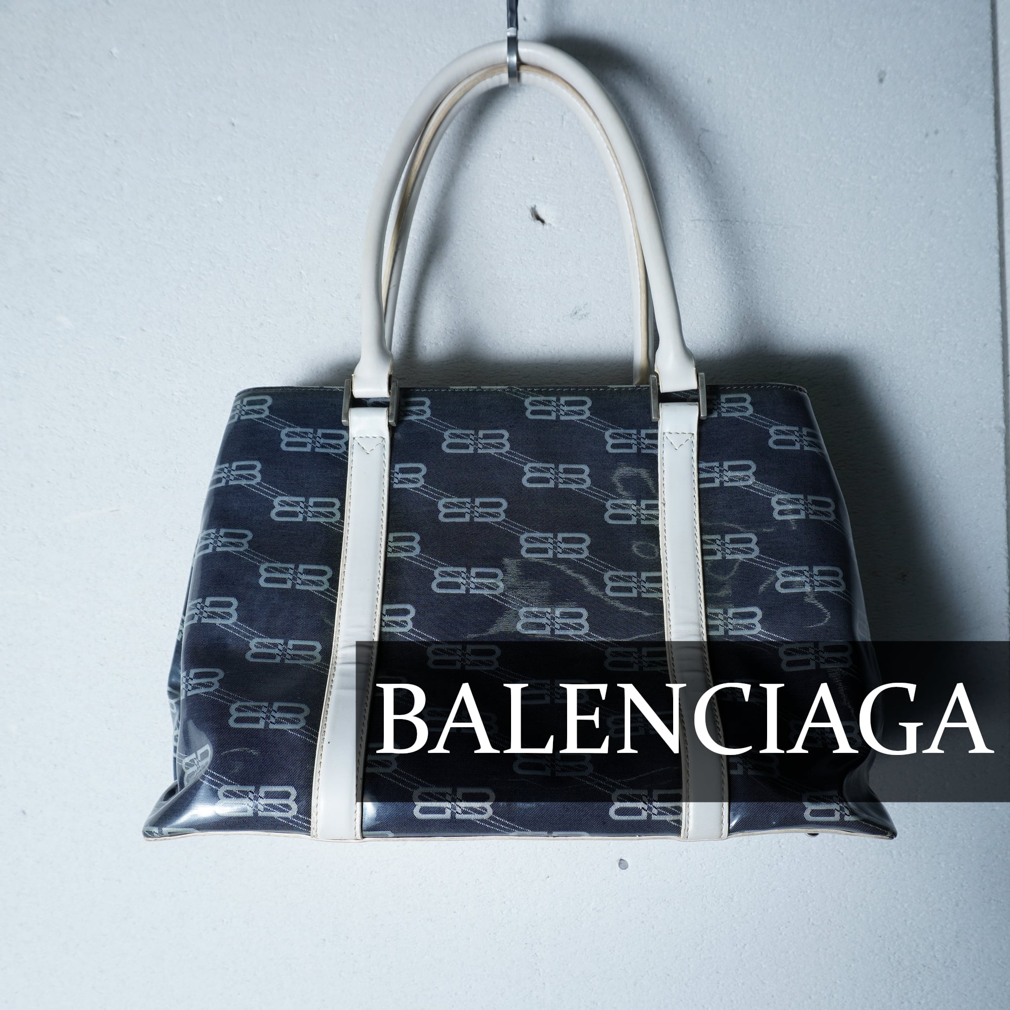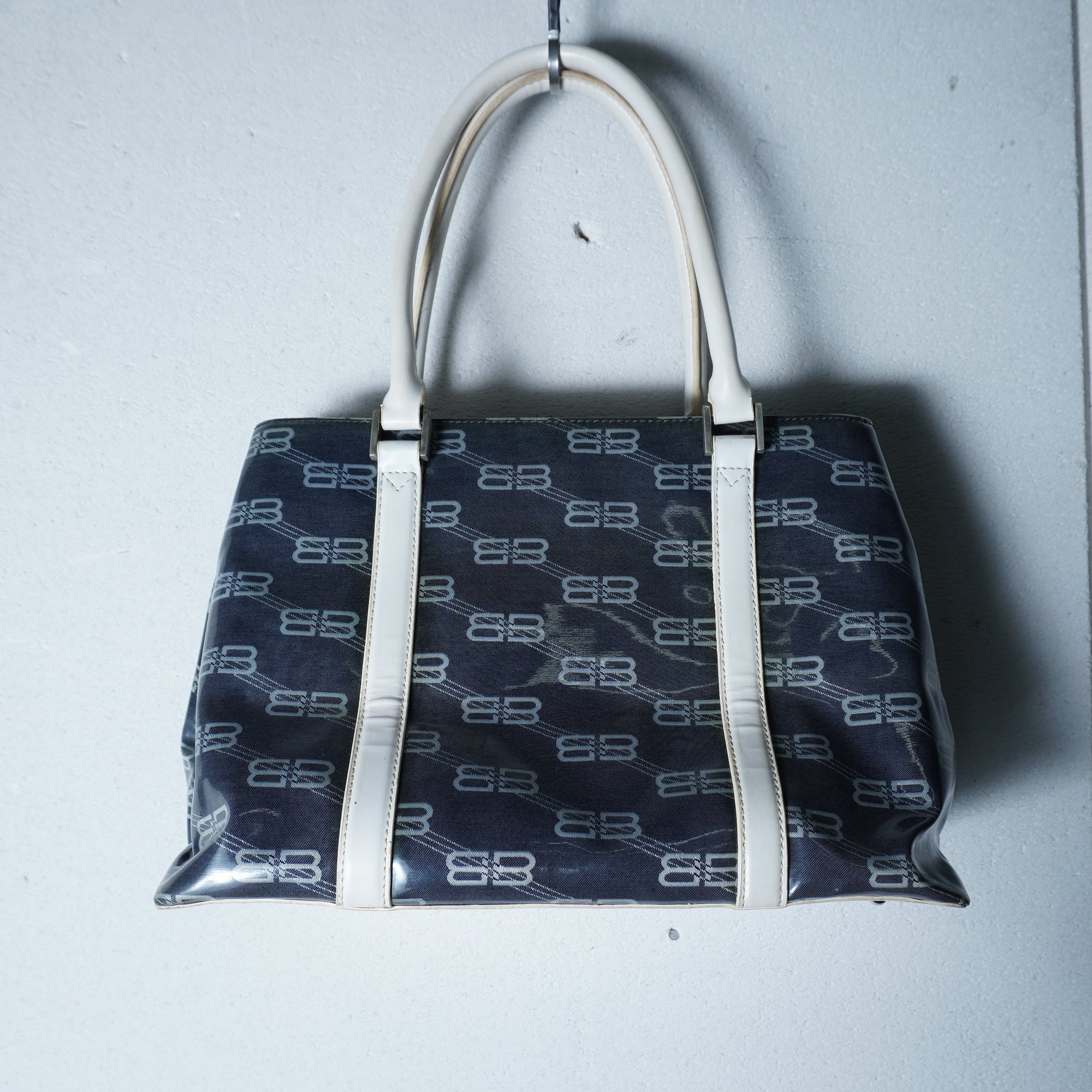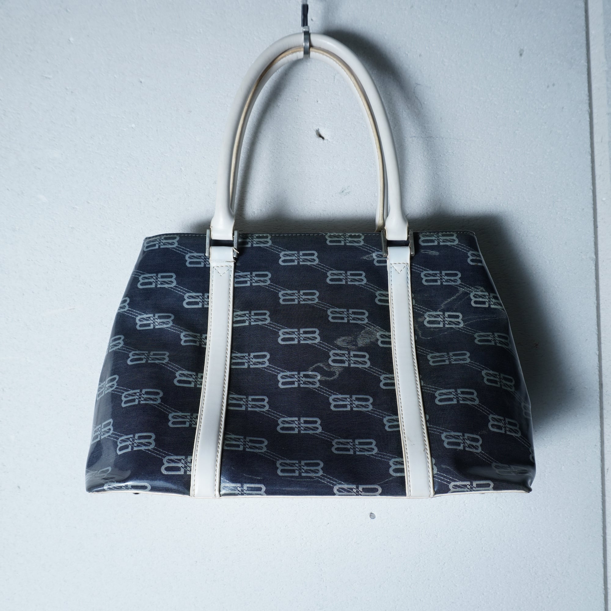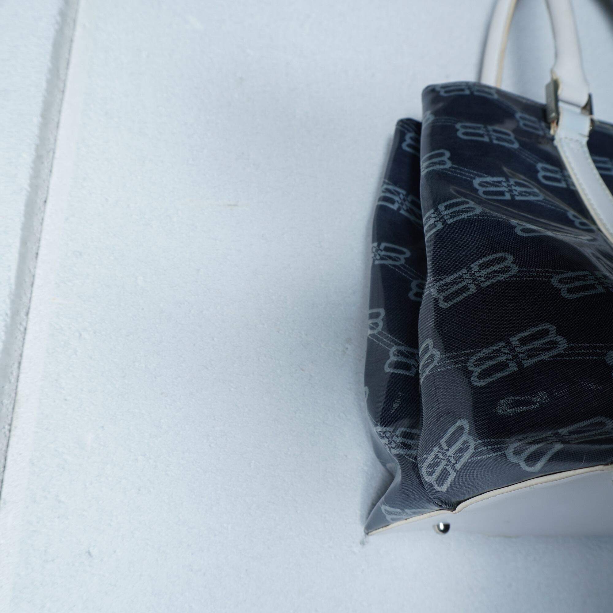 【BALENCIAGA】バレンシアガ BBロゴ ライセンス品 PVCコーティングキャンバス・レザーハンドバッグ navy&white