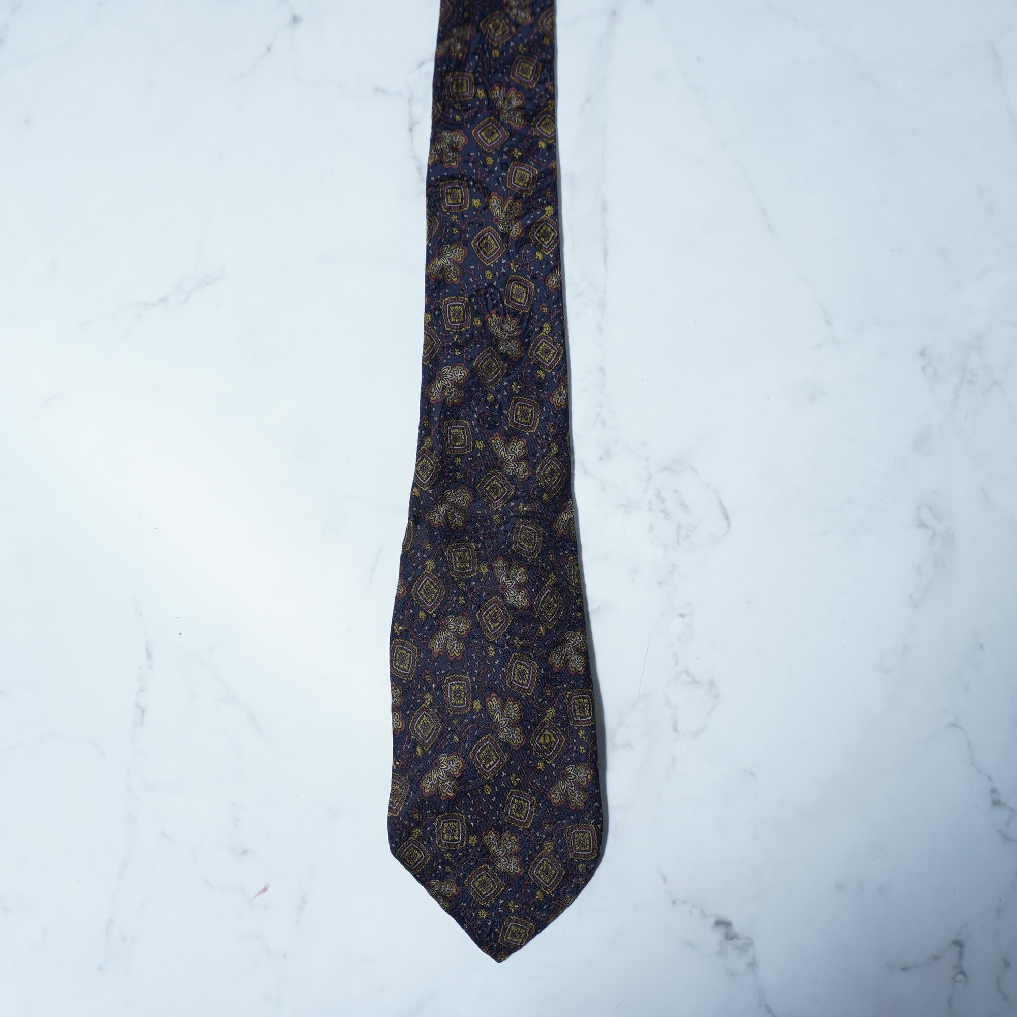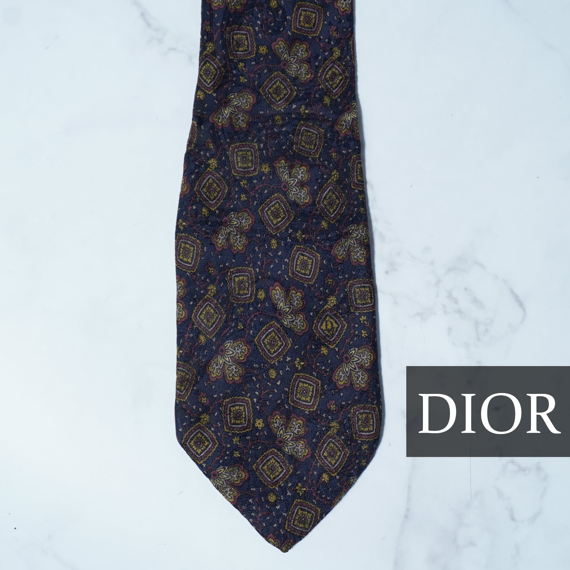 【Christian Dior】クリスチャンディオール SILK100%幾何学模様ネクタイ navy&yellow
