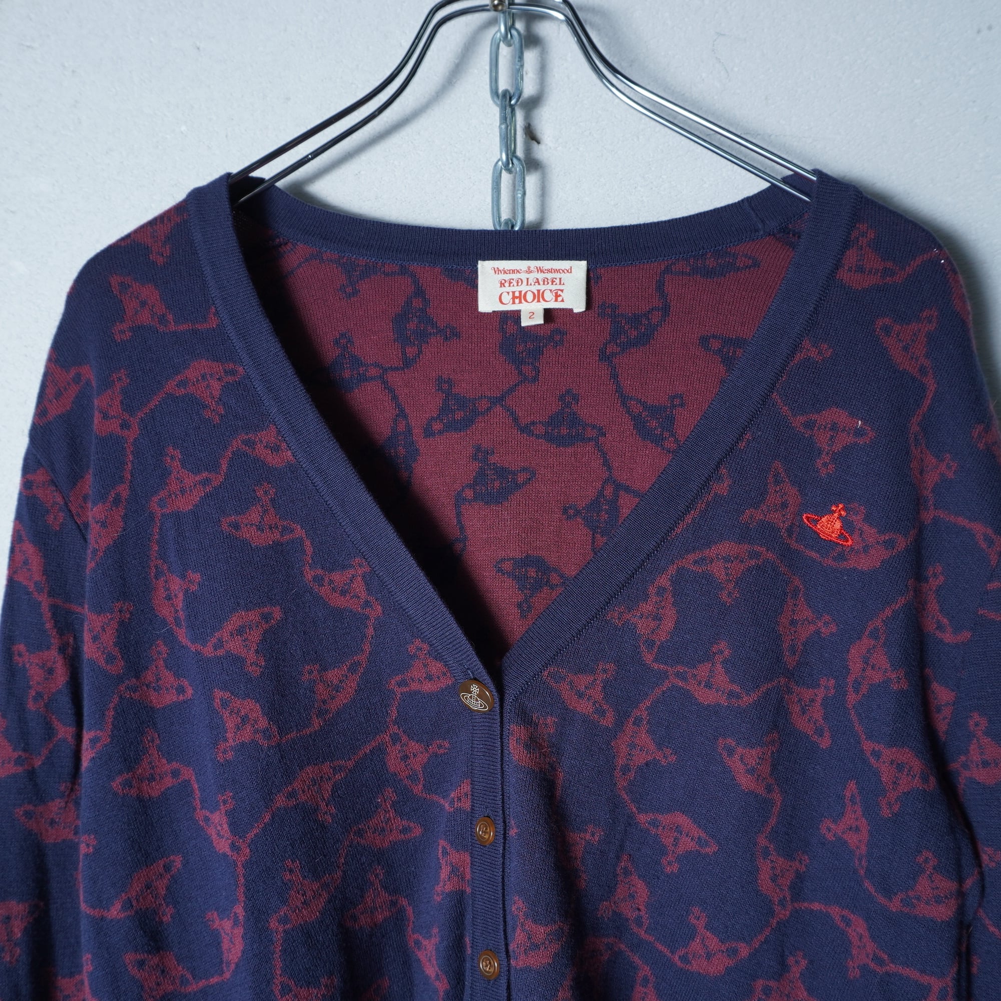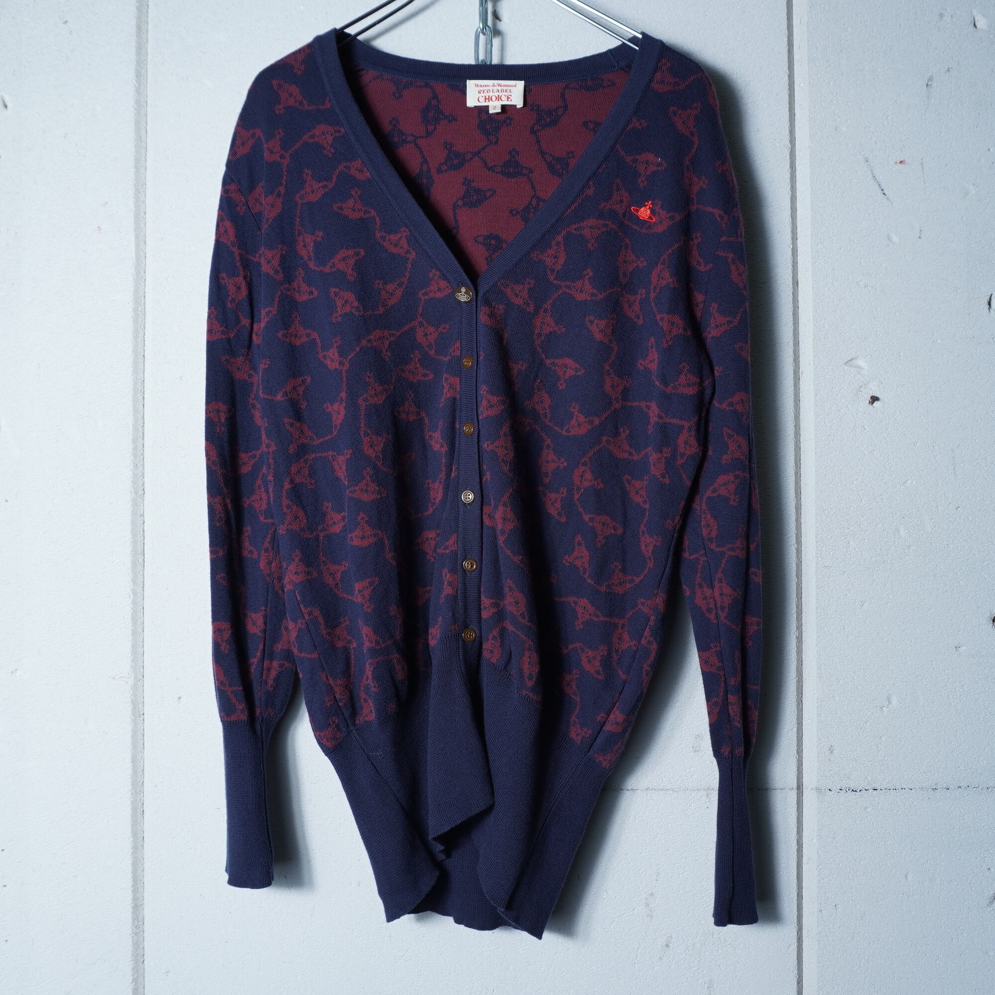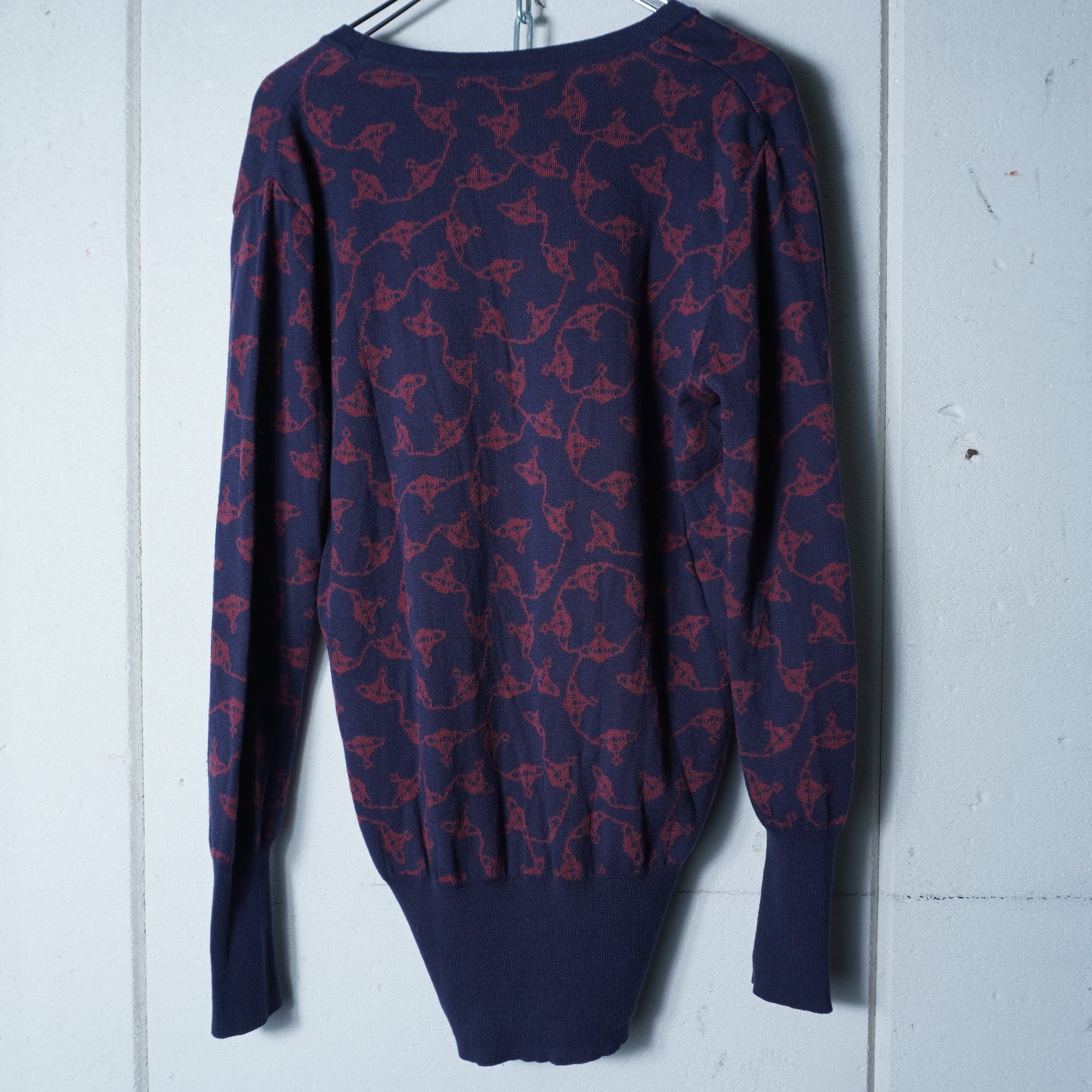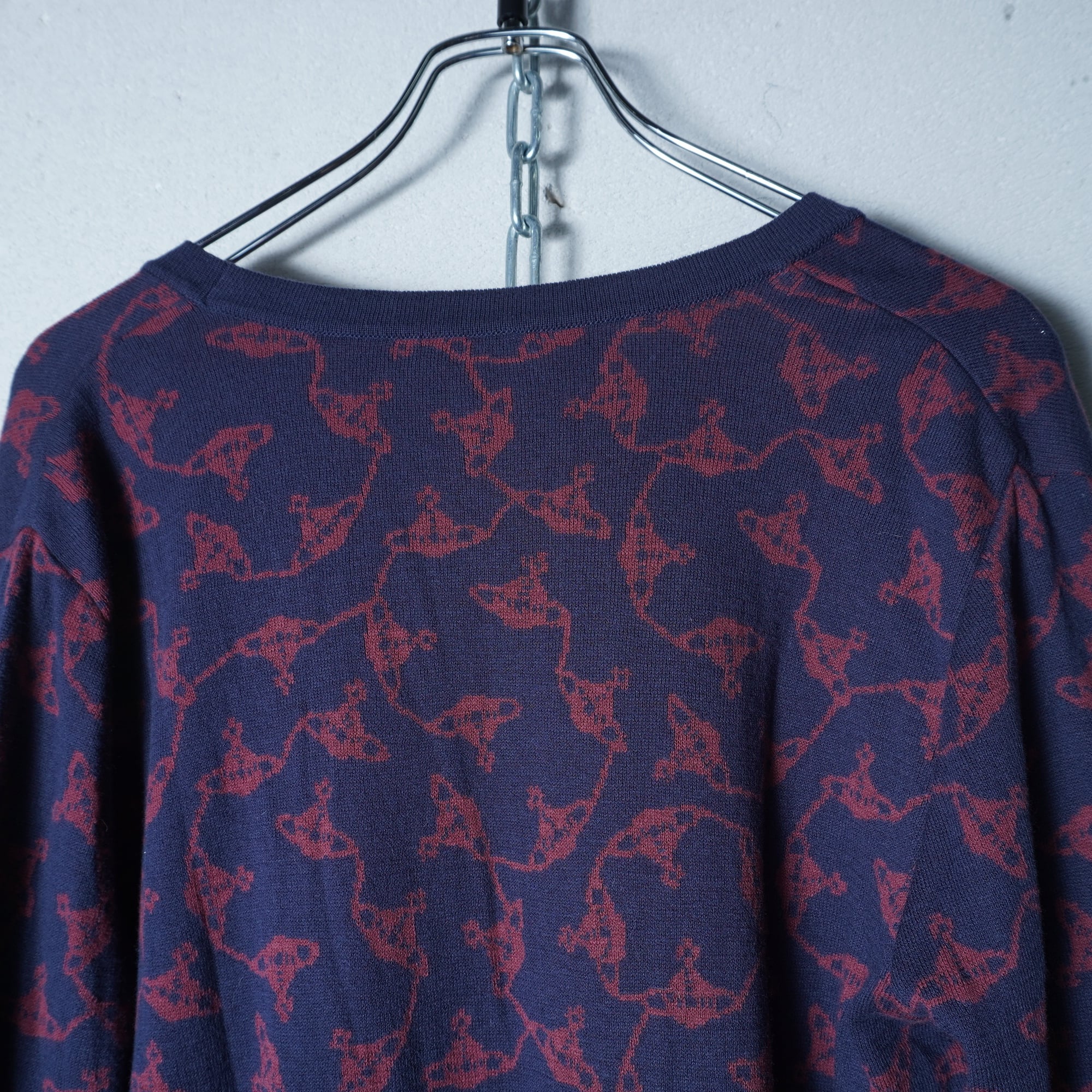 【Vivienne Westwood】ヴィヴィアンウエストウッド オーブロゴ刺繍・オーブ総柄カーディガン navy&wine red