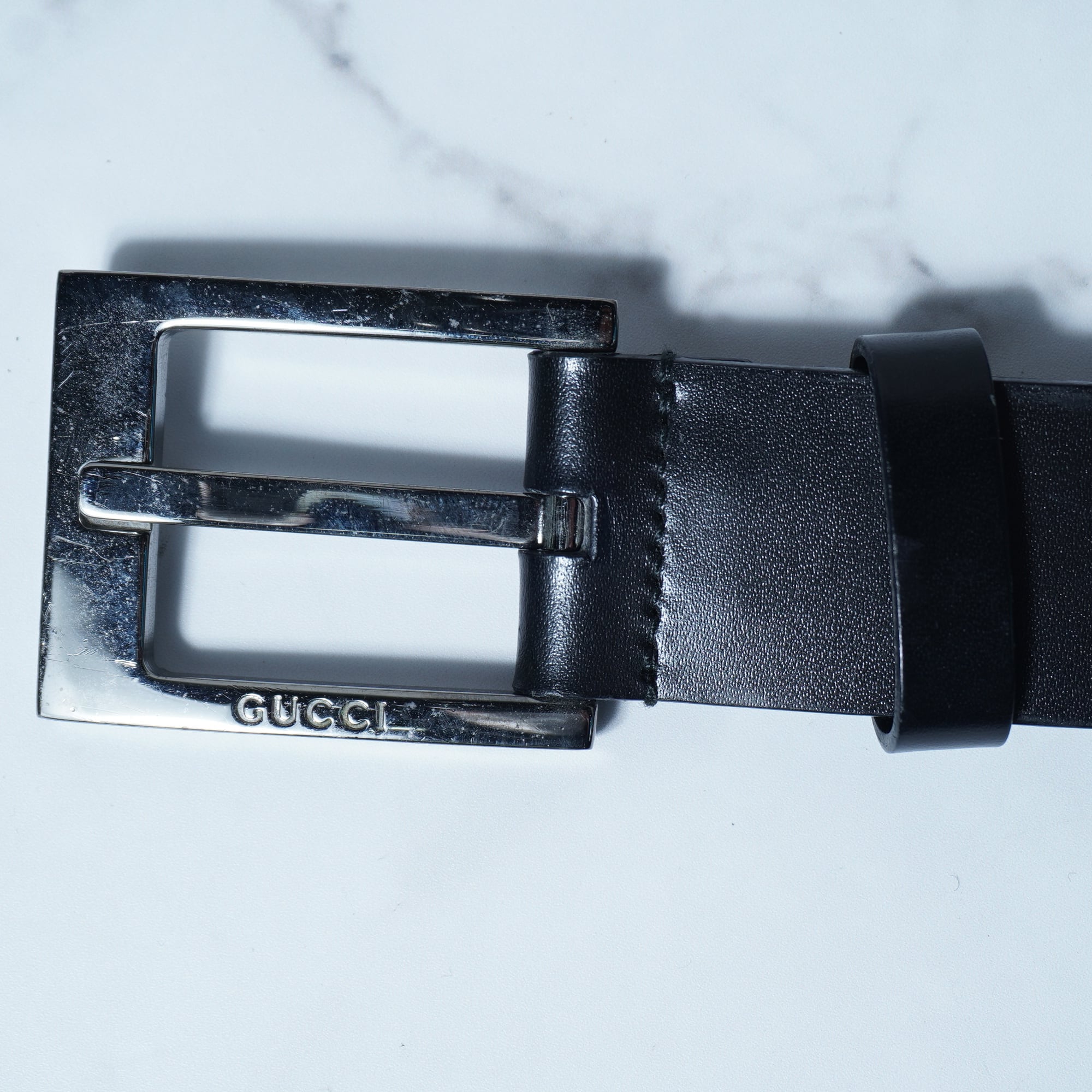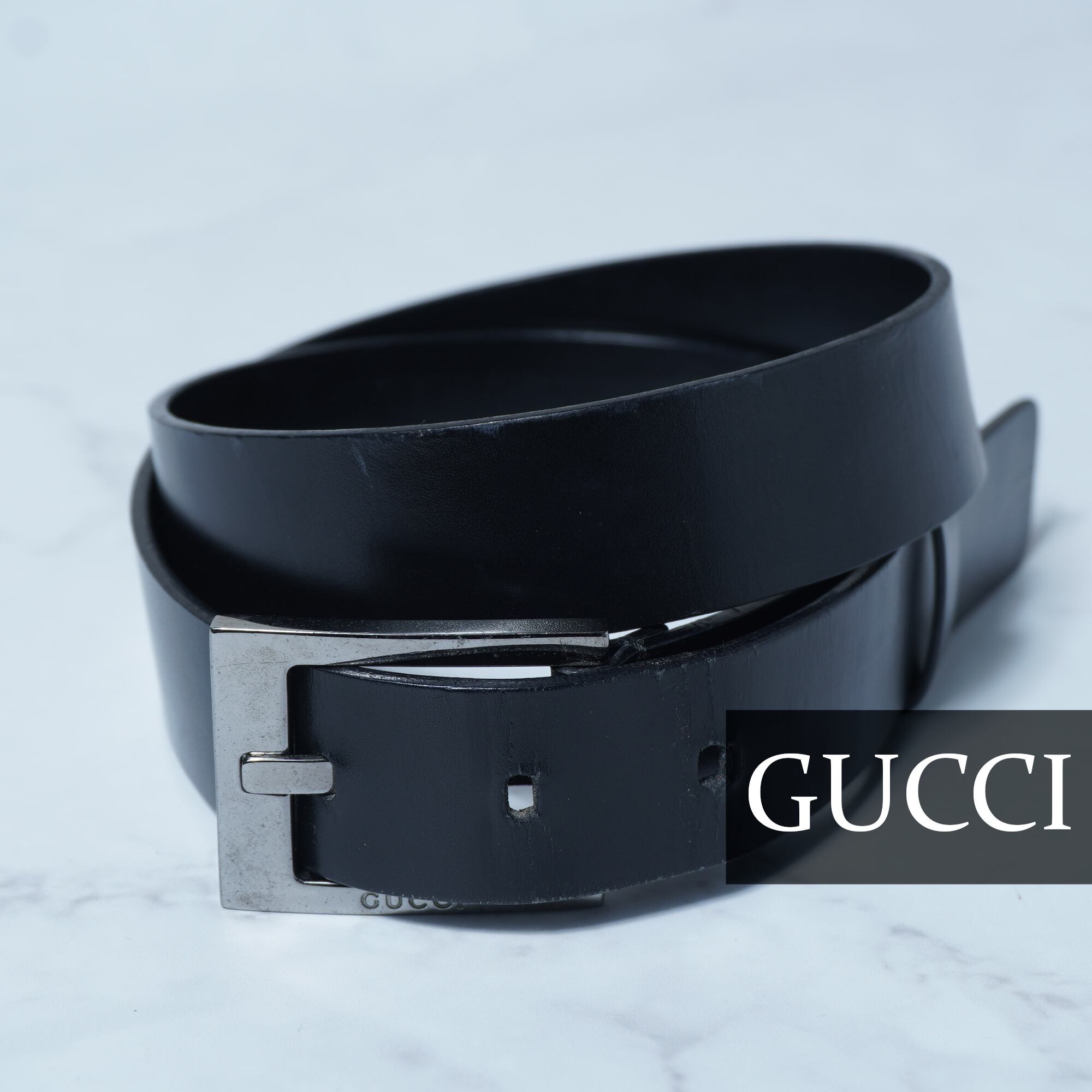 【GUCCI】グッチ "ロゴ入" シルバーバックルレザーベルト black